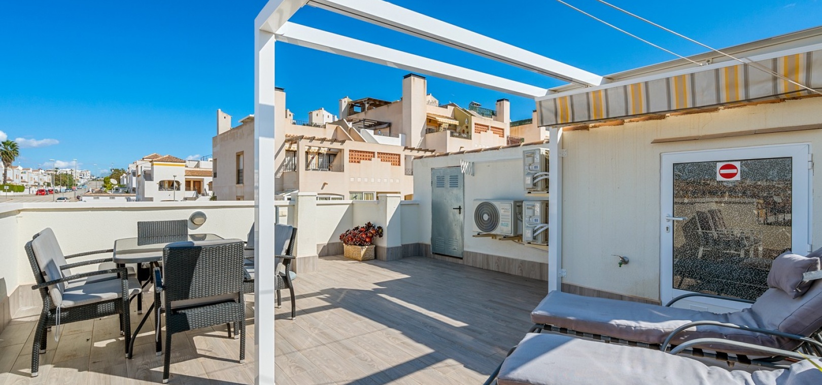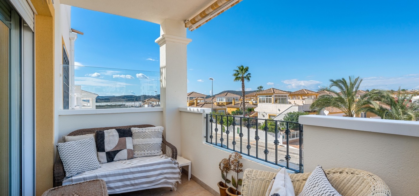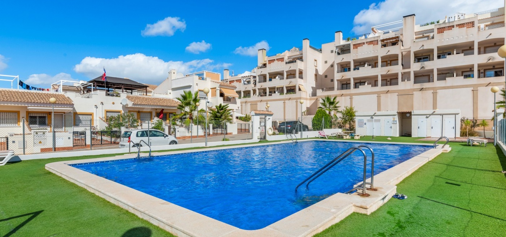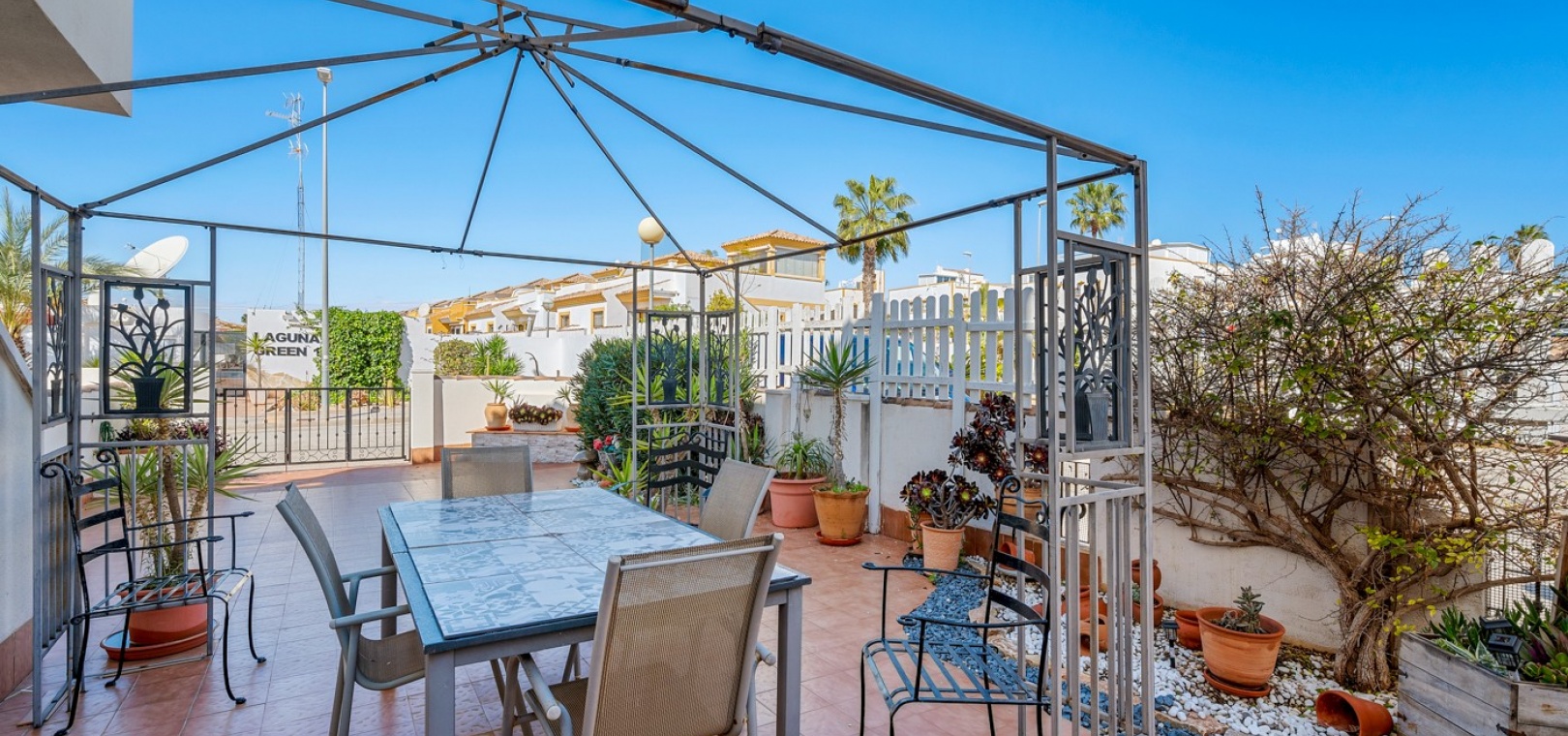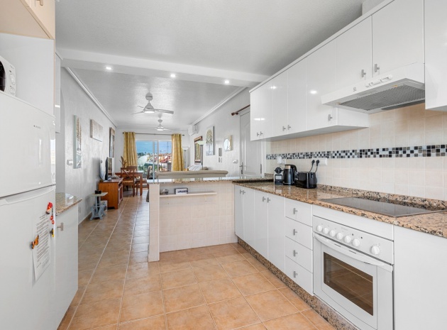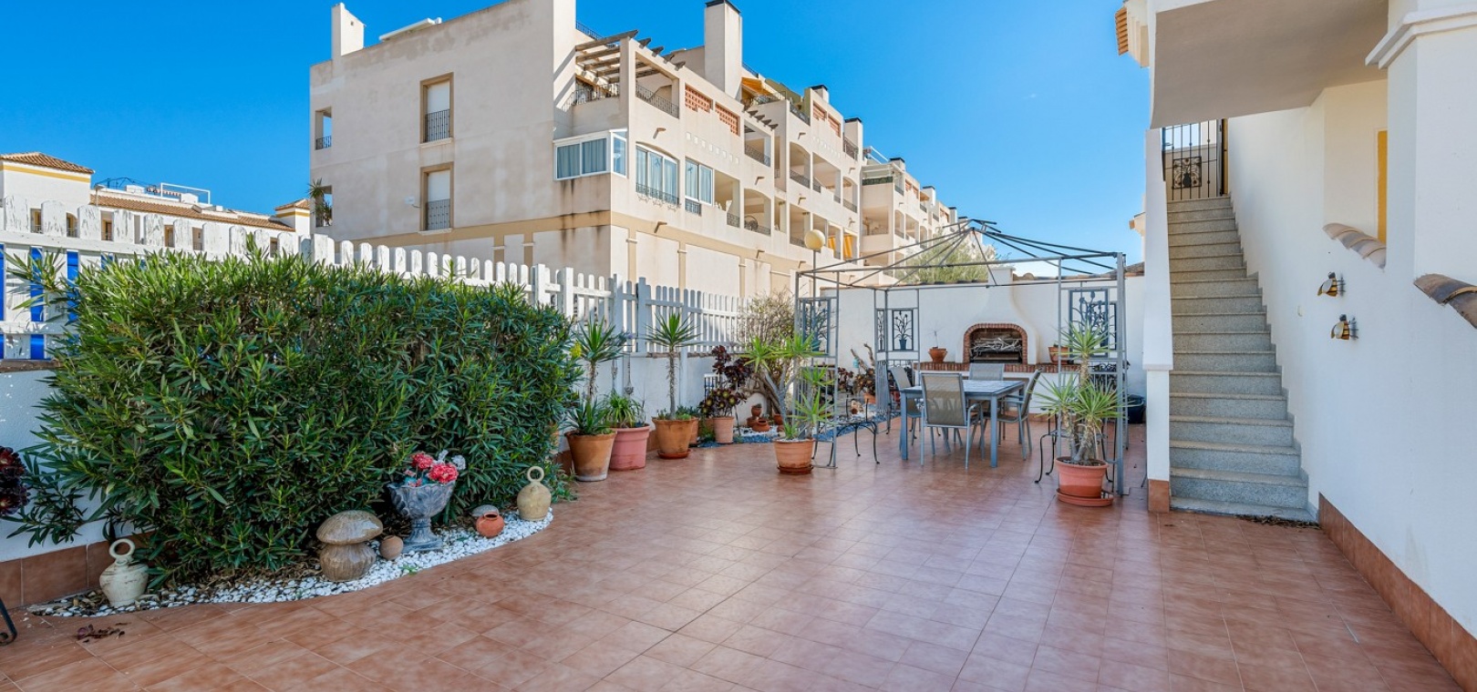 Wohn-/Esszimmer mit Klimaanlage (warm/kalt) und Deckenventilator, offene Einbauküche, separater Hauswirtschaftsraum, 2 Doppelschlafzimmer mit Einbauschränken, Klimaanlage (warm/kalt) und Deckenventilatoren, 2 neu eingebaute Duschräume, Balkon neben dem Wohnzimmer, private Dachterrasse, privater Garten und ein schöner Gemeinschaftspool.