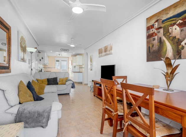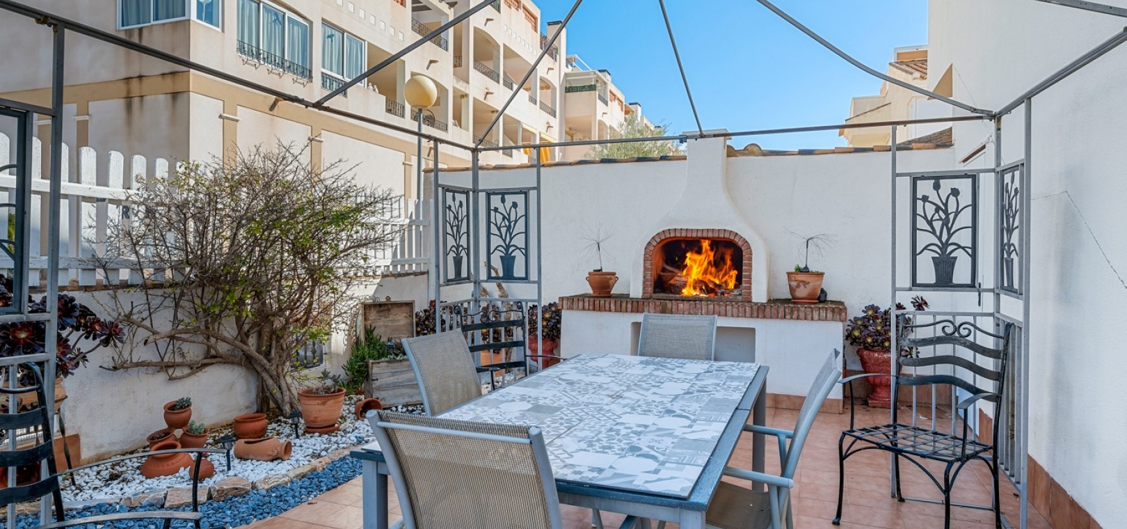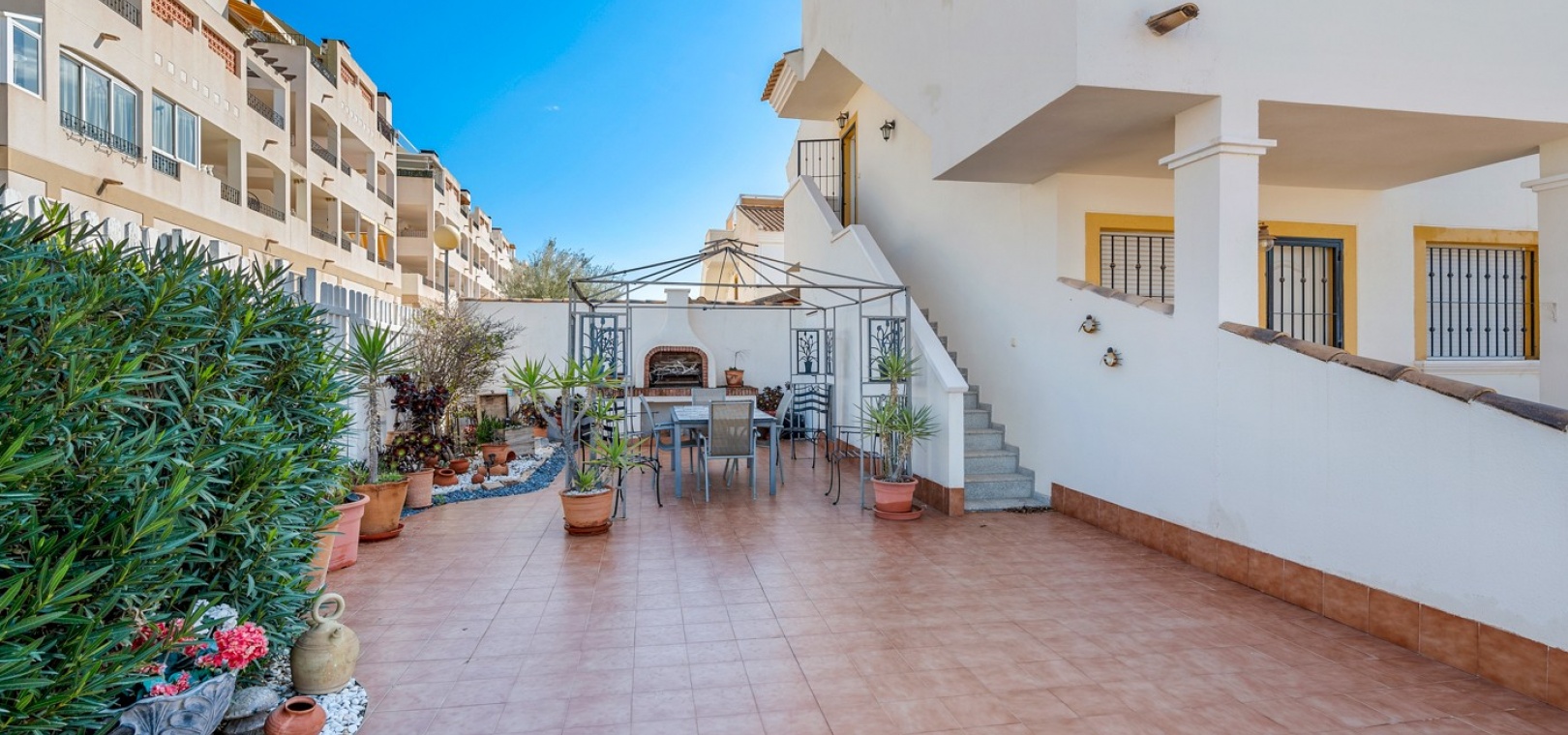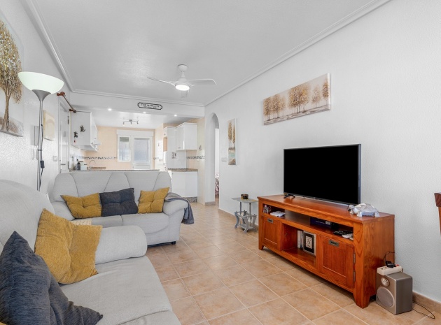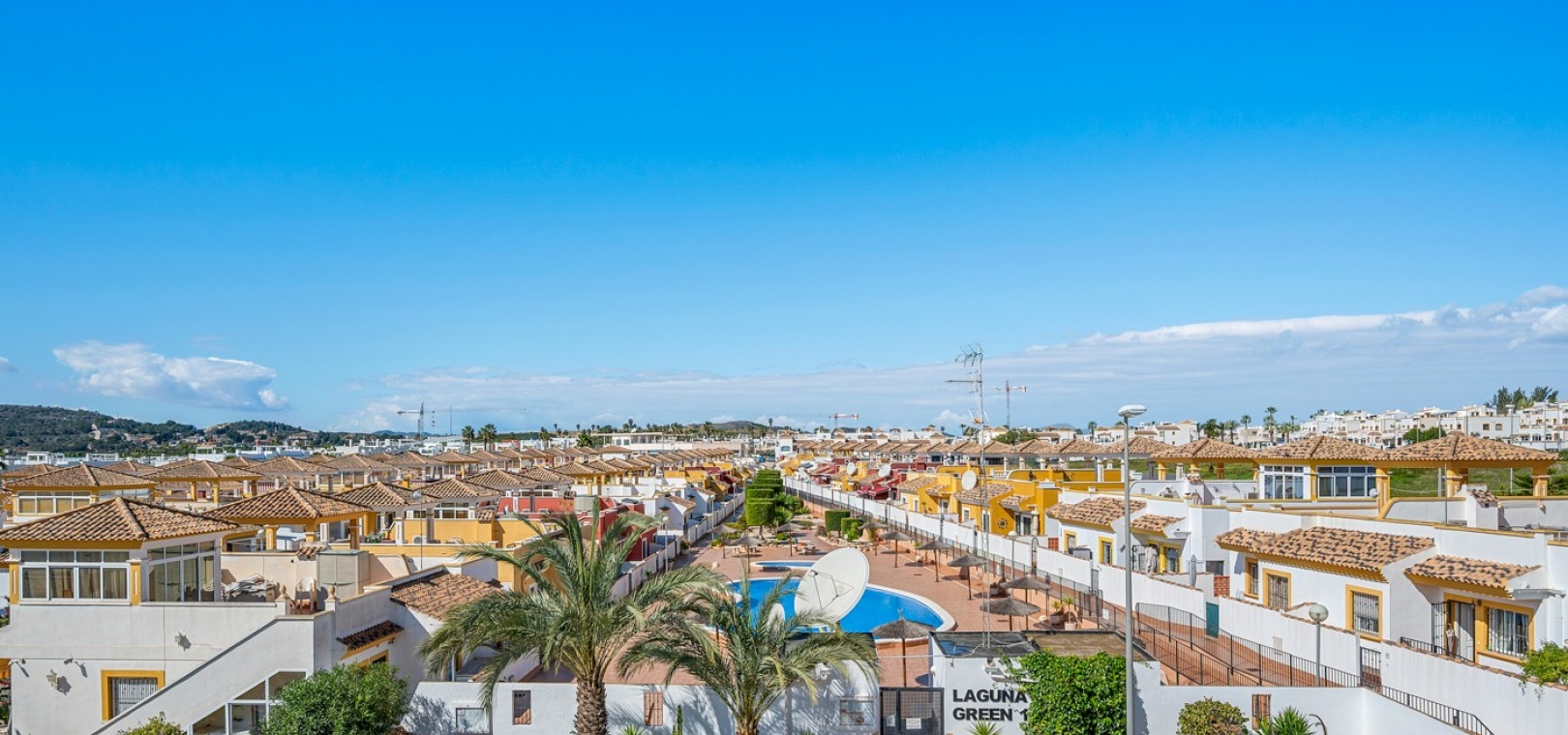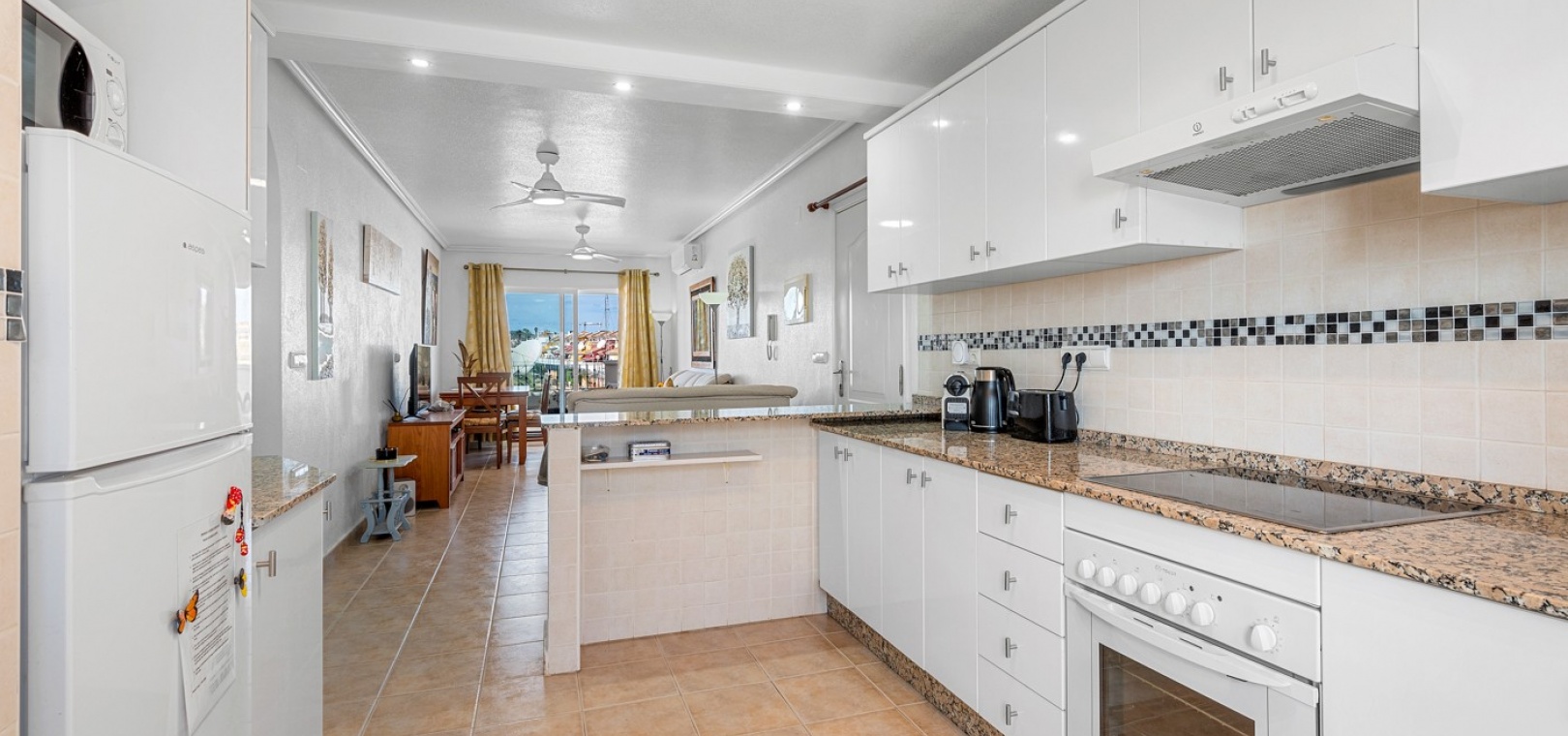 Wohn-/Esszimmer mit Klimaanlage (warm/kalt) und Deckenventilator, offene Einbauküche, separater Hauswirtschaftsraum, 2 Doppelschlafzimmer mit Einbauschränken, Klimaanlage (warm/kalt) und Deckenventilatoren, 2 neu eingebaute Duschräume, Balkon neben dem Wohnzimmer, private Dachterrasse, privater Garten und ein schöner Gemeinschaftspool.