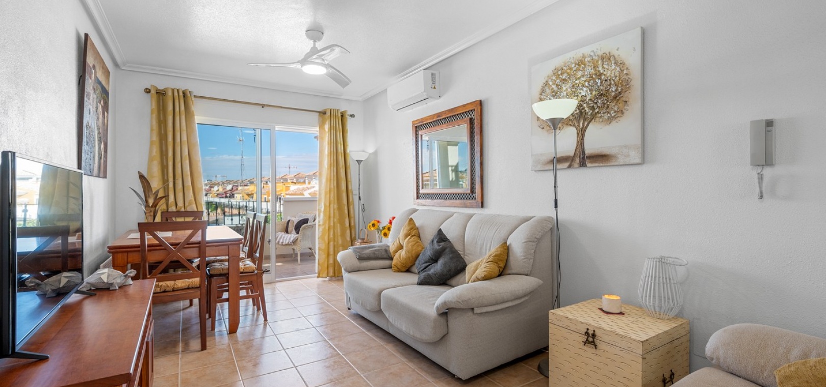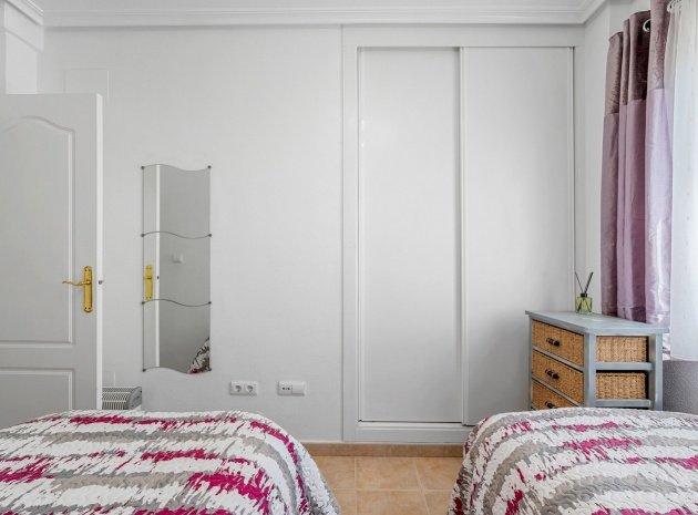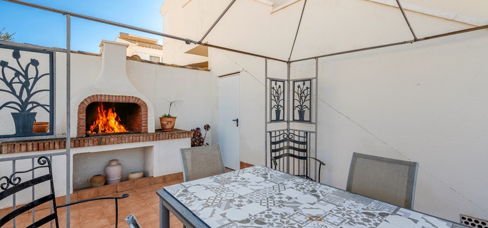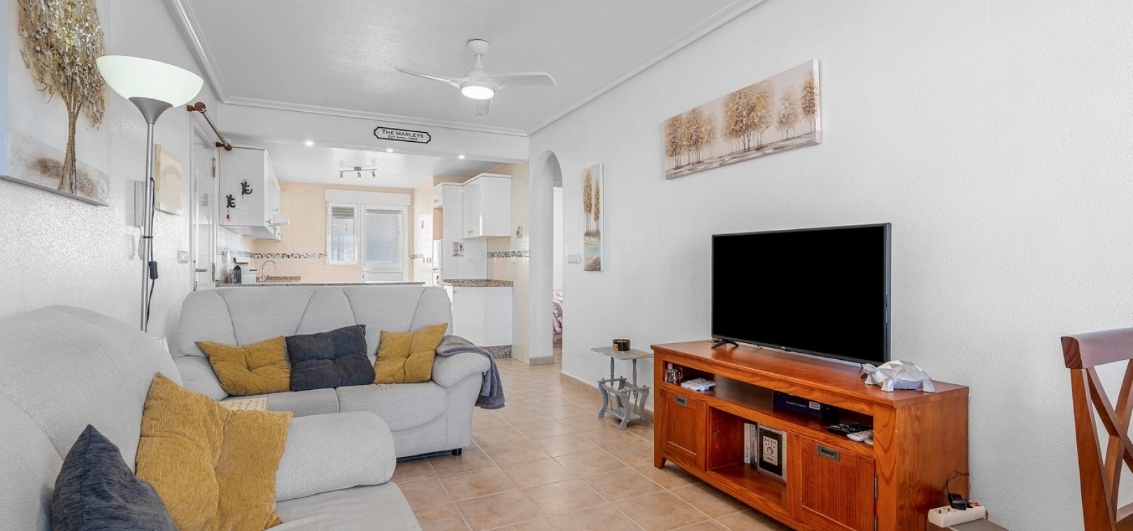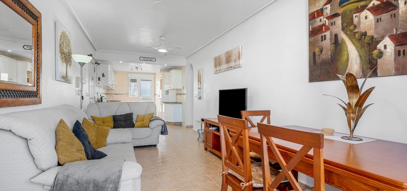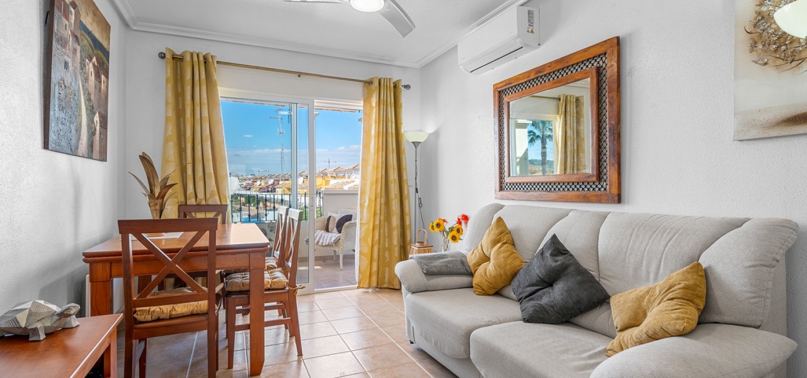 Wohn-/Esszimmer mit Klimaanlage (warm/kalt) und Deckenventilator, offene Einbauküche, separater Hauswirtschaftsraum, 2 Doppelschlafzimmer mit Einbauschränken, Klimaanlage (warm/kalt) und Deckenventilatoren, 2 neu eingebaute Duschräume, Balkon neben dem Wohnzimmer, private Dachterrasse, privater Garten und ein schöner Gemeinschaftspool.