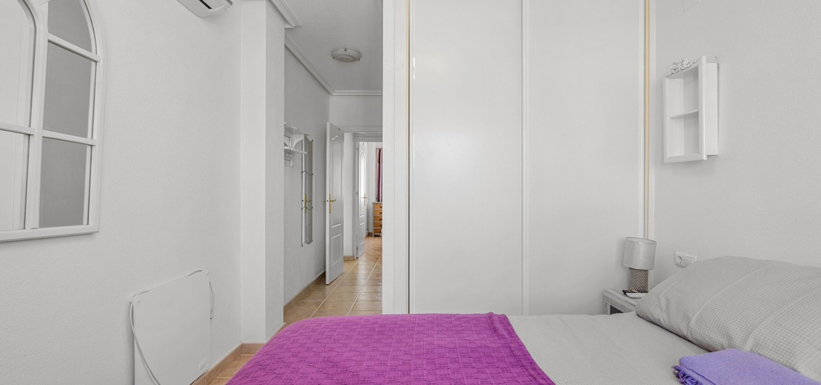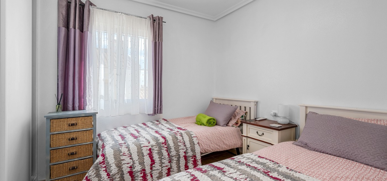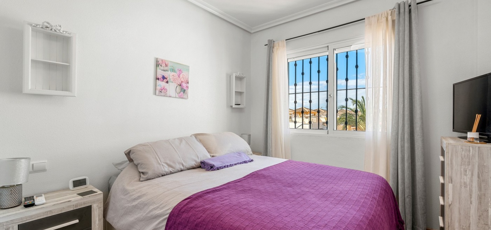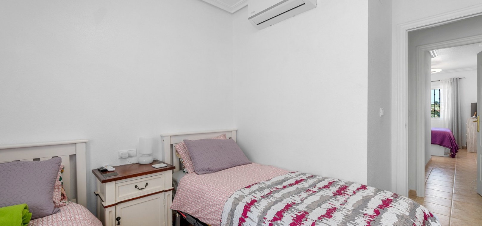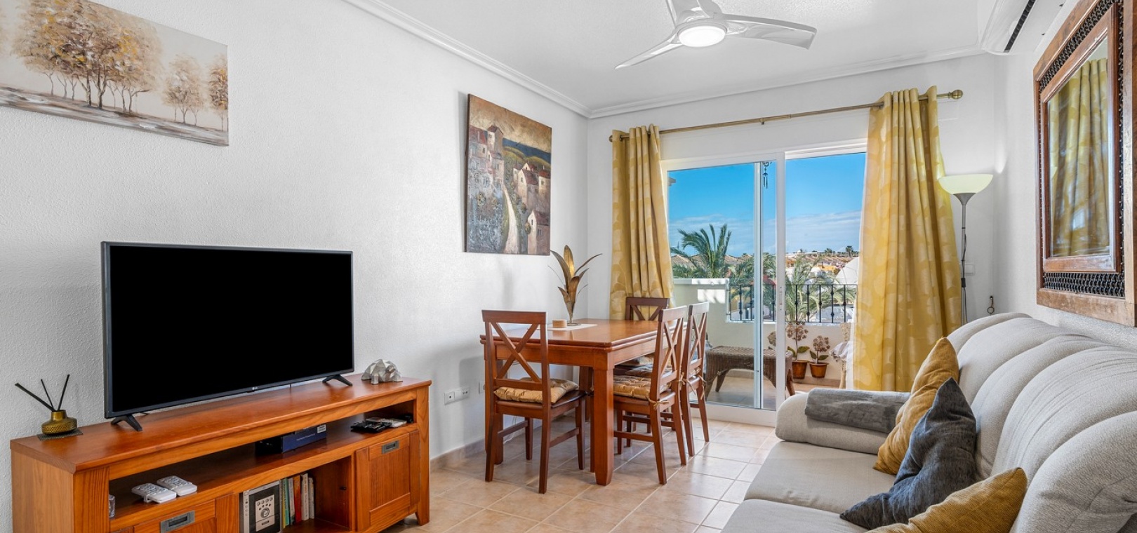 Wohn-/Esszimmer mit Klimaanlage (warm/kalt) und Deckenventilator, offene Einbauküche, separater Hauswirtschaftsraum, 2 Doppelschlafzimmer mit Einbauschränken, Klimaanlage (warm/kalt) und Deckenventilatoren, 2 neu eingebaute Duschräume, Balkon neben dem Wohnzimmer, private Dachterrasse, privater Garten und ein schöner Gemeinschaftspool.