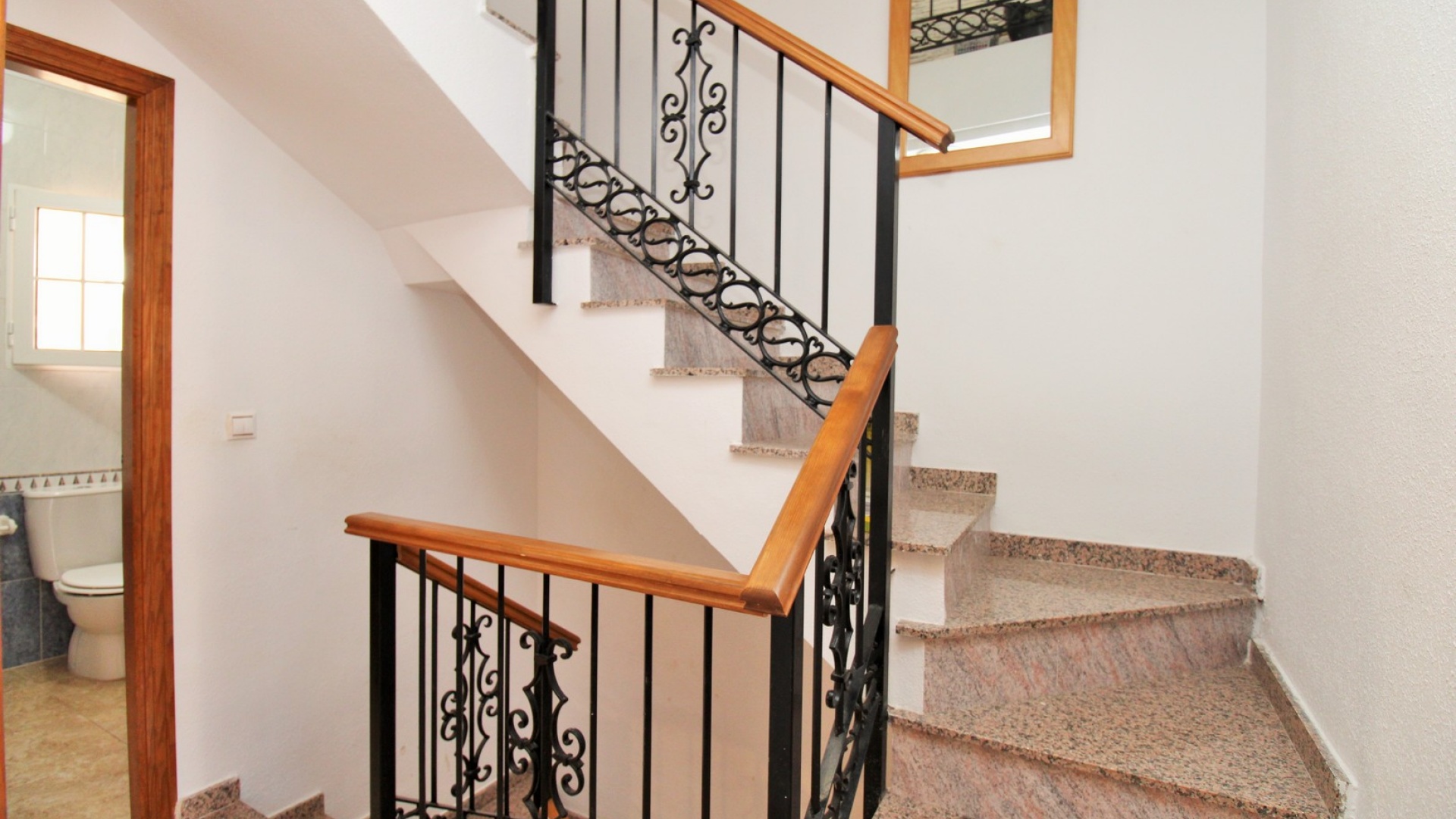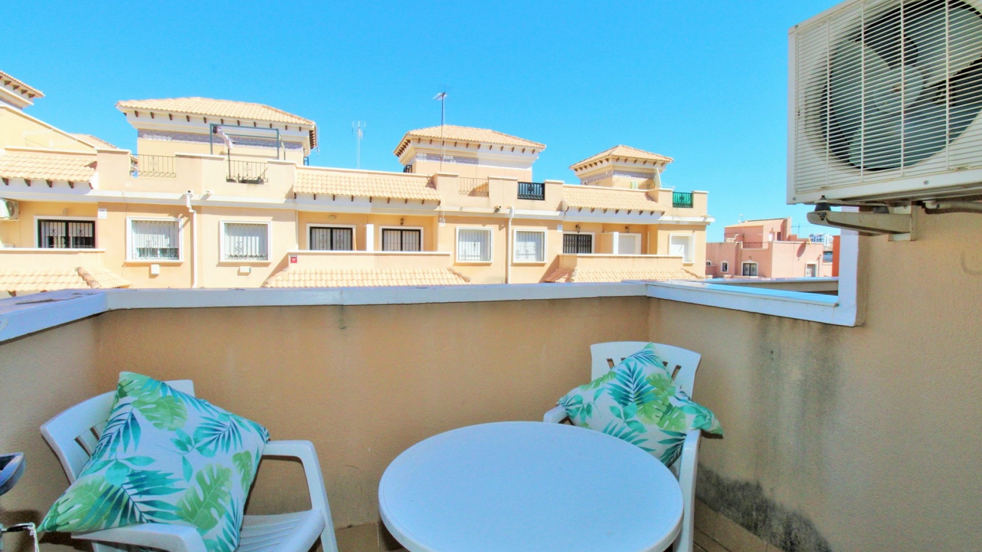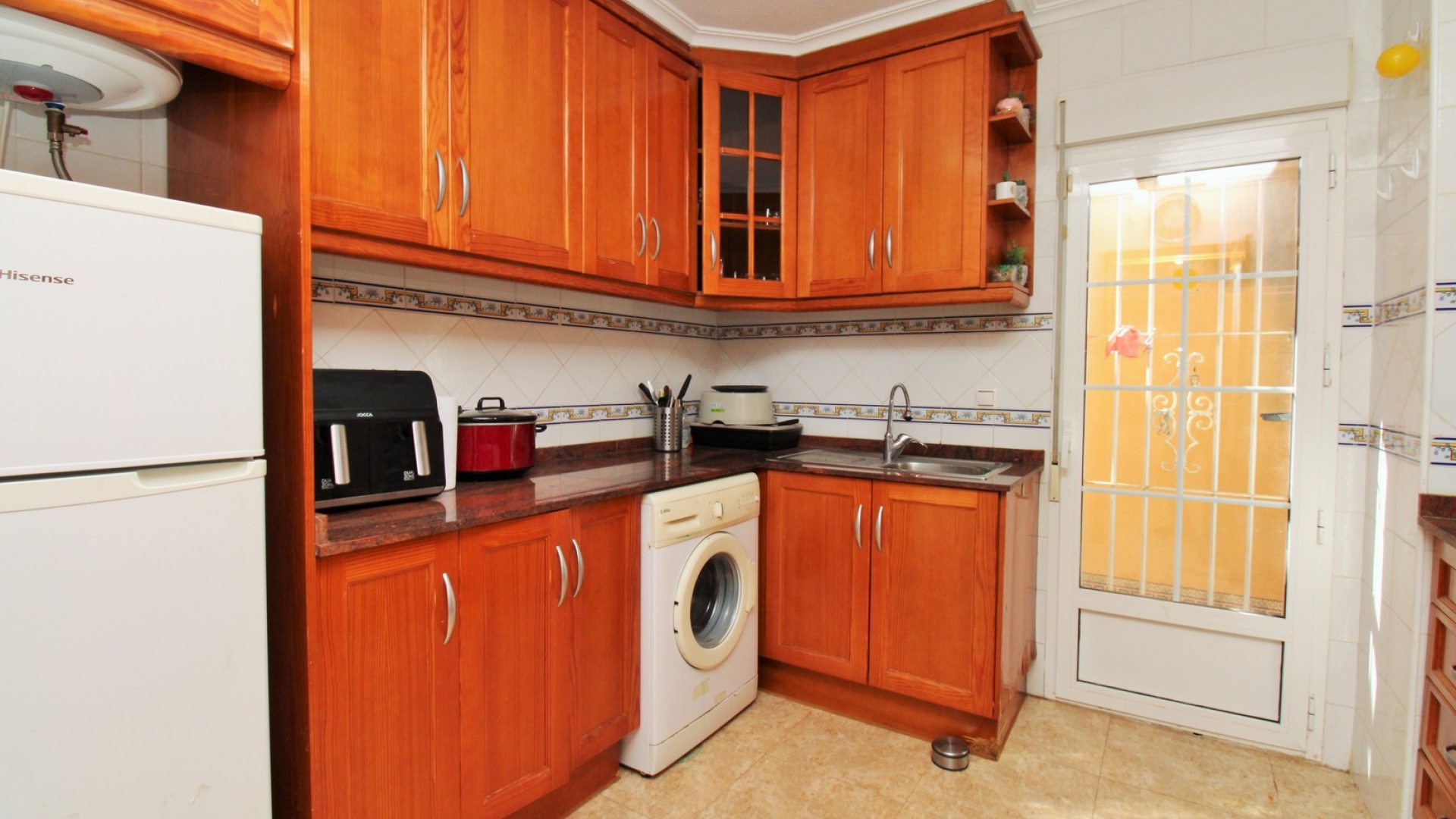 Reihenhaus mit 3 Schlafzimmern und 2 Bädern zum Verkauf in Entregolf, Pau 26, Villamartin. Das Anwesen hatte seit seiner Erbauung nur einen Eigentümer und wird wie gesehen mit Haushaltsgeräten und Klimaanlage verkauft. Es gehört zu einer Wohnanlage mit einem schönen Gemeinschaftspool und Gartenanlagen in unmittelbarer Nähe. Der Wohnraum im Erdgeschoss besteht aus einem hellen Wohn- und Essbereich, einer separaten Küche mit Zugang zur hinteren Terrasse und einem Badezimmer mit ebenerdiger Dusche. Draußen erwartet Sie eine geflieste Terrasse mit überdachter Veranda. Im Obergeschoss befinden sich drei Schlafzimmer mit Einbauschränken und ein Familienbadezimmer. Das Hauptschlafzimmer verfügt über einen privaten Balkon. Eine Innentreppe vom Treppenabsatz führt hinauf zum L-förmigen Solarium auf dem Dach – ideal zum Sonnenbaden und für gesellige Stunden bei ganztägiger Sonne! Das Anwesen ist nur eine kurze Fahrt vom Villamartin Plaza, dem Zenia Boulevard und den Stränden entfernt. Innerhalb von 10 Gehminuten erreichen Sie einen ALDI-Supermarkt sowie weitere Bars und Restaurants in der Via Park III.