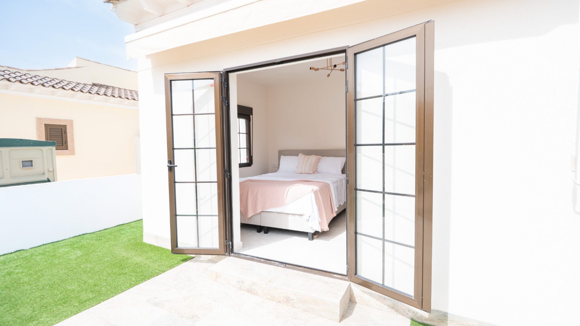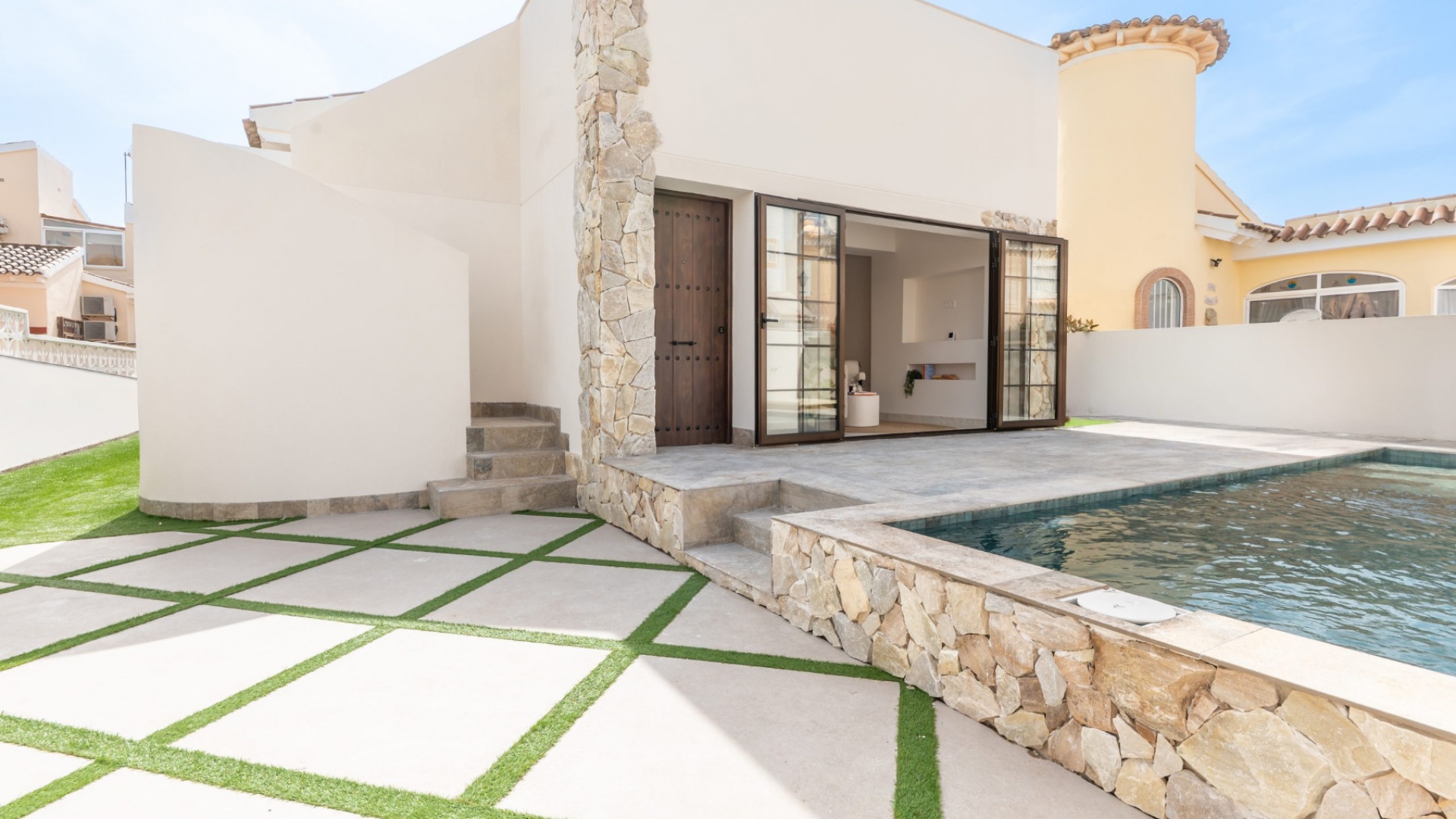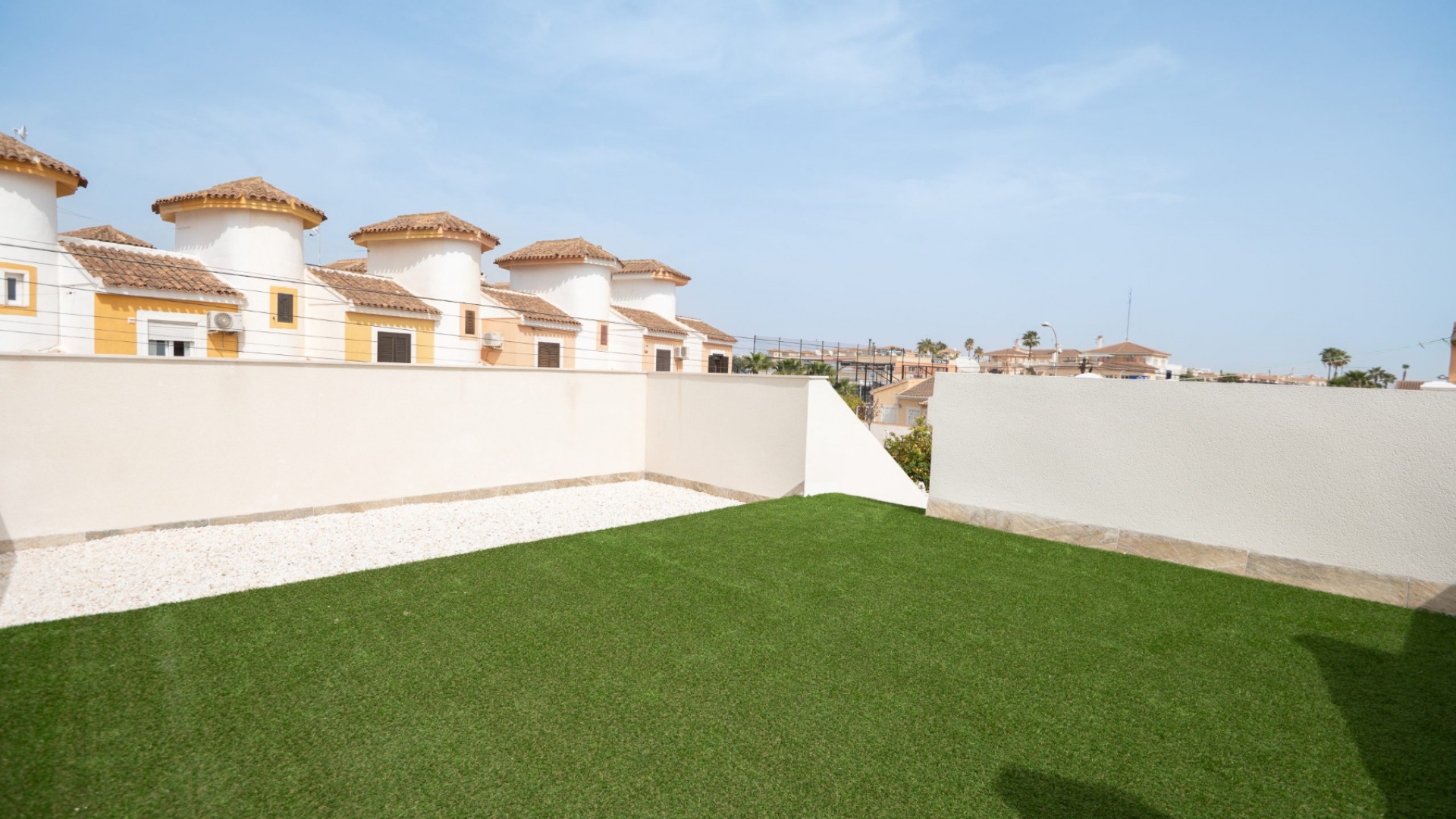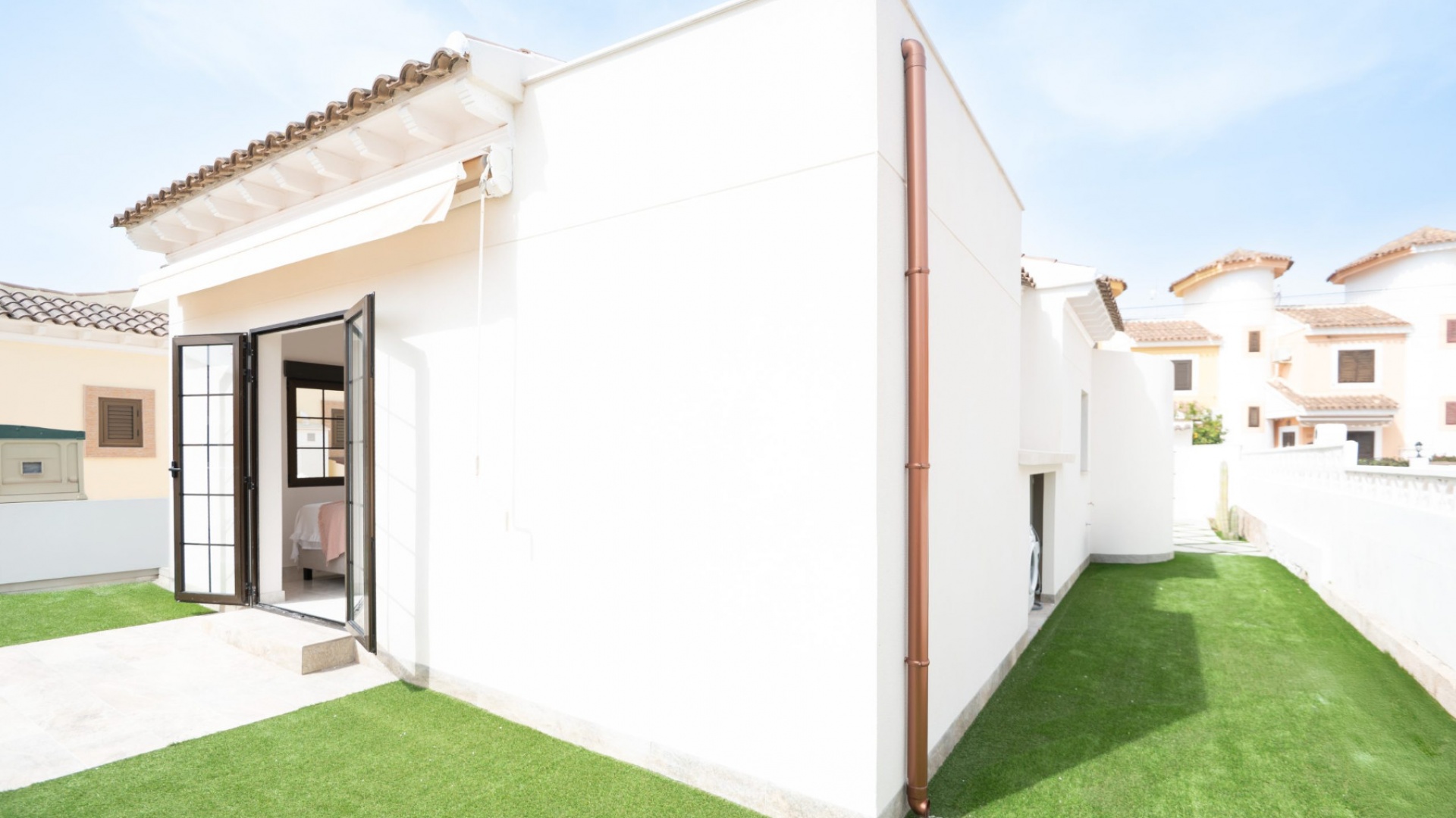 Vorderterrasse, Wohnzimmer mit Frühstücksbar, offene Küche, 3 Doppelschlafzimmer, eines mit begehbarem Kleiderschrank und das Hauptschlafzimmer hat ein eigenes Duschbad und Türen zum hinteren Gartenbereich mit Markise, 1 Gästeduschbad, ein privates Solarium auf dem Dach, ein pflegeleichter Garten mit Kunstrasen und Fliesen, Parkplatz abseits der Straße, privater Swimmingpool und vieles mehr.