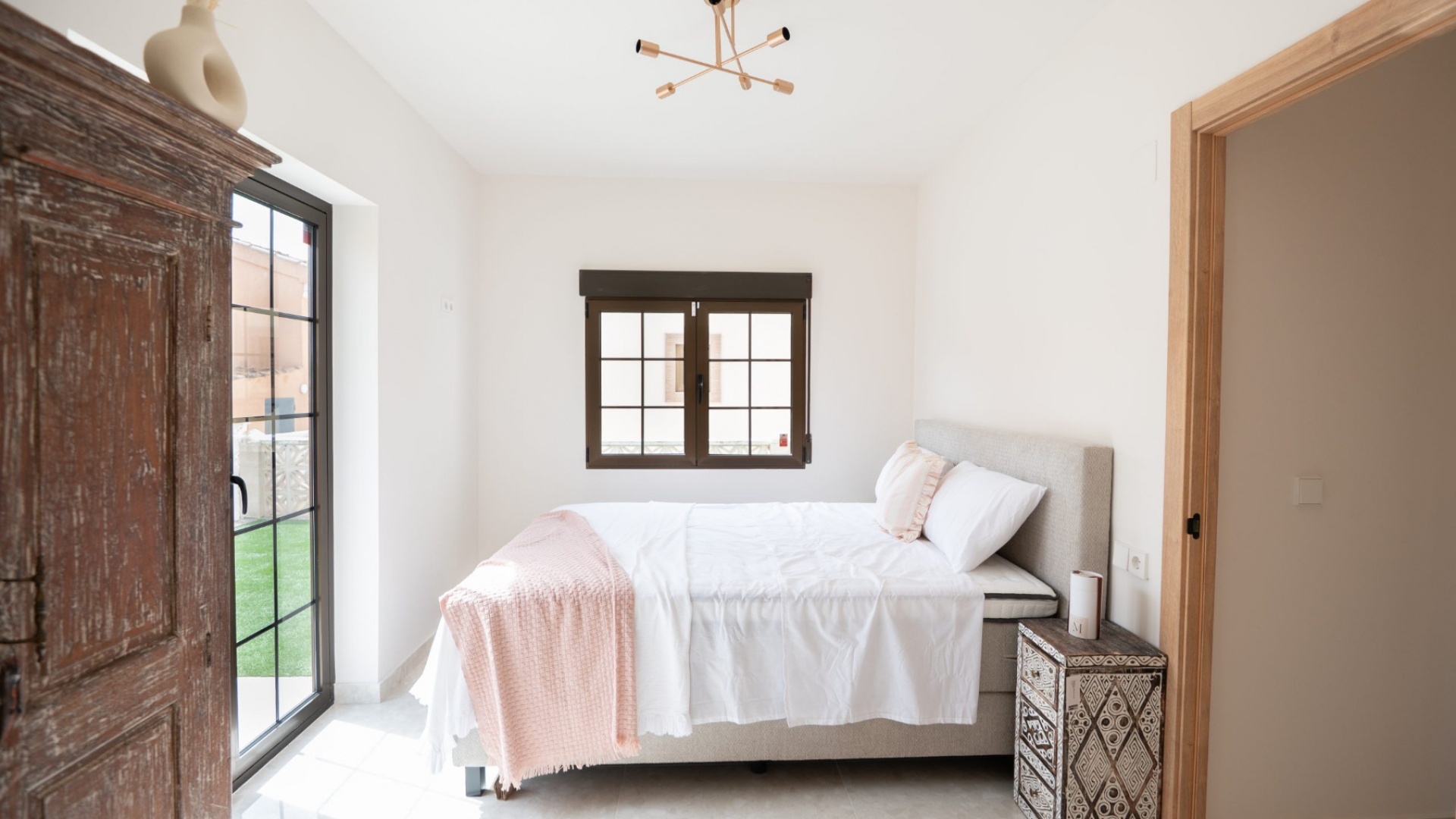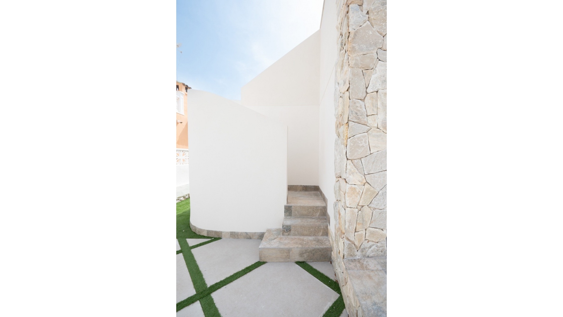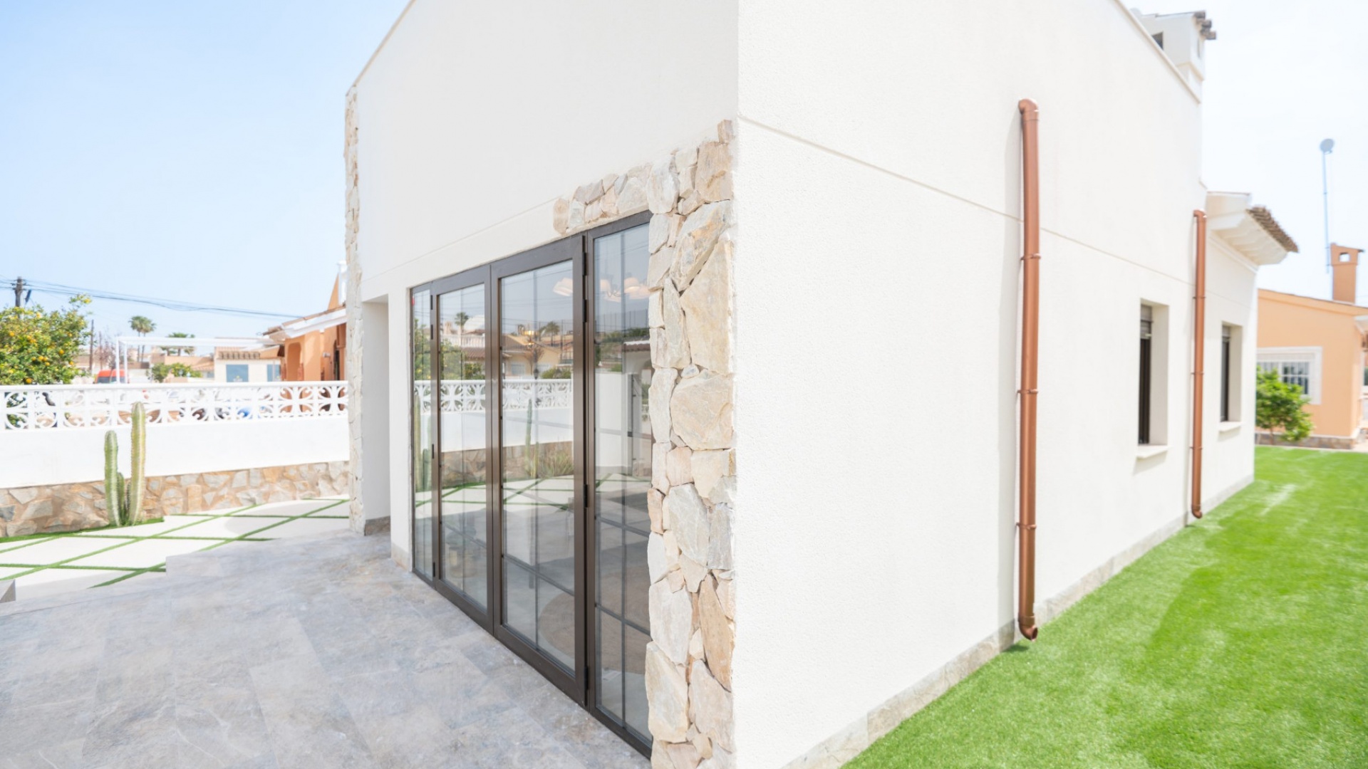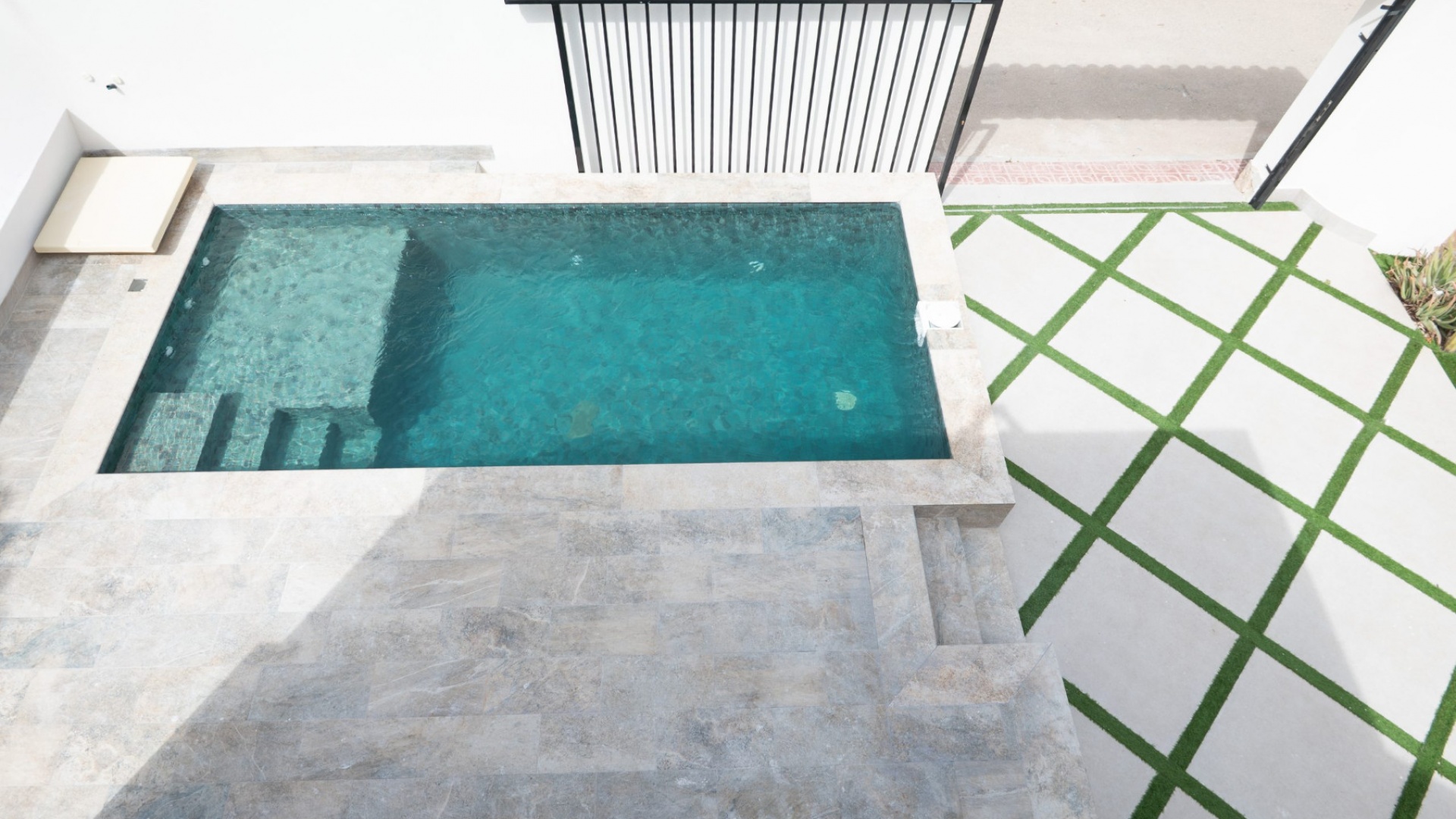 Vorderterrasse, Wohnzimmer mit Frühstücksbar, offene Küche, 3 Doppelschlafzimmer, eines mit begehbarem Kleiderschrank und das Hauptschlafzimmer hat ein eigenes Duschbad und Türen zum hinteren Gartenbereich mit Markise, 1 Gästeduschbad, ein privates Solarium auf dem Dach, ein pflegeleichter Garten mit Kunstrasen und Fliesen, Parkplatz abseits der Straße, privater Swimmingpool und vieles mehr.