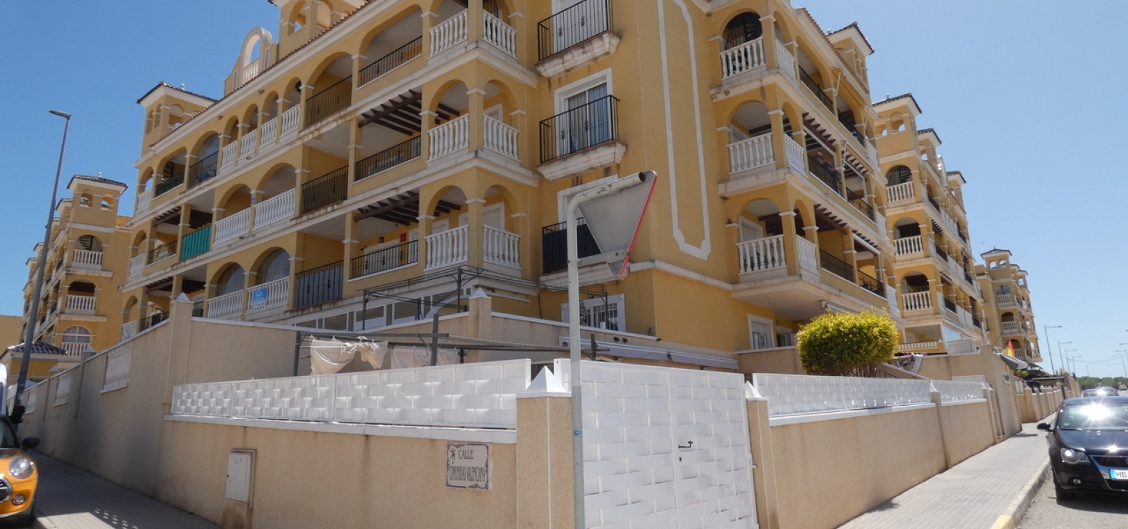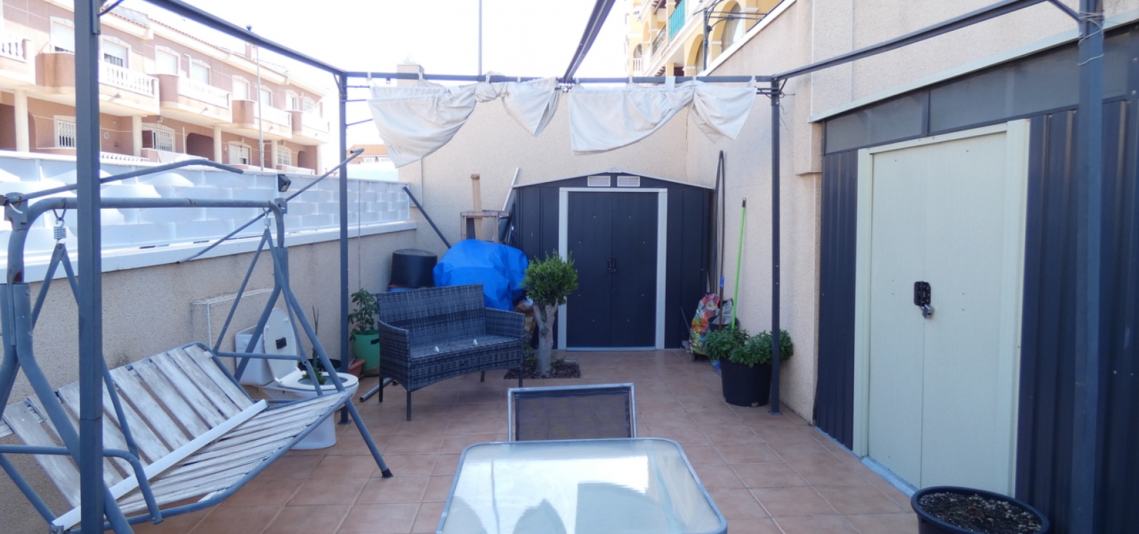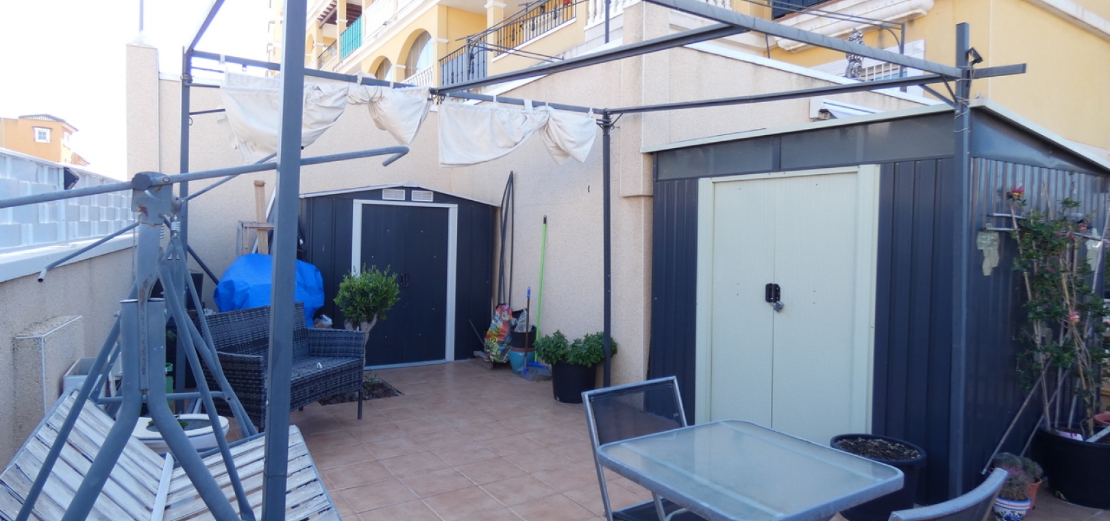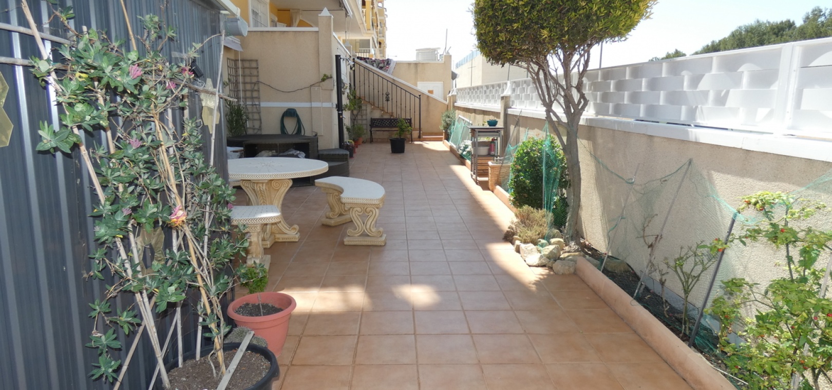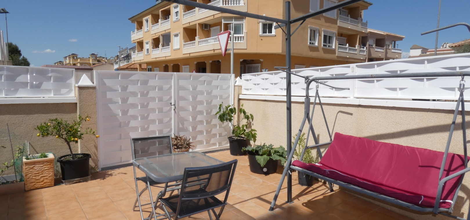 Willkommen in diesem atemberaubenden Apartment „Fontana 2“ im charmanten Dorf Algorfa. Dieses wunderschön gestaltete, nach Westen ausgerichtete Eckgrundstück im Erdgeschoss bietet viel privaten Außenbereich und ist somit die perfekte Wahl für alle, die Ruhe und ein sonniges Leben im Freien schätzen. Die Wohnung verfügt über eine großzügige Terrasse – ideal zum Entspannen, Sonnenbaden oder für Gäste. Im Inneren erwartet Sie ein modernes Wohnkonzept mit zwei Schlafzimmern und einem eleganten Badezimmer, allesamt modern und mit viel Liebe zum Detail eingerichtet. Besonders beeindruckend ist das Hauptschlafzimmer mit seiner eigenen großen privaten Terrasse, die einen ruhigen Rückzugsort mit herrlichem Blick auf die Umgebung bietet. Die Küche wurde komplett renoviert und ist sehr geräumig. Für zusätzlichen Komfort verfügt diese Immobilie über eine eigene Tiefgarage, in der Ihr Fahrzeug sicher und leicht zugänglich geparkt ist. Ob Sie den privaten Gartenbereich genießen, auf der Terrasse Sonne tanken oder in den komfortablen Innenräumen entspannen – diese Wohnung bietet die perfekte Mischung aus modernem Wohnen und Außenbereich. Die Immobilie bietet außerdem Zugang zum Gemeinschaftspool „Fontana II“.