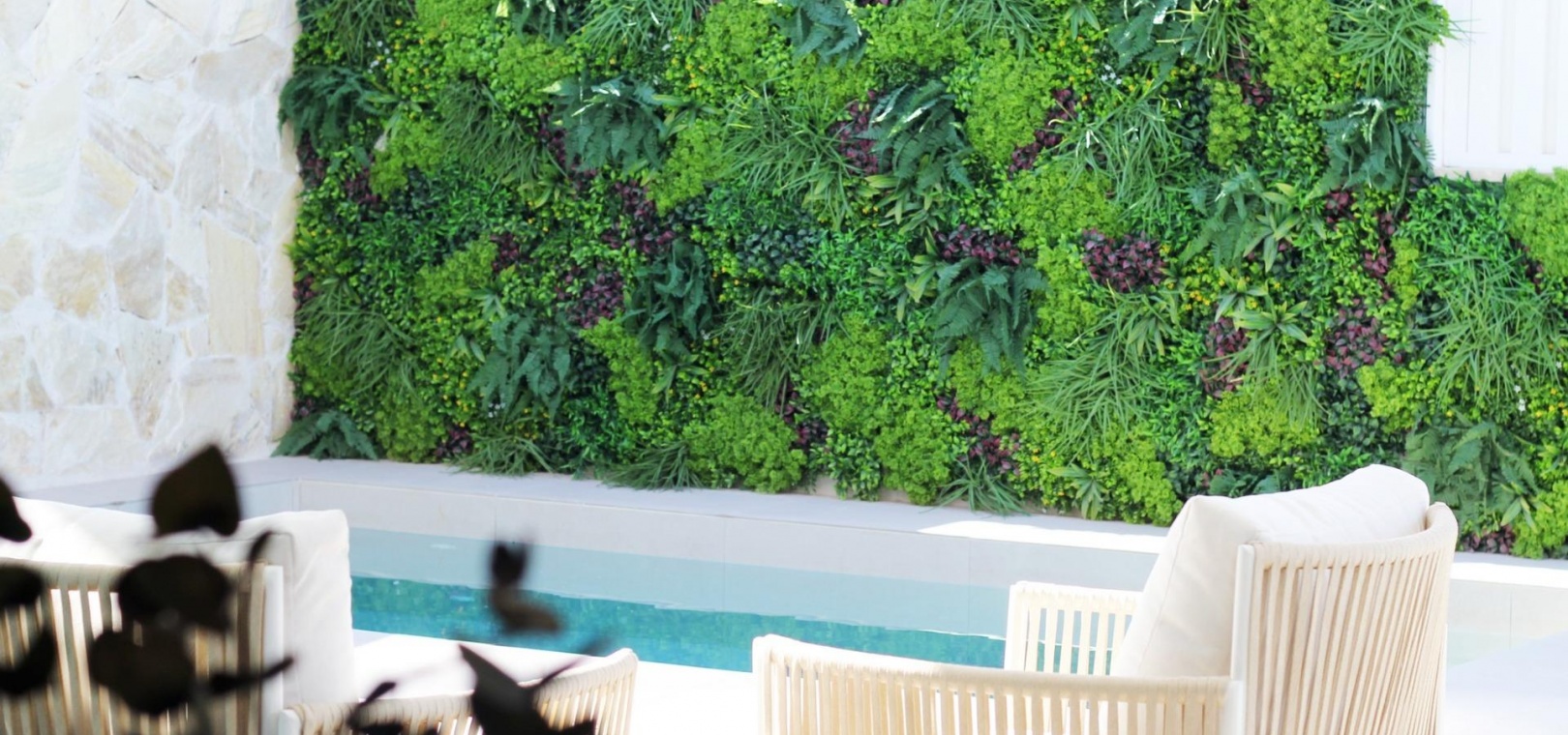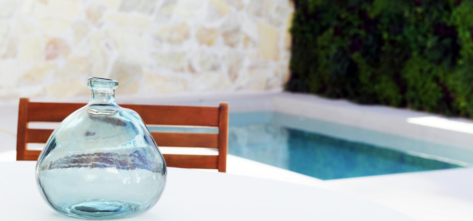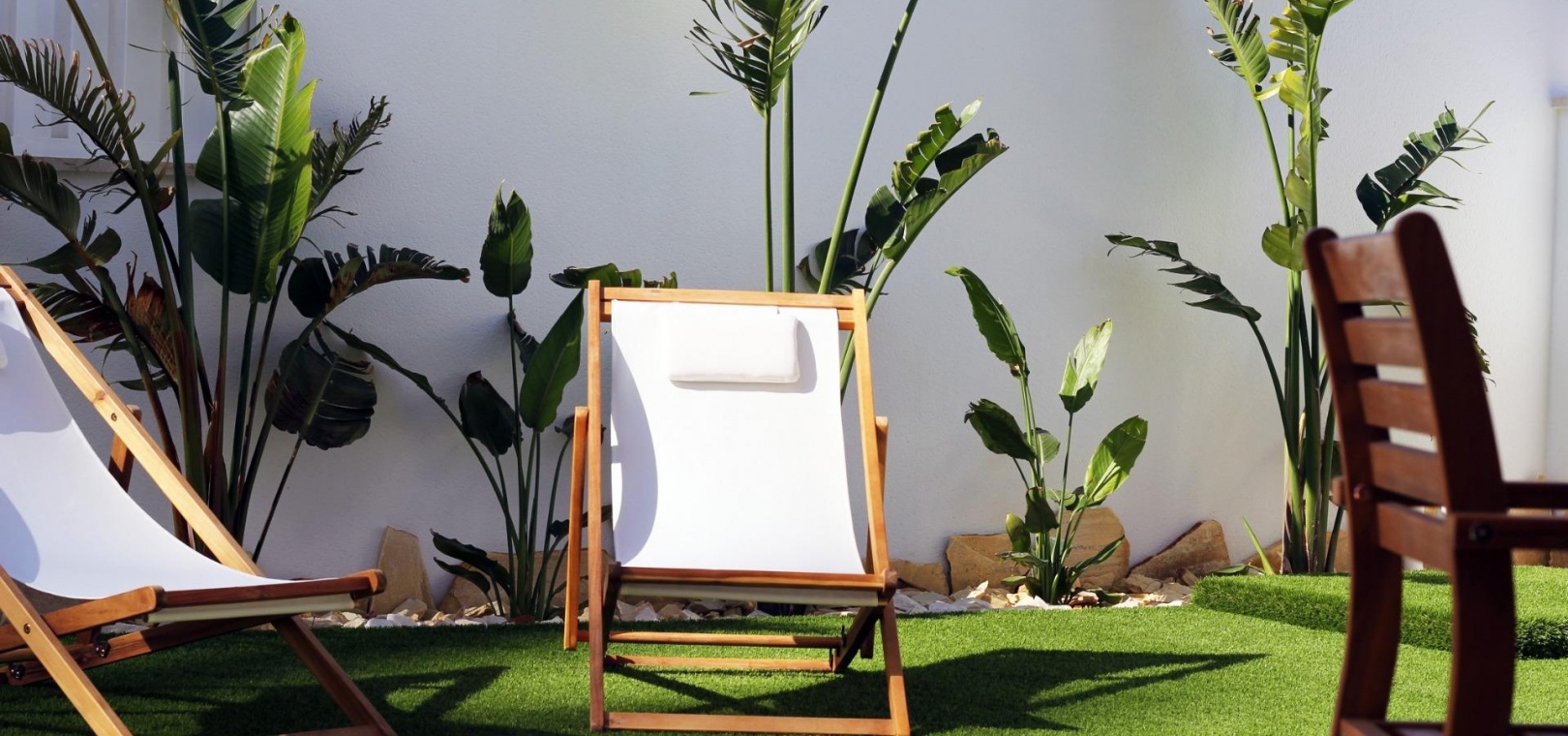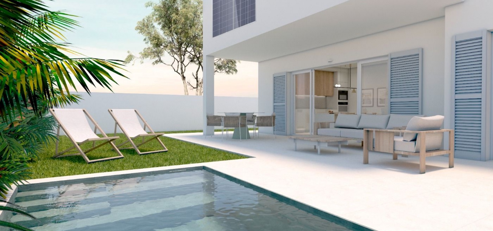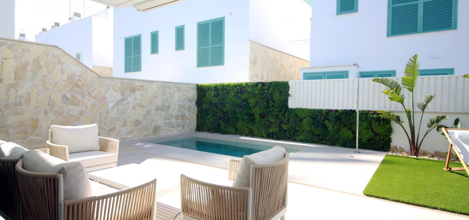 Schöne Bungalows im Erdgeschoss haben einen privaten Garten mit Pool, Bungalow im Obergeschoss hat eine private Sonnenterrasse mit Pool.