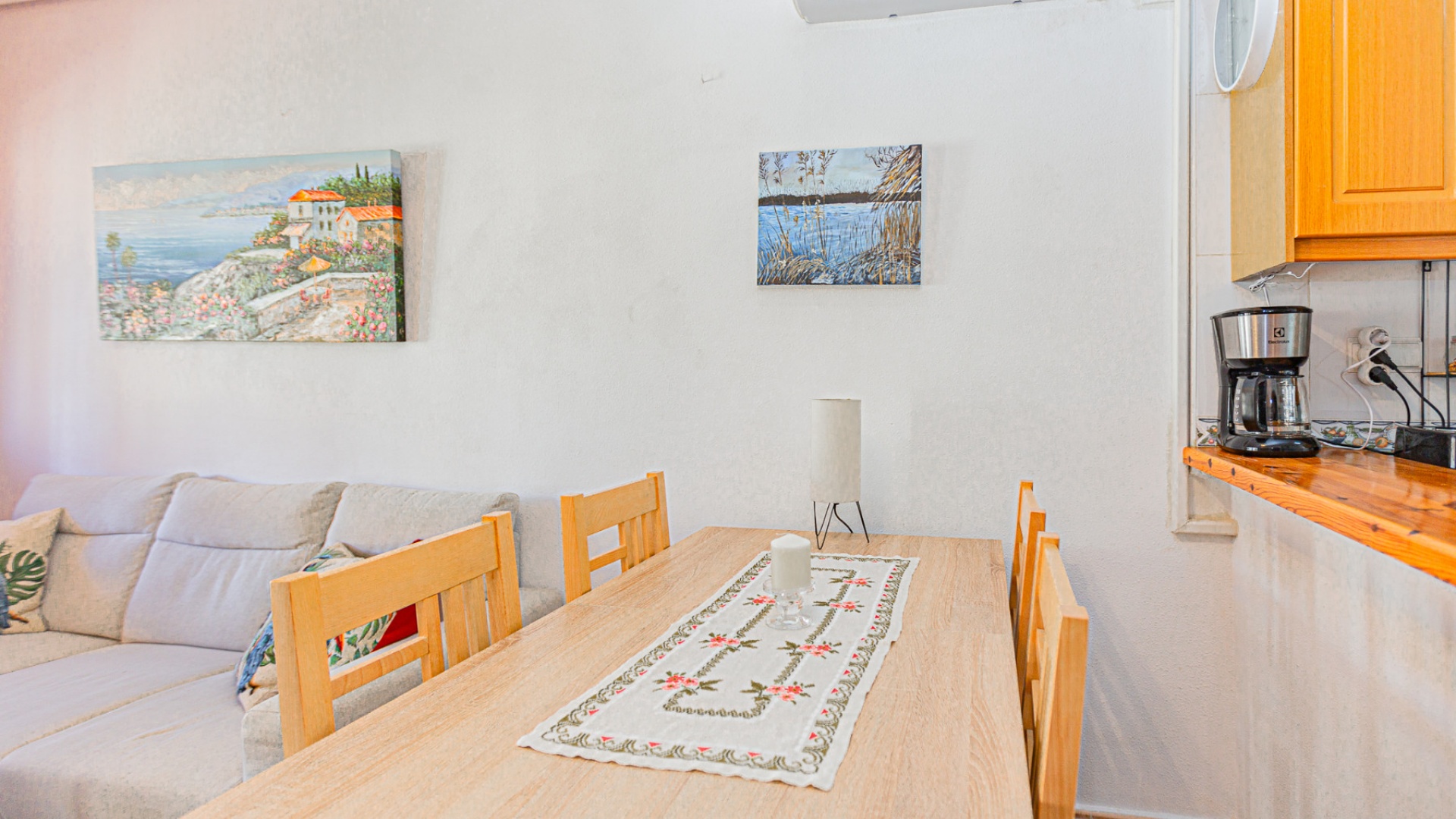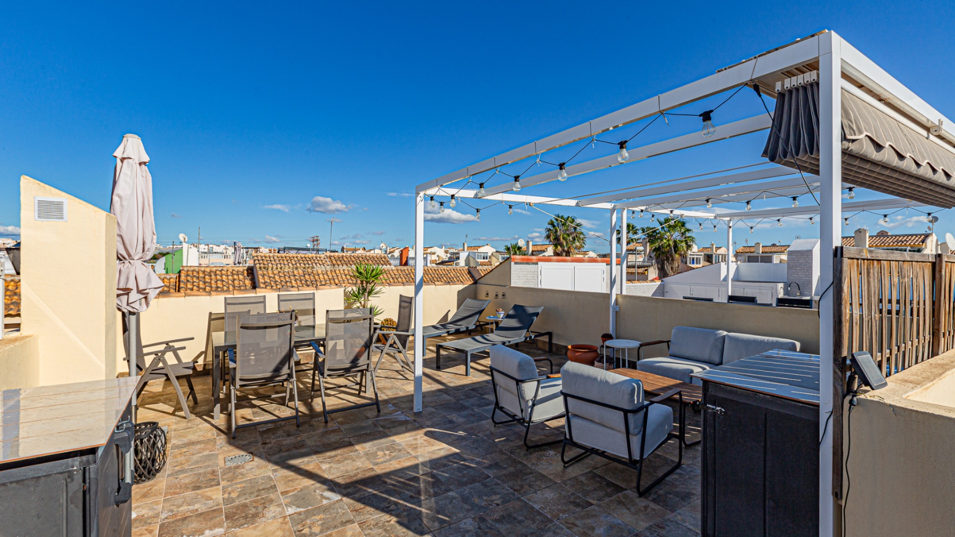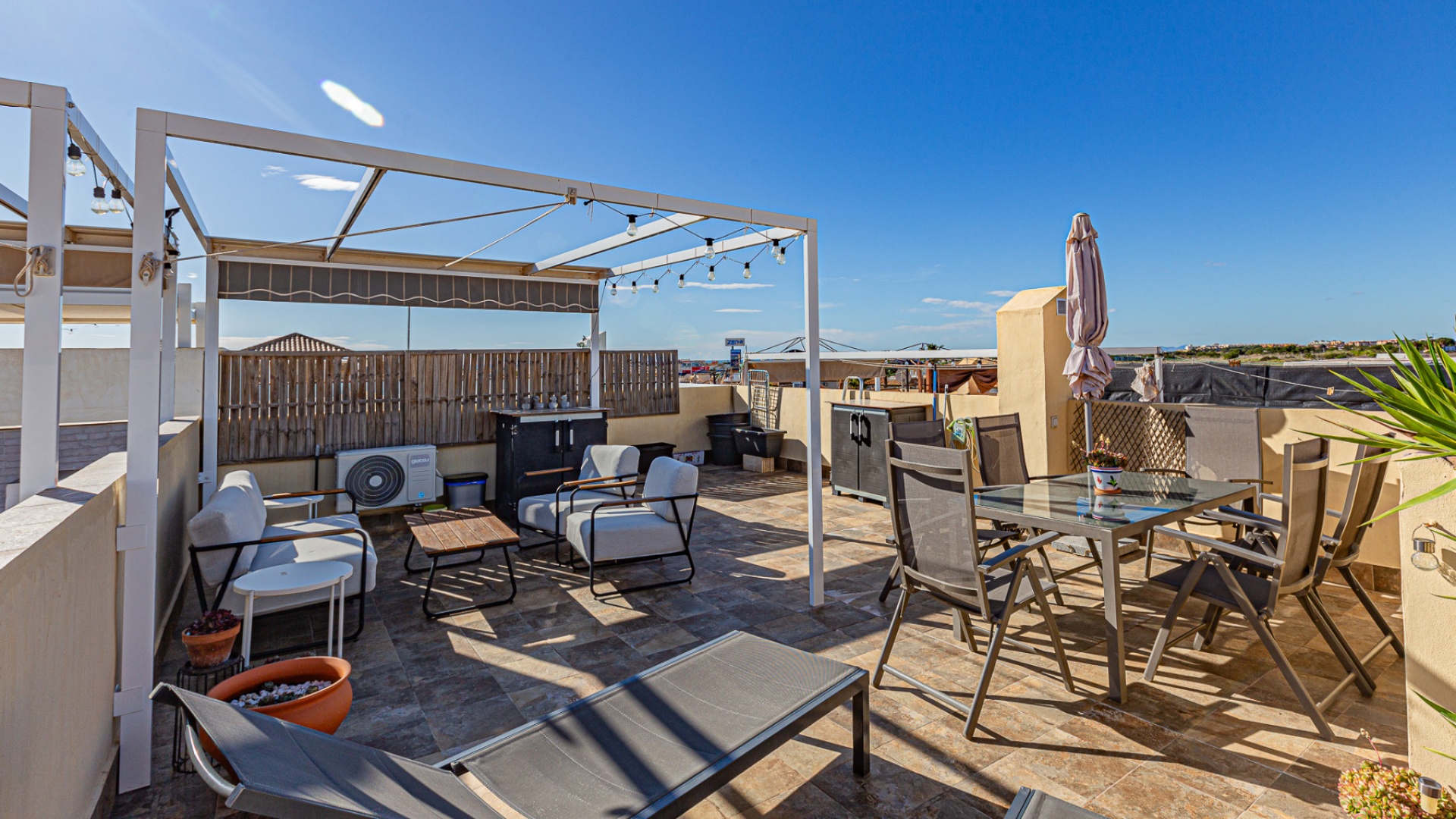 Wir freuen uns, Ihnen diese schöne Dachgeschosswohnung in der begehrten Wohngegend Playa Flamenca präsentieren zu können, nur einen kurzen Spaziergang vom renommierten Einkaufszentrum Zenia Boulevard – dem größten an der Küste – entfernt. Die Immobilie bietet zwei Schlafzimmer, ein Badezimmer, einen Wohn-Essbereich mit offener Küche, einen gemütlichen Balkon und eine fantastische private Sonnenterrasse mit freiem Blick auf die Umgebung.