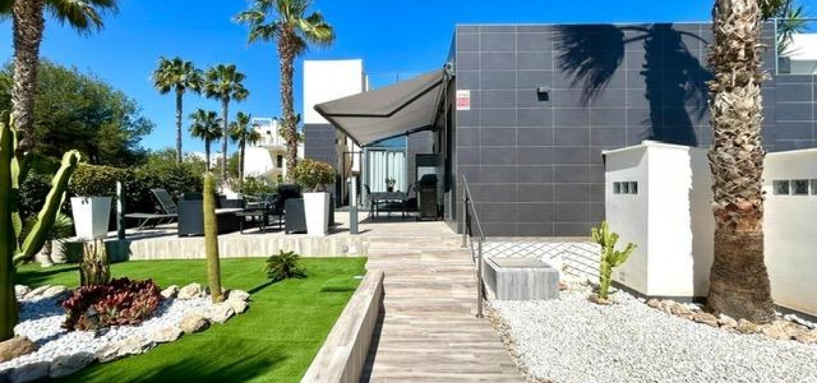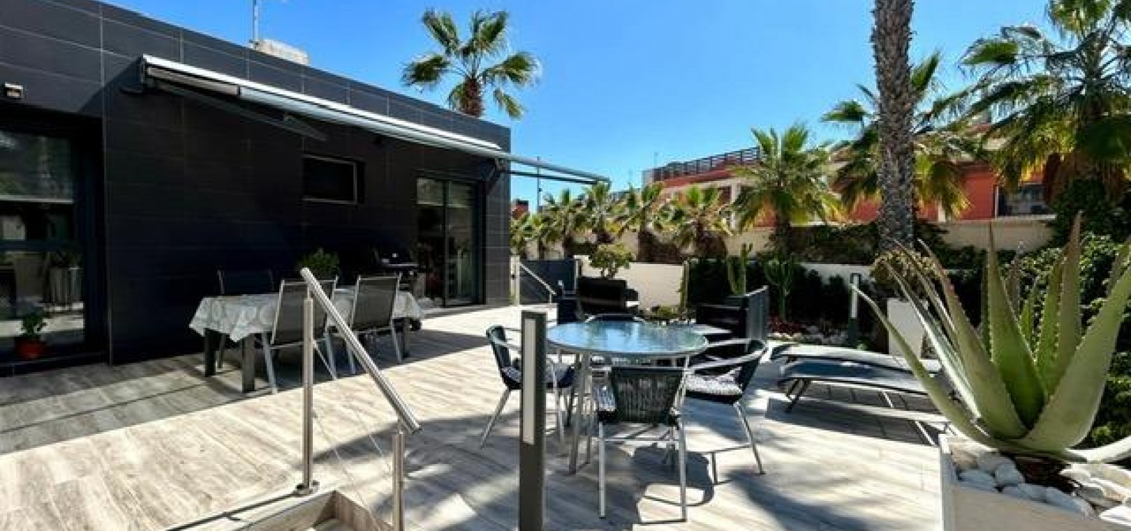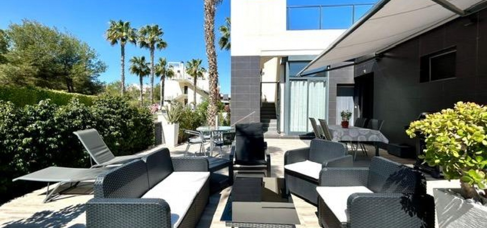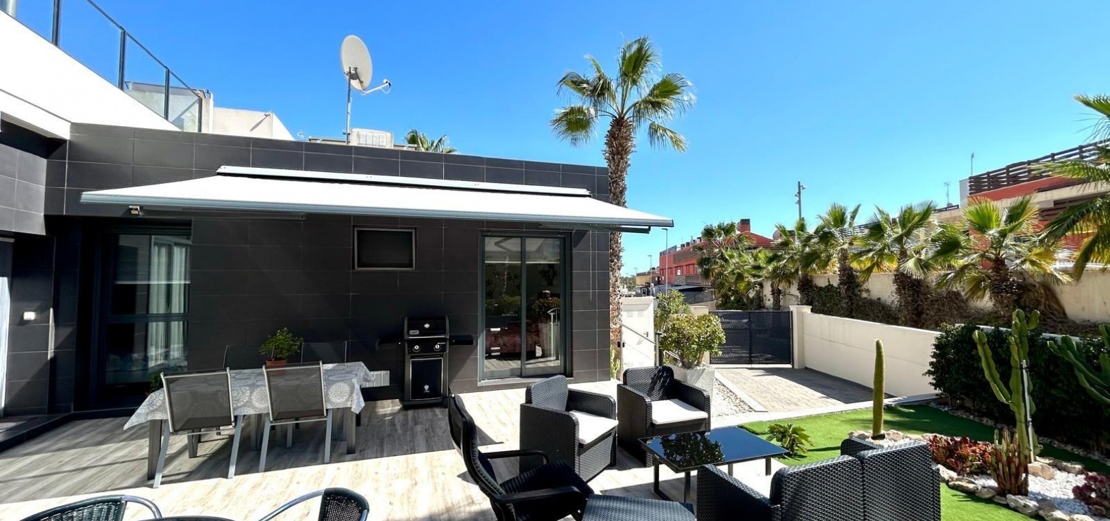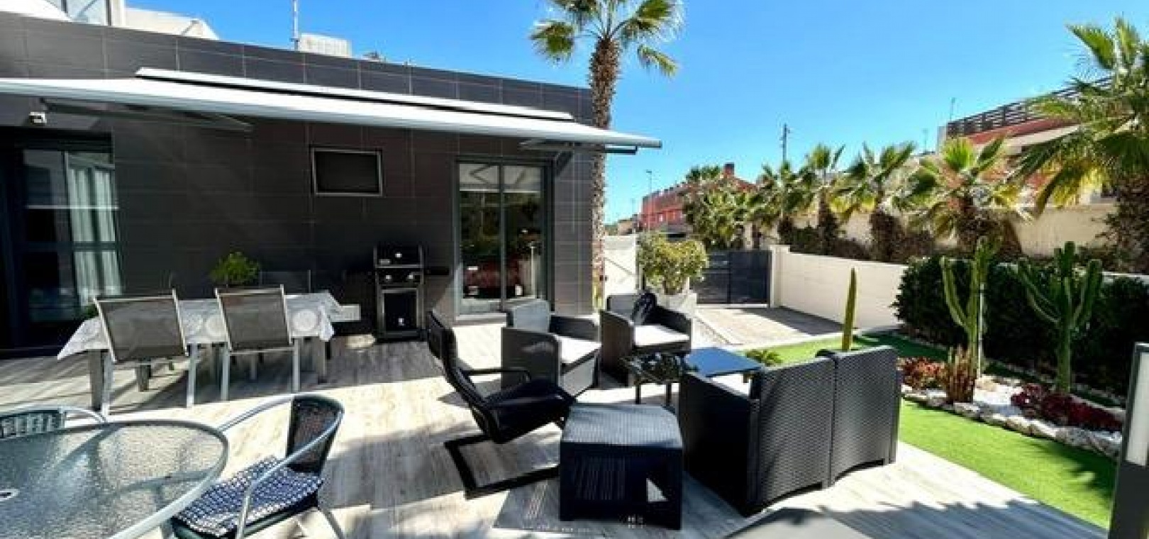 Moderne Doppelhaushälfte in Villamartín, in der Nähe des Einkaufszentrums La Fuente. Die bebaute Fläche von 78 m² verteilt sich auf mehrere Räume, verfügt über einen großen Garten und eine private Sonnenterrasse. Das Haus bietet zwei Schlafzimmer und zwei Bäder. Das Hauptschlafzimmer hat Zugang zur Terrasse und ein eigenes Bad en-suite. Das helle Wohn-Esszimmer mit hohen Decken sorgt für viel Licht und eine voll ausgestattete offene Küche mit allen notwendigen Geräten. Alle Zimmer sind klimatisiert. Das Highlight ist die große Terrasse mit Markise zum Genießen der Natur. Das Haus ist sehr gepflegt und ideal zum Einzug. Es verfügt über einen Parkplatz auf dem Grundstück und einen schönen, gepflegten Garten mit Pflanzen, Bäumen und Beleuchtung. Über die Außentreppe gelangt man zur ca. 30 m² großen Sonnenterrasse mit Blick auf den Garten und den gegenüberliegenden Gemeinschaftspool. Ein weiterer Parkplatz befindet sich auf dem Gemeinschaftsparkplatz. Eine ideale Immobilie für alle, die eine moderne Immobilie mit großem Außenbereich und in der Nähe aller Annehmlichkeiten suchen. Möbliert verkauft. Nur 5 Autominuten entfernt befinden sich mehrere Sandstrände, das Einkaufszentrum La Zenia Boulevard und mehrere Golfplätze. Das Einkaufszentrum La Fuente erreichen Sie in 5 Gehminuten.