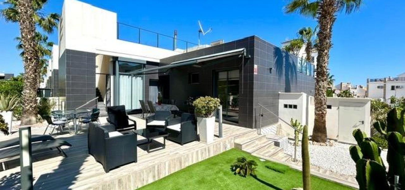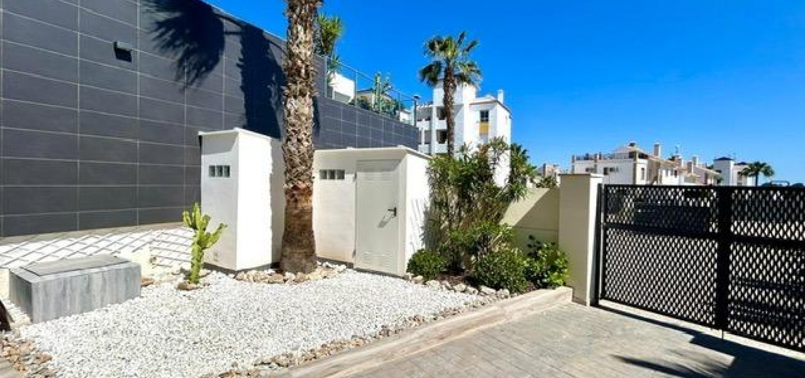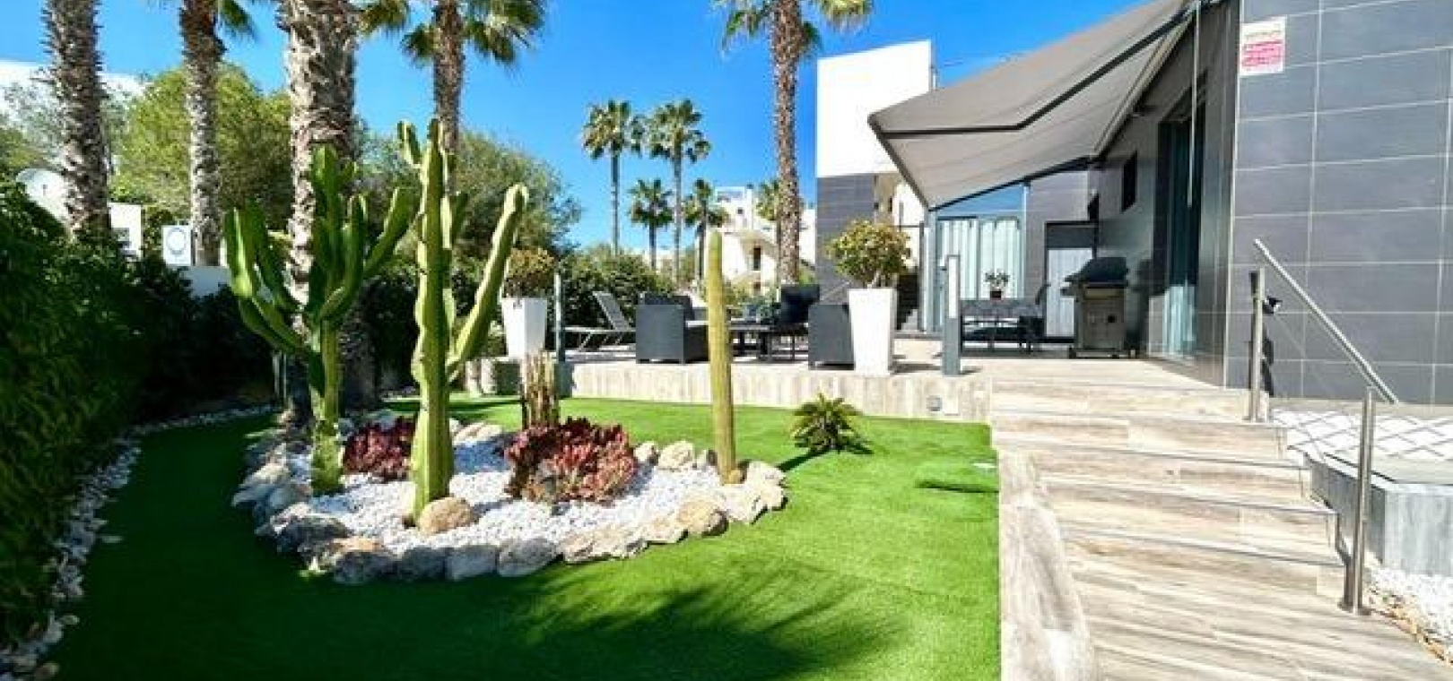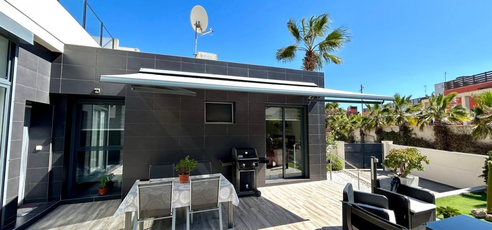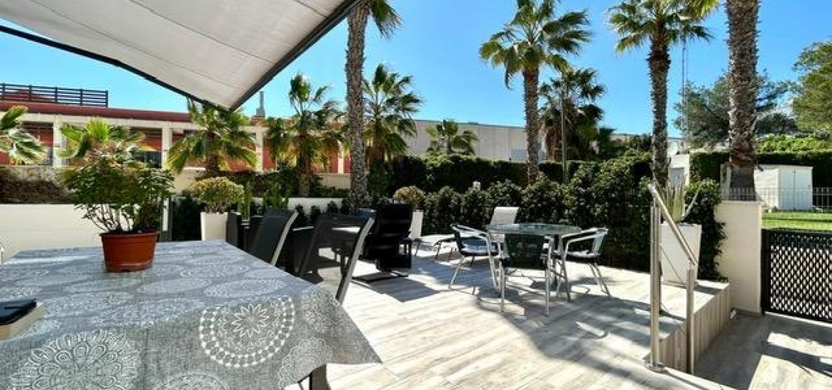Moderne Doppelhaushälfte in Villamartín, in der Nähe des Einkaufszentrums La Fuente. Die bebaute Fläche von 78 m² verteilt sich auf mehrere Räume, verfügt über einen großen Garten und eine private Sonnenterrasse. Das Haus bietet zwei Schlafzimmer und zwei Bäder. Das Hauptschlafzimmer hat Zugang zur Terrasse und ein eigenes Bad en-suite. Das helle Wohn-Esszimmer mit hohen Decken sorgt für viel Licht und eine voll ausgestattete offene Küche mit allen notwendigen Geräten. Alle Zimmer sind klimatisiert. Das Highlight ist die große Terrasse mit Markise zum Genießen der Natur. Das Haus ist sehr gepflegt und ideal zum Einzug. Es verfügt über einen Parkplatz auf dem Grundstück und einen schönen, gepflegten Garten mit Pflanzen, Bäumen und Beleuchtung. Über die Außentreppe gelangt man zur ca. 30 m² großen Sonnenterrasse mit Blick auf den Garten und den gegenüberliegenden Gemeinschaftspool. Ein weiterer Parkplatz befindet sich auf dem Gemeinschaftsparkplatz. Eine ideale Immobilie für alle, die eine moderne Immobilie mit großem Außenbereich und in der Nähe aller Annehmlichkeiten suchen. Möbliert verkauft. Nur 5 Autominuten entfernt befinden sich mehrere Sandstrände, das Einkaufszentrum La Zenia Boulevard und mehrere Golfplätze. Das Einkaufszentrum La Fuente erreichen Sie in 5 Gehminuten.