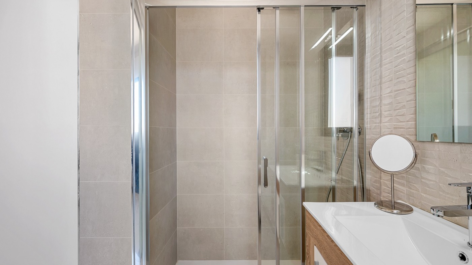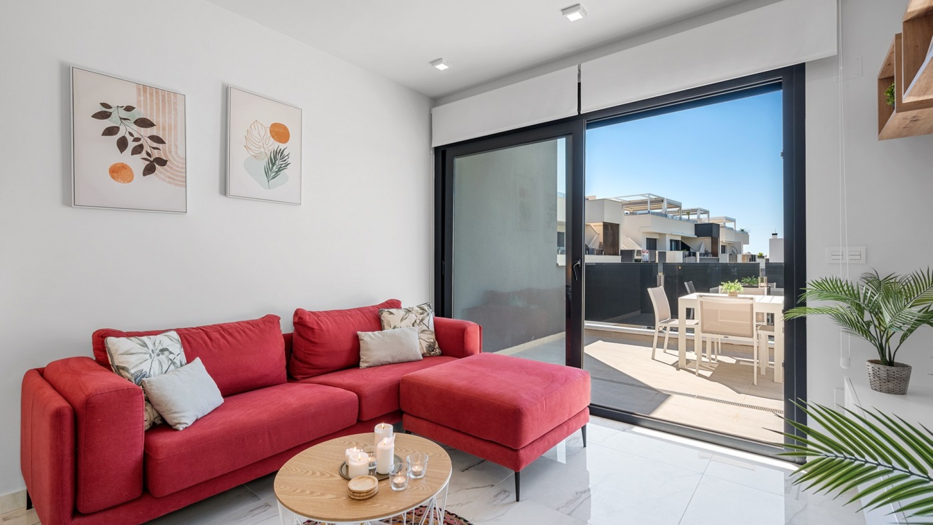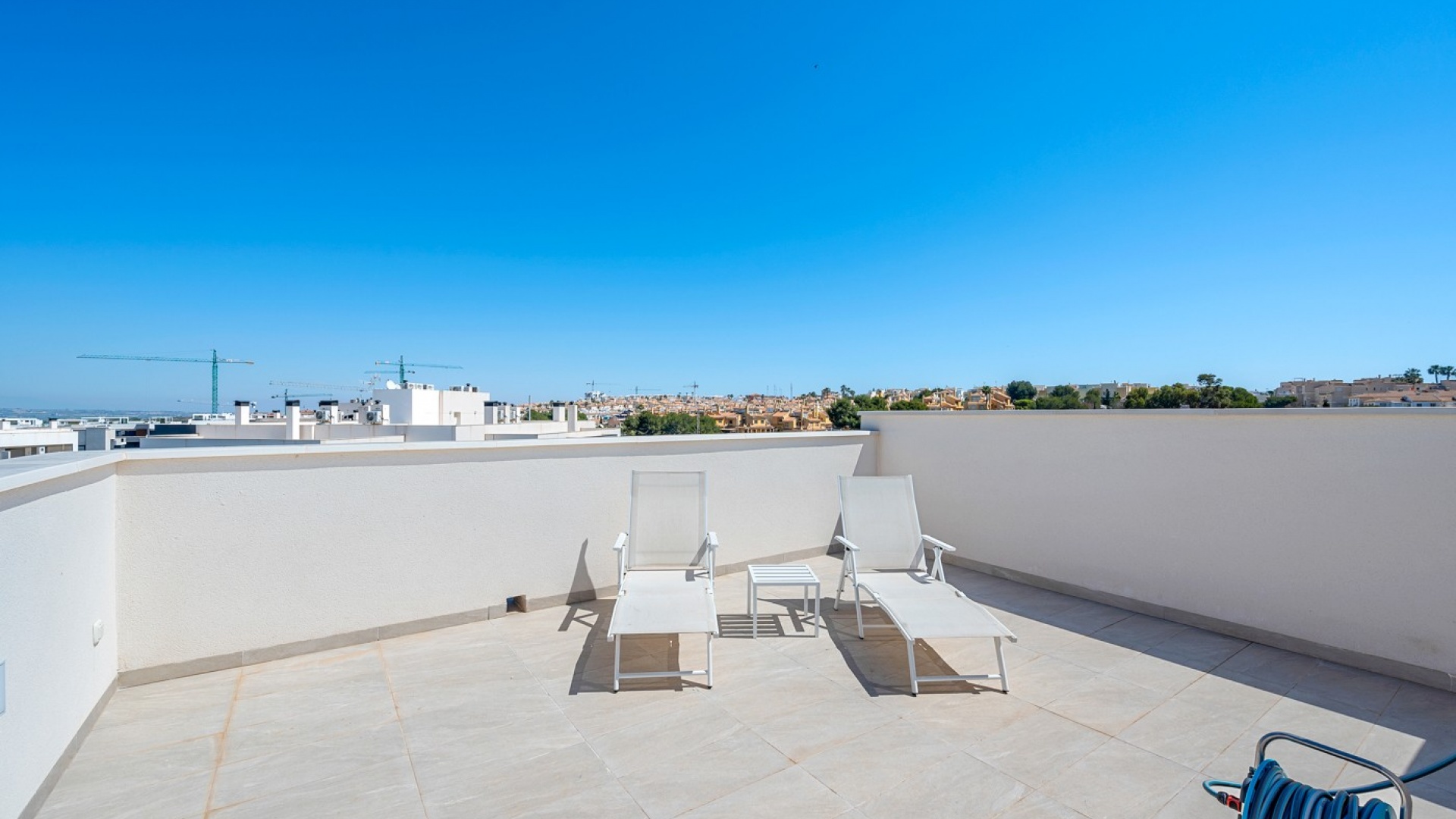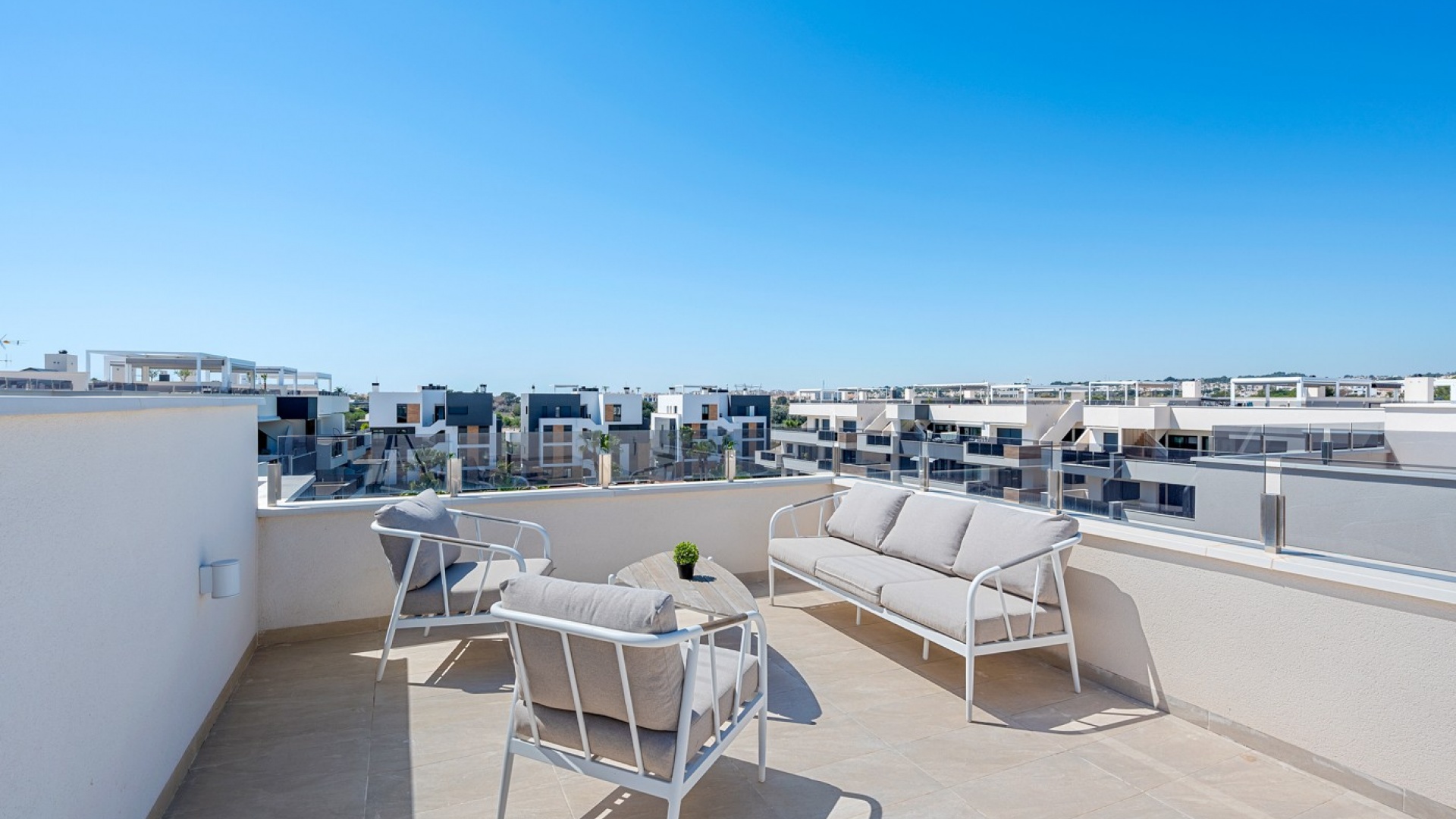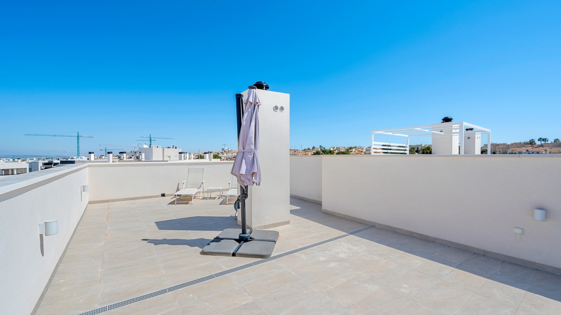 Die geräumige Terrasse bietet sowohl Privatsphäre als auch eine atemberaubende Aussicht. Sie verfügt über einen direkten Zugang vom Wohnzimmer und eine private Treppe, die zum Solarium auf dem Dach führt.