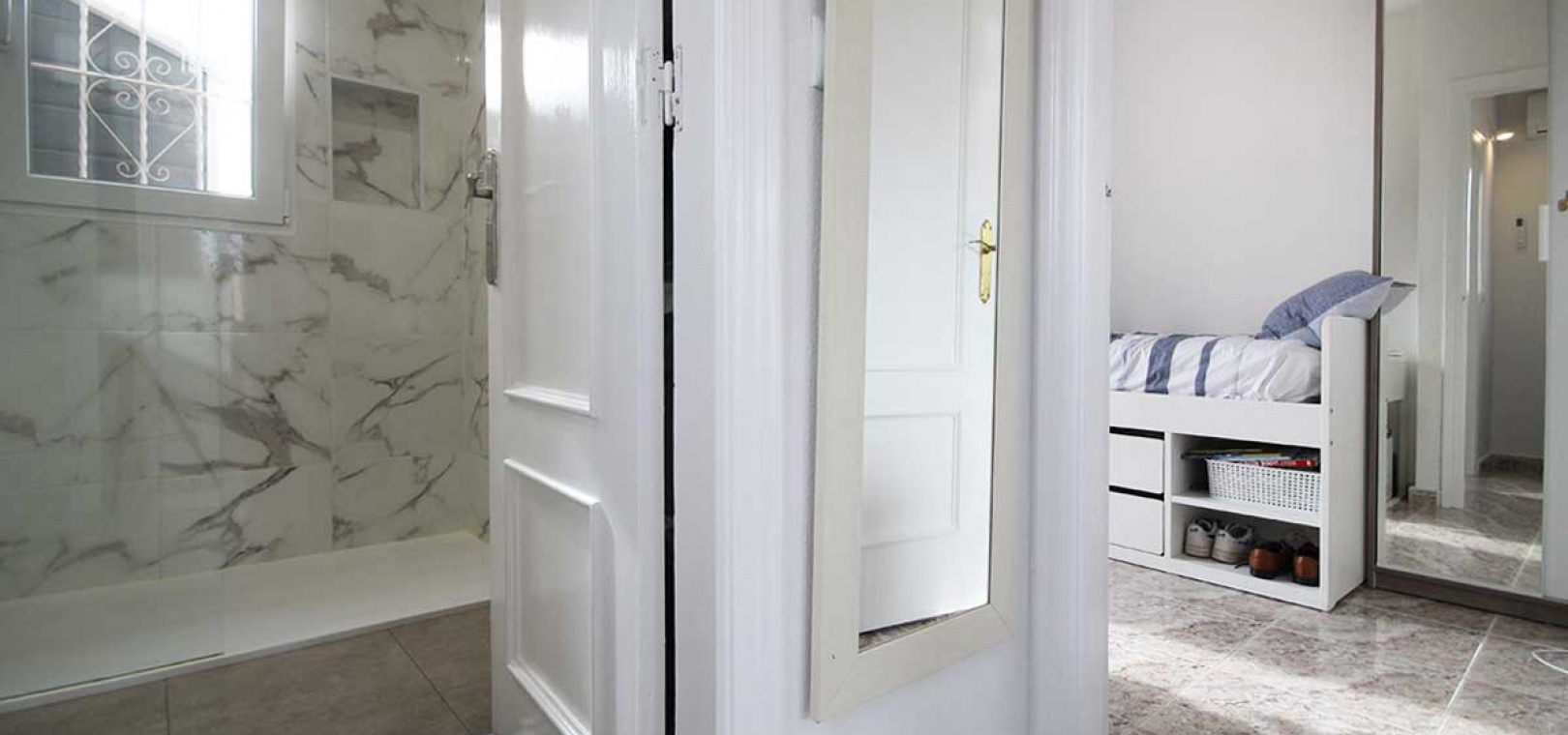Eine Innentreppe führt in den 1. Stock, wo sich 2 Doppelzimmer, beide mit Einbauschränken und privaten Balkonen, sowie 1 neu eingerichtetes Duschbad befinden.