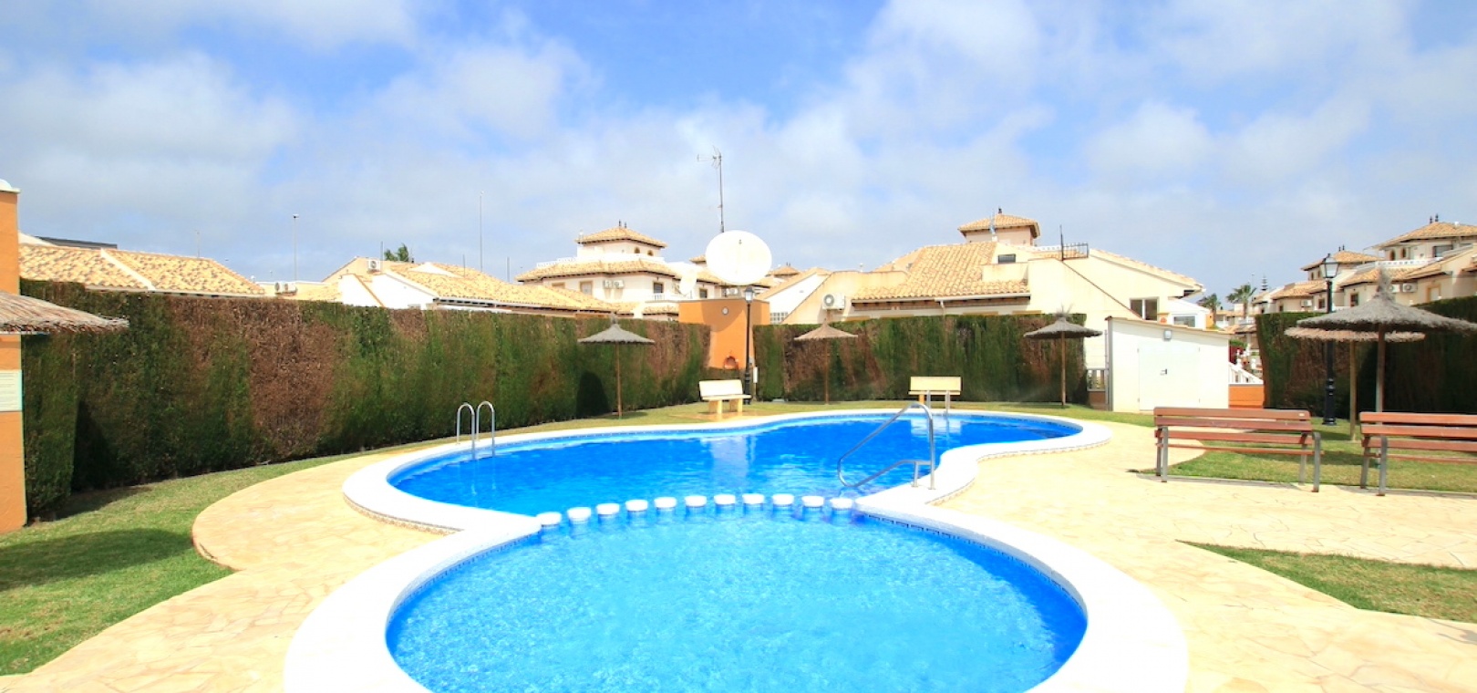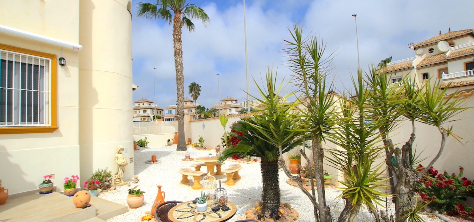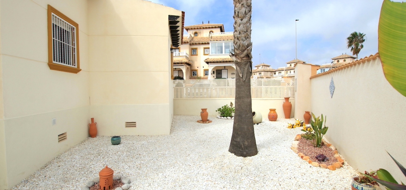 Die Villa befindet sich auf einem großzügigen Eckgrundstück und bietet reichlich sonnige und schattige Bereiche, die sich das ganze Jahr über perfekt zum Genießen eignen. Der gepflegte Bereich wurde mit Blick auf geringen Wartungsaufwand gestaltet. Zur Ausstattung gehören ein Parkplatz abseits der Straße, ein überdachter Ess- und Grillbereich, private Sitzbereiche, ein großer Abstellraum und auf Wunsch sogar Platz für einen privaten Swimmingpool! Stellen Sie sich vor, Sie wachen jeden Morgen auf und betreten Ihr ganz eigenes friedliches Refugium!