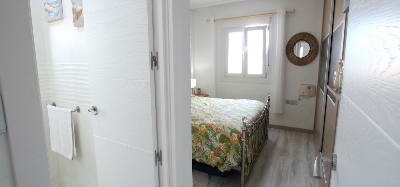 Das Gästezimmer ist ebenfalls geräumig und verfügt über Einbauschränke. Beide Schlafzimmer teilen sich ein schönes Familienbadezimmer mit ebenerdiger Dusche.