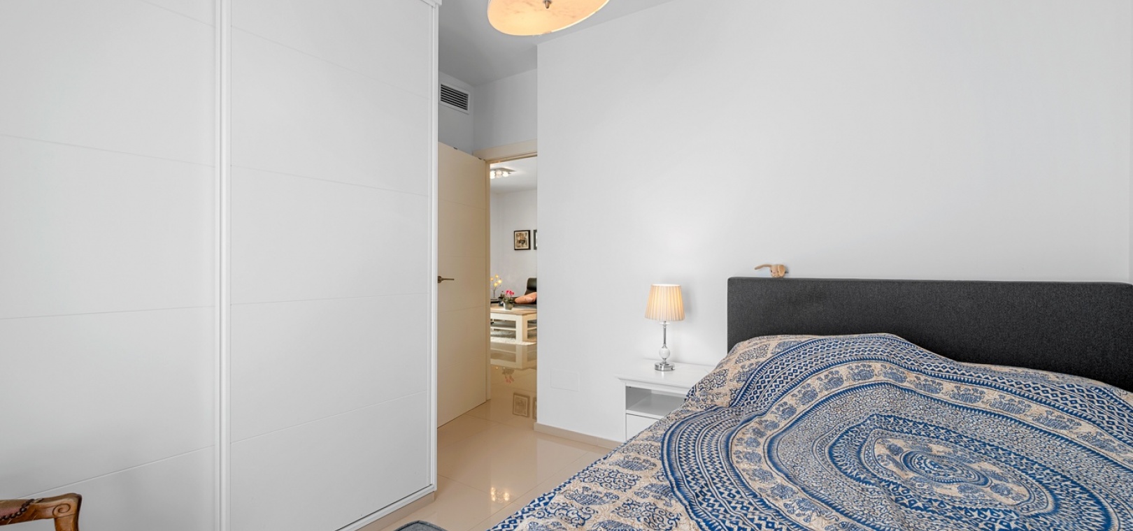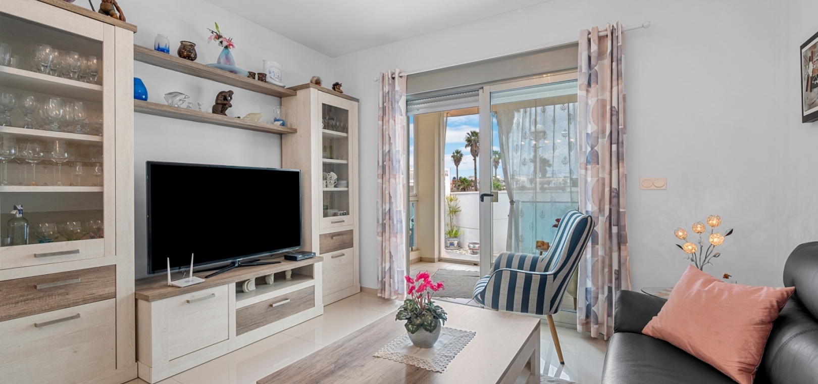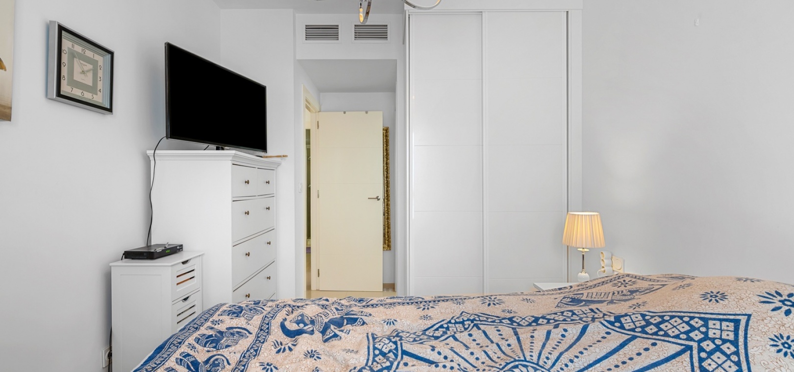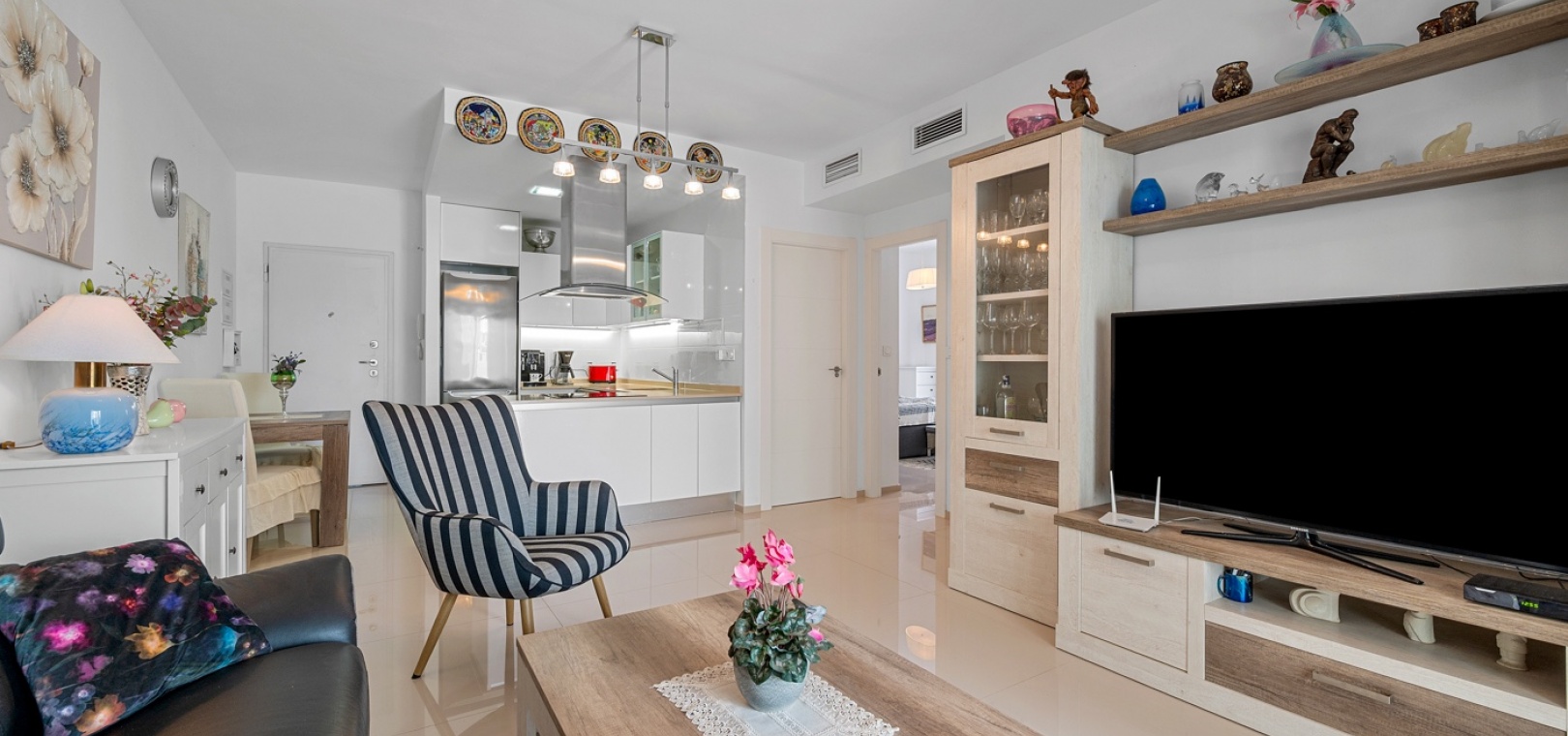 Die Wohnung verfügt über eine Wohnfläche von 80 m². Sie besteht aus zwei Doppelschlafzimmern mit Einbauschränken und zwei Badezimmern, von denen eines en-suite zum Hauptschlafzimmer liegt. Darüber hinaus besteht die Wohnung aus einer offenen Küche mit kleinem Essbereich und einem Wohnzimmer. Vom Wohnzimmer aus haben Sie Zugang zu einer verglasten Terrasse, die als zusätzlicher Wohnbereich dient.