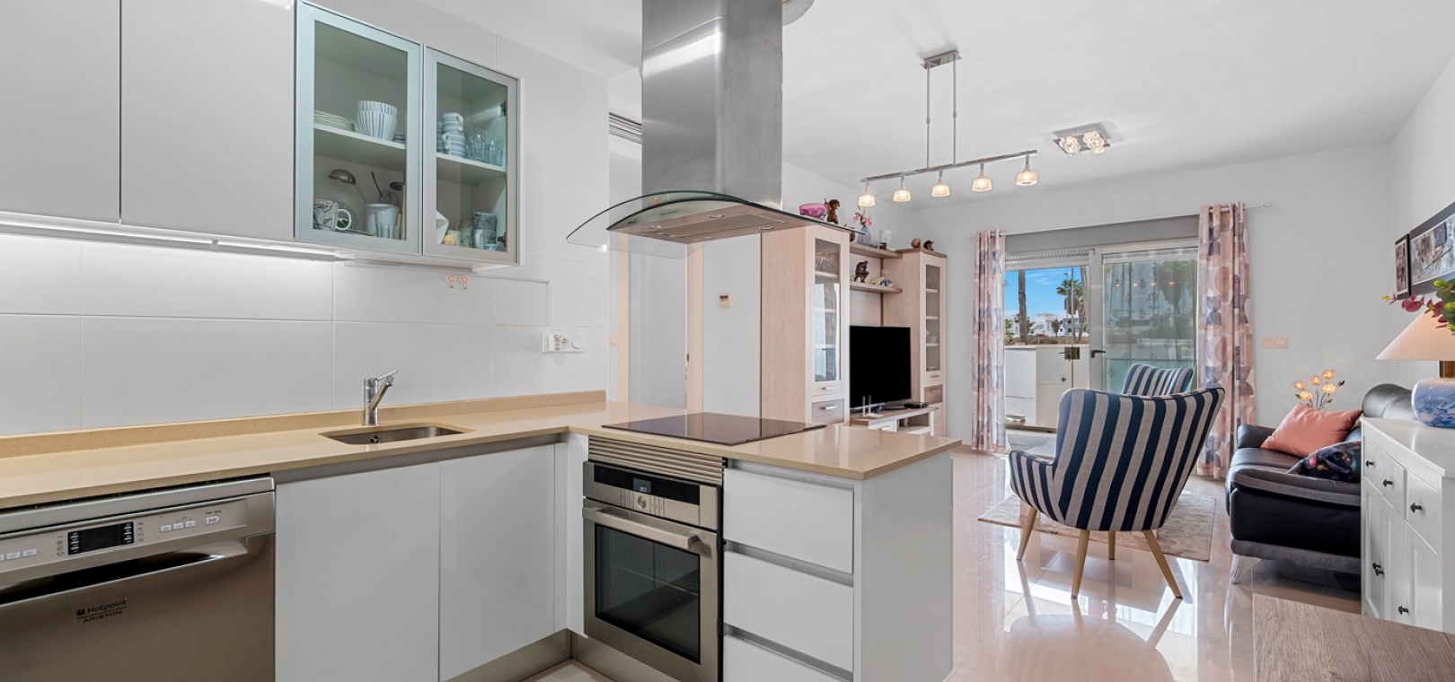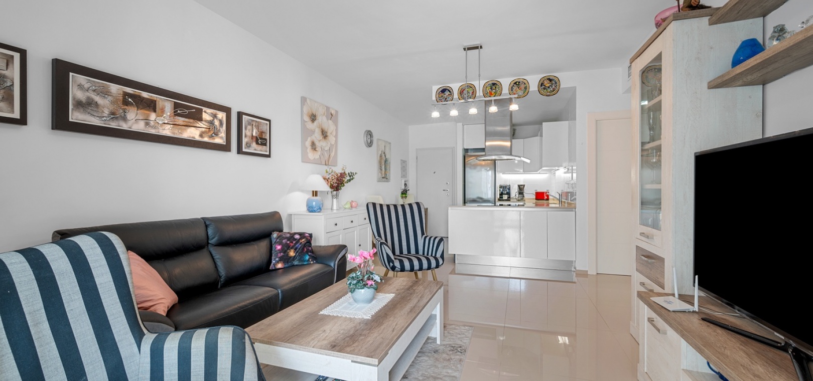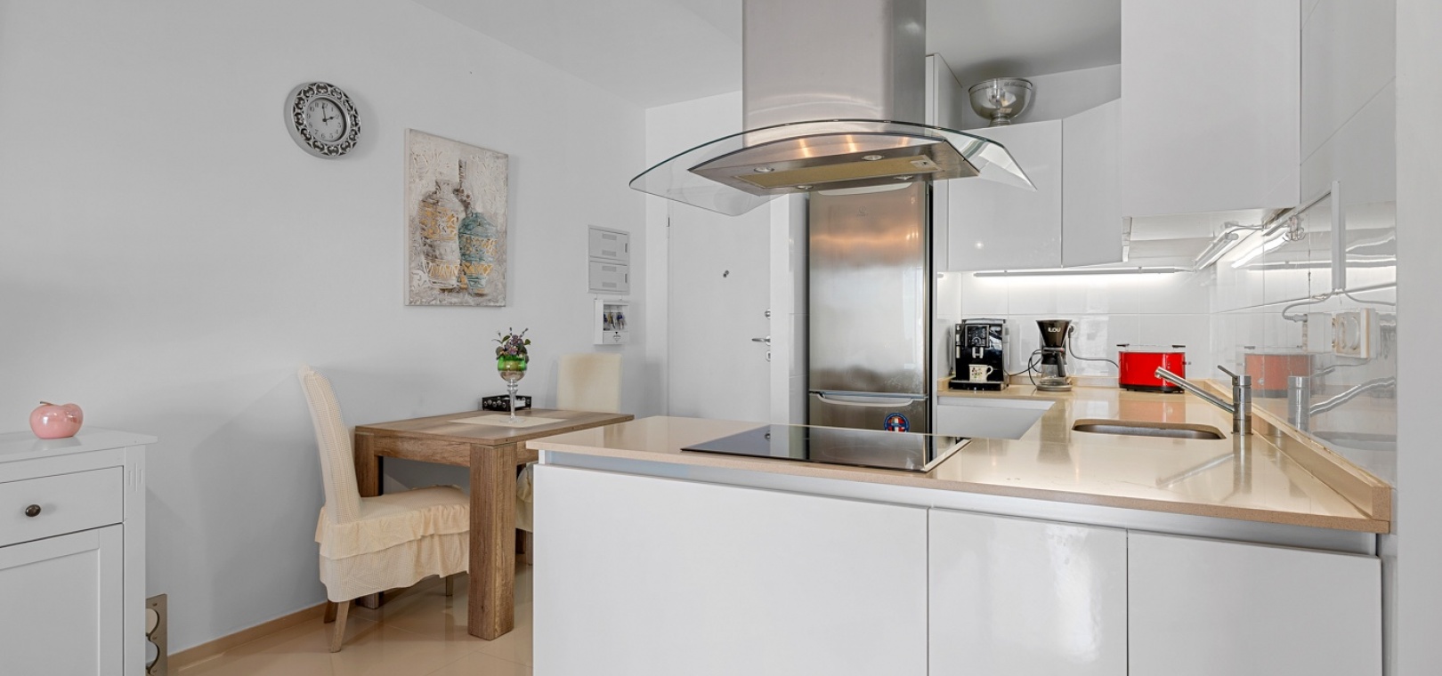 Die Wohnung verfügt über eine Wohnfläche von 80 m². Sie besteht aus zwei Doppelschlafzimmern mit Einbauschränken und zwei Badezimmern, von denen eines en-suite zum Hauptschlafzimmer liegt. Darüber hinaus besteht die Wohnung aus einer offenen Küche mit kleinem Essbereich und einem Wohnzimmer. Vom Wohnzimmer aus haben Sie Zugang zu einer verglasten Terrasse, die als zusätzlicher Wohnbereich dient.