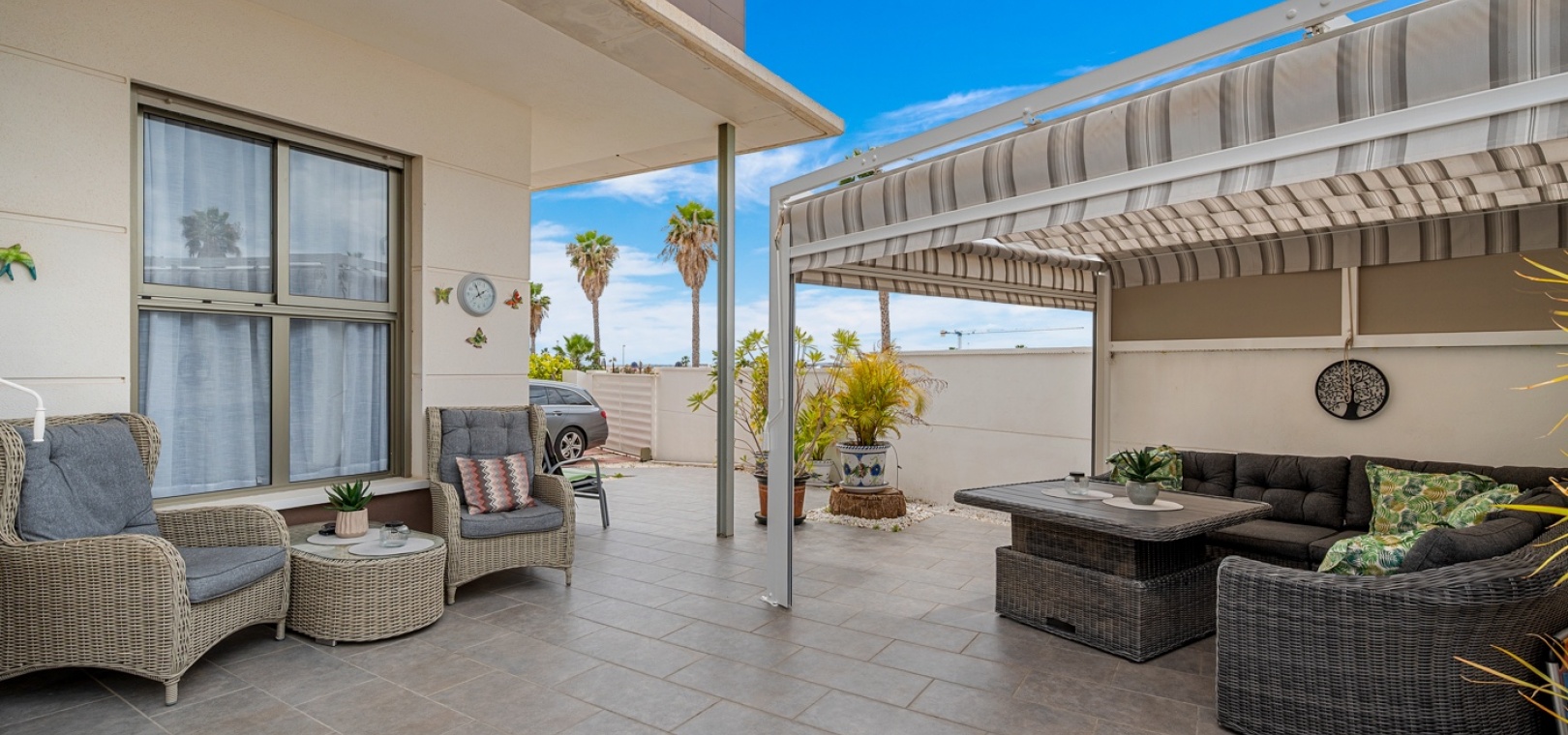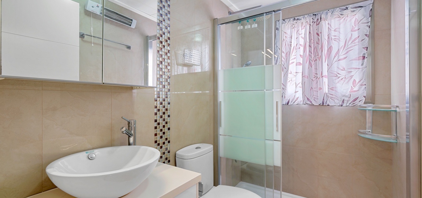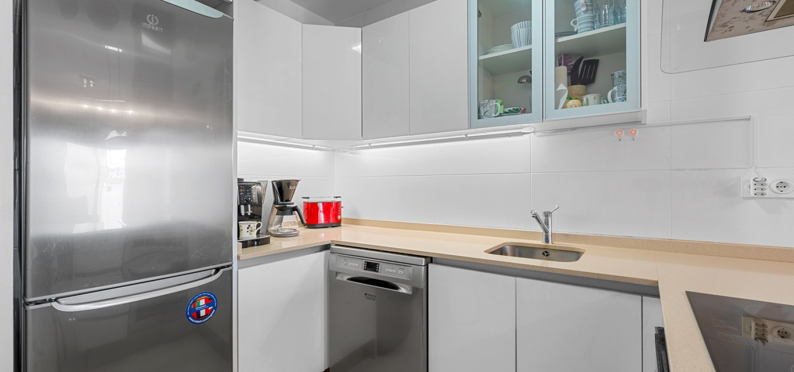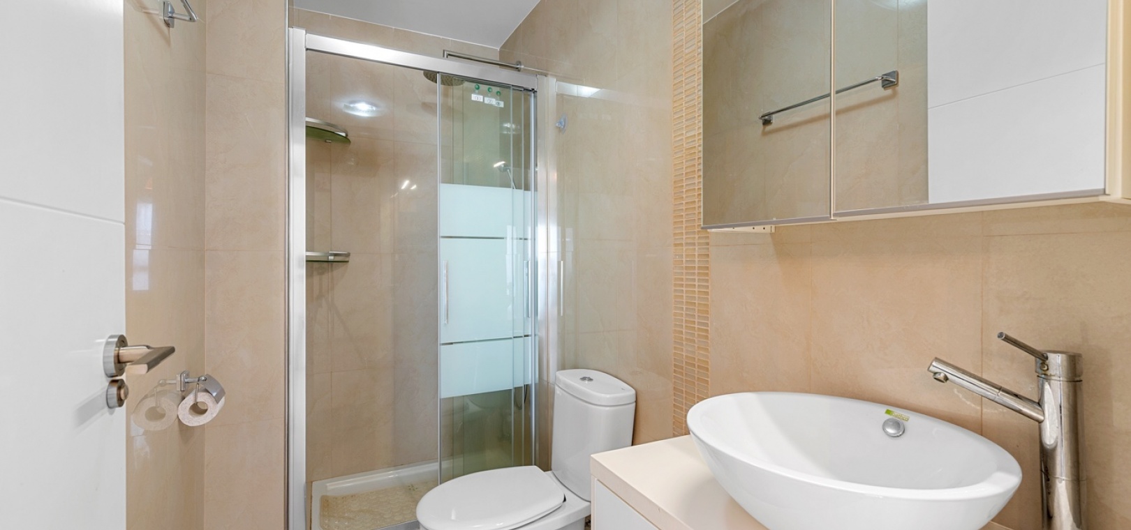 Die Wohnung verfügt über eine Wohnfläche von 80 m². Sie besteht aus zwei Doppelschlafzimmern mit Einbauschränken und zwei Badezimmern, von denen eines en-suite zum Hauptschlafzimmer liegt. Darüber hinaus besteht die Wohnung aus einer offenen Küche mit kleinem Essbereich und einem Wohnzimmer. Vom Wohnzimmer aus haben Sie Zugang zu einer verglasten Terrasse, die als zusätzlicher Wohnbereich dient.