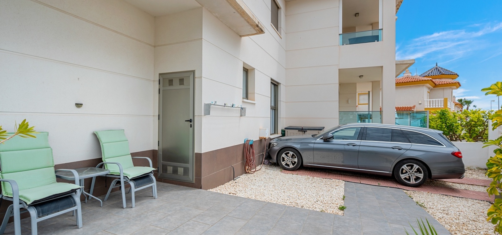 AußenbereichDie Wohnung verfügt über einen großen Eckgarten von 105 m2. Hier finden Sie einen Hauswirtschaftsraum, Parkplätze auf dem Grundstück und einen überdachten Außensitzplatz. Vom Garten aus haben Sie direkten Zugang zu den Gemeinschaftsbereichen, wo Sie einen Swimmingpool und Platz rund um den Pool zum Entspannen finden.