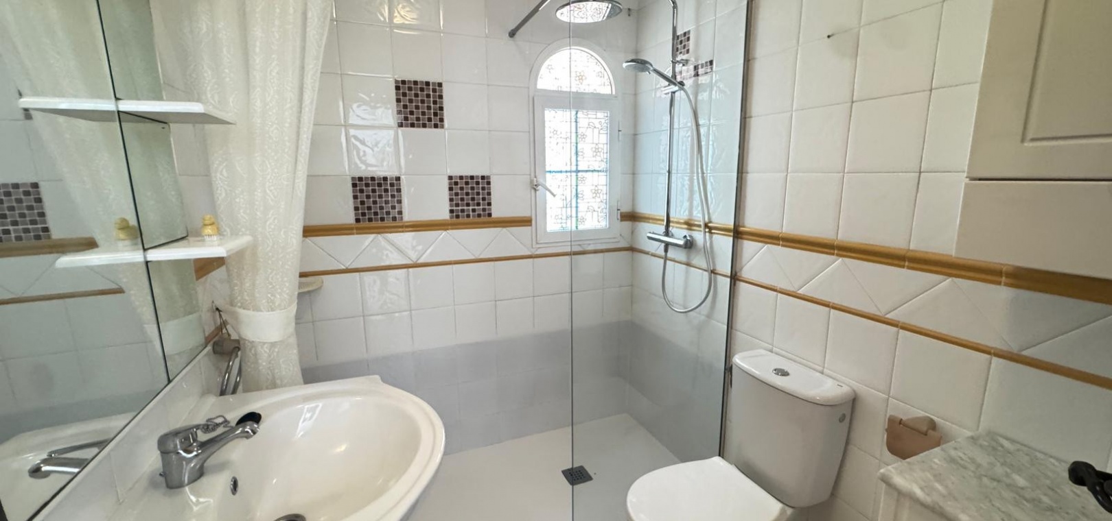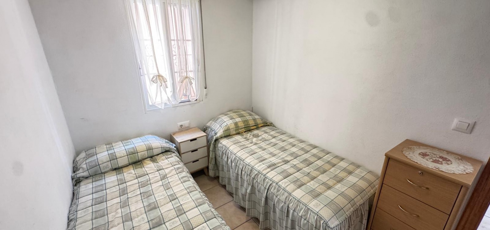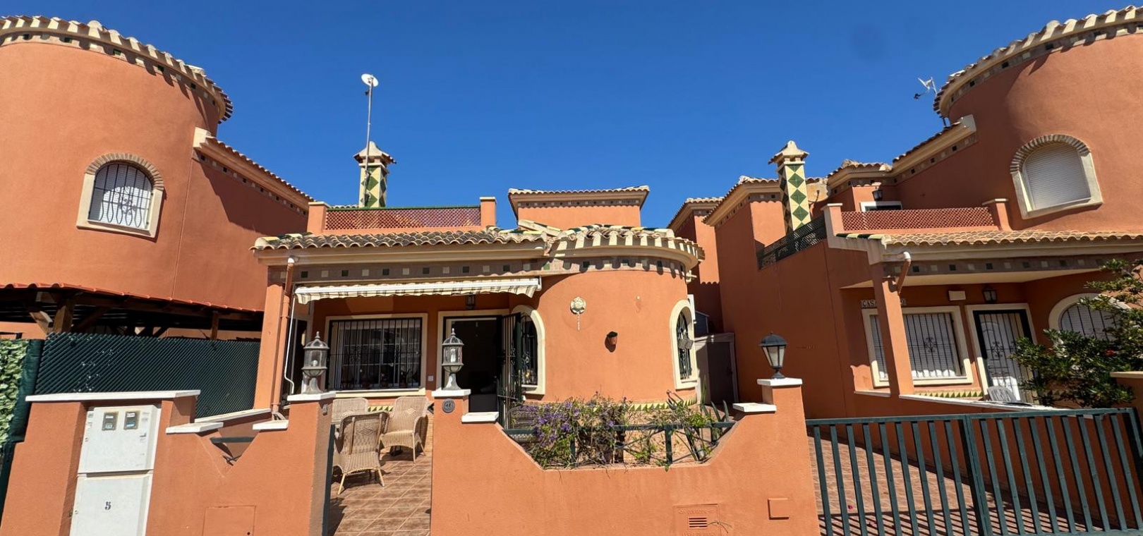 Draußen gibt es eine geflieste Vorderterrasse mit Sonnenmarkise, einen gefliesten Seitengarten/eine geflieste Auffahrt und Stufen, die zum privaten Solarium auf dem Dach führen, das den ganzen Tag Sonne bekommt.