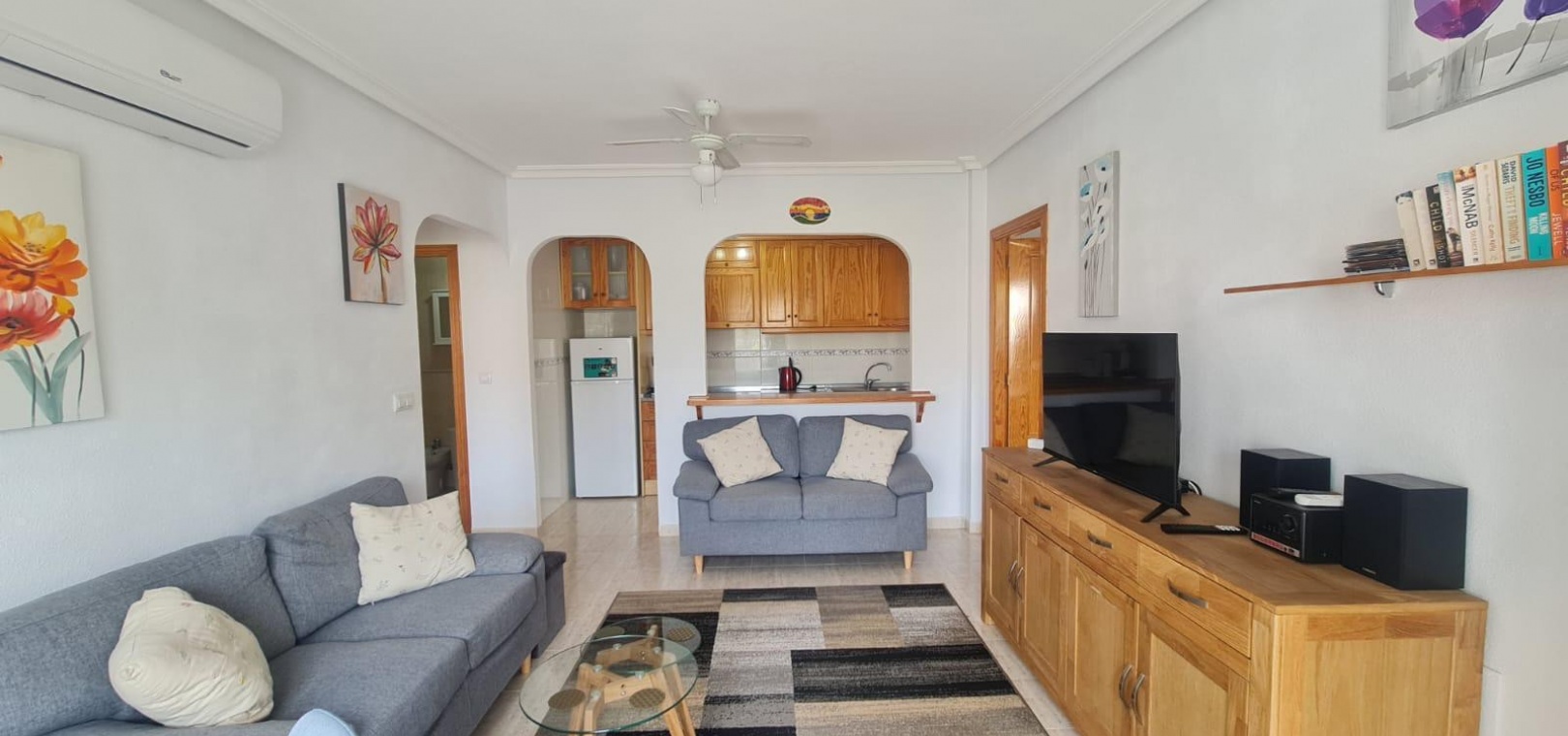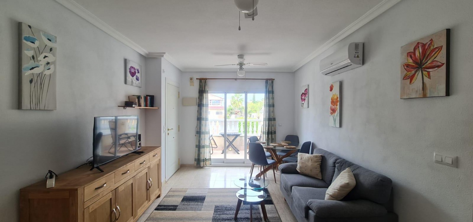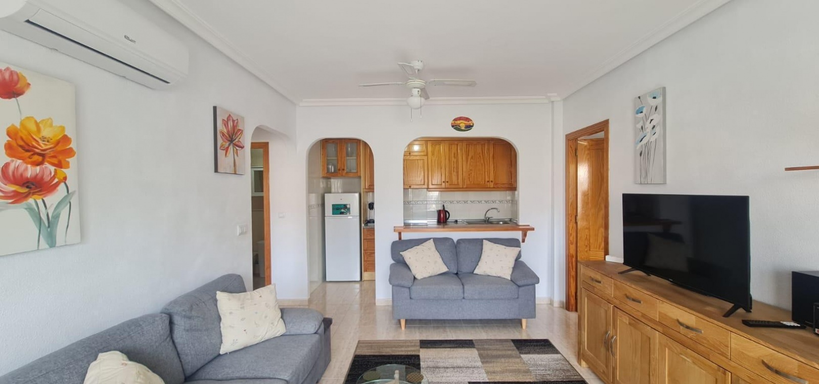 Wohn-/Esszimmer mit Klimaanlage (warm und kalt), offene Küche, separater Hauswirtschaftsraum, Abstellraum, Balkon neben dem Wohnzimmer, 2 Doppelschlafzimmer, 1 Familienbadezimmer, privater Swimmingpool und vieles mehr.