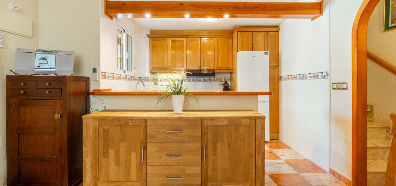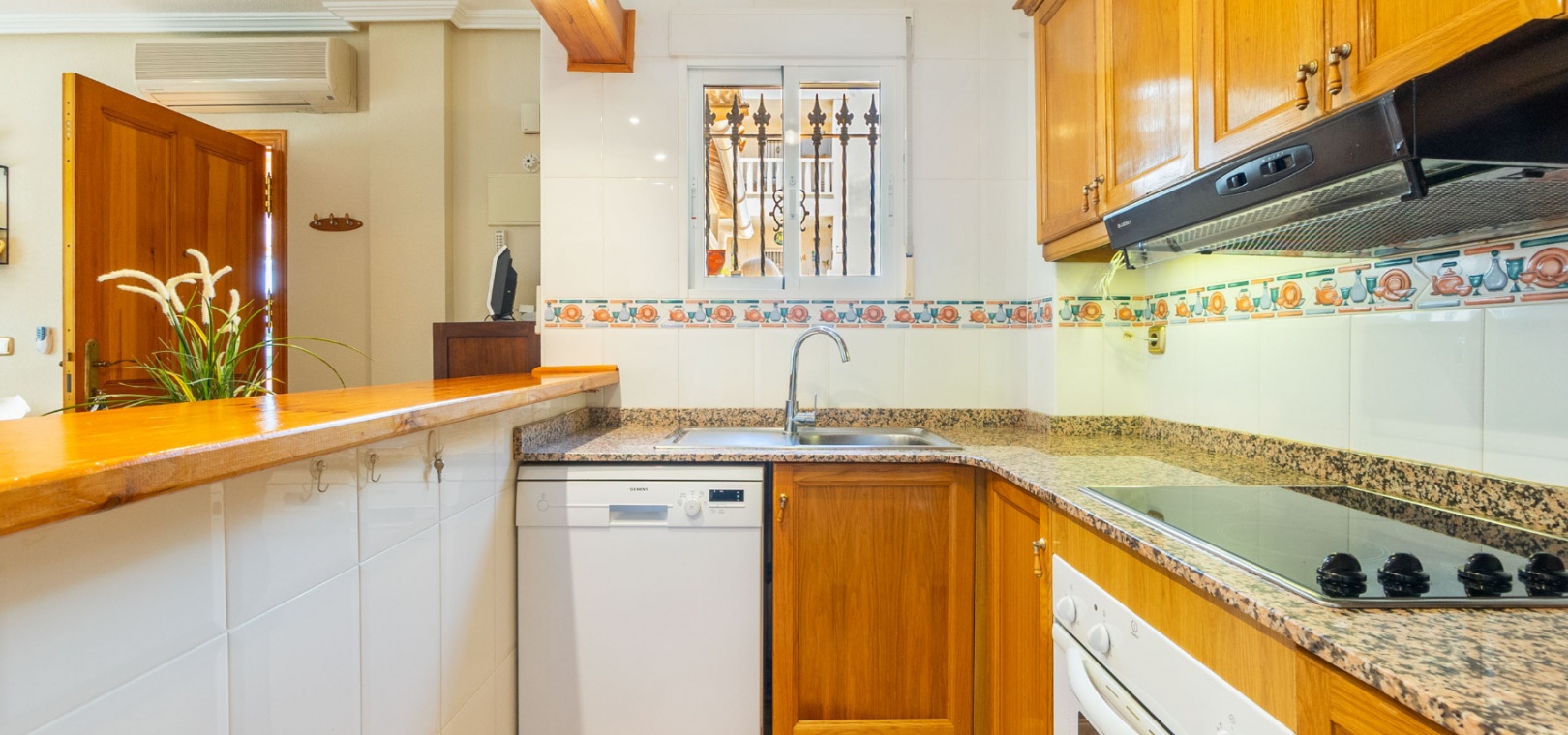 Im Erdgeschoss gibt es einen L-förmigen Wohn-/Essbereich mit Klimaanlage (warm und kalt), offener, voll ausgestatteter Küche und 1 x Toilette.