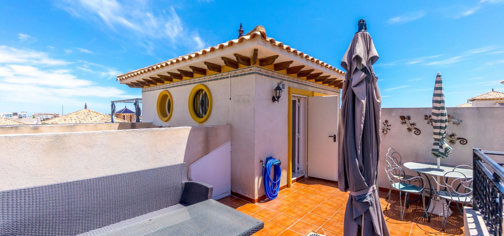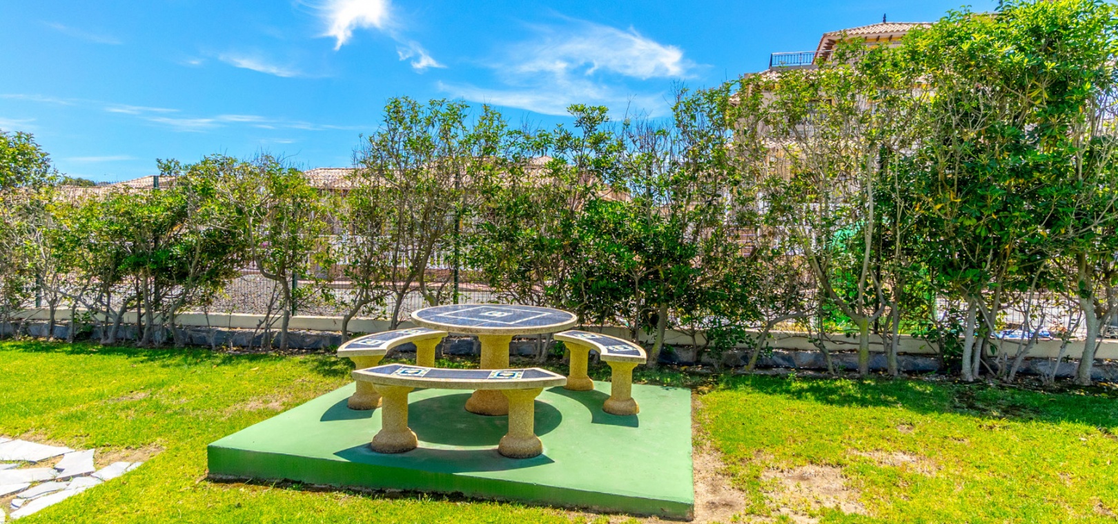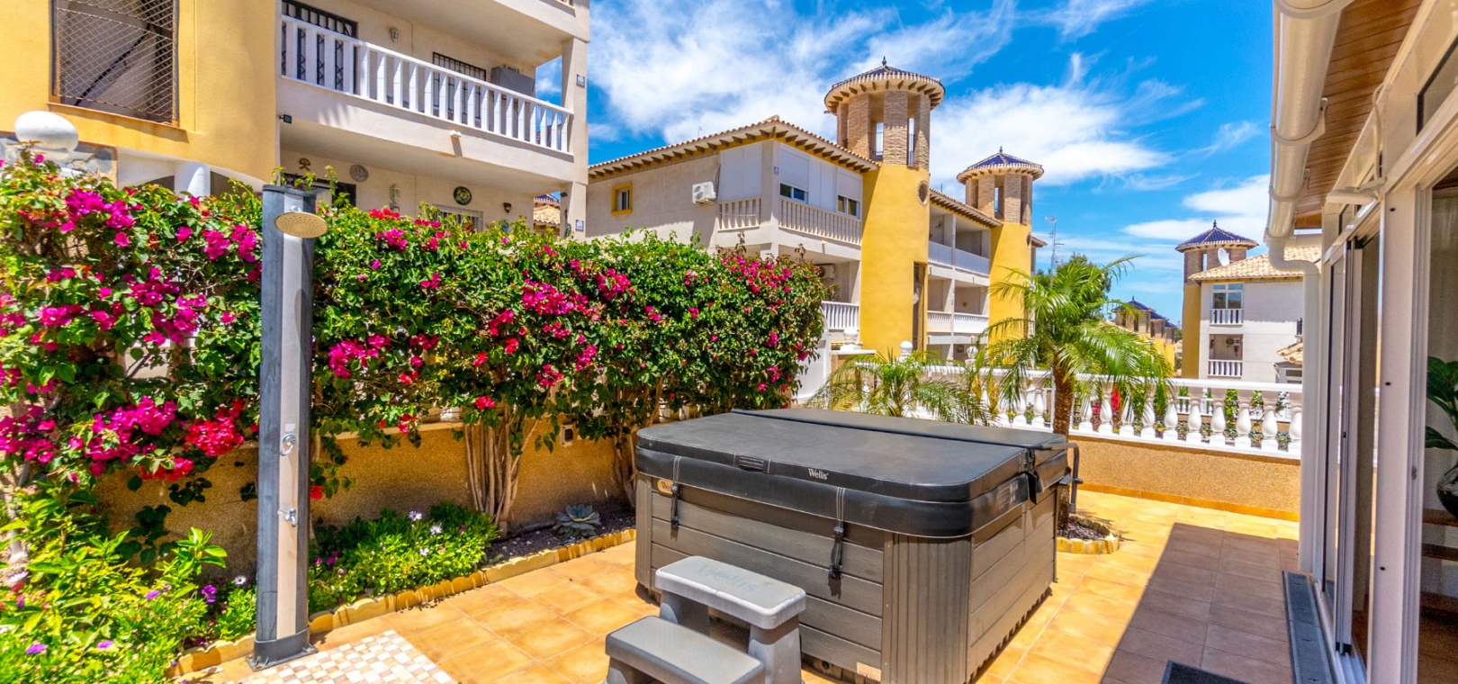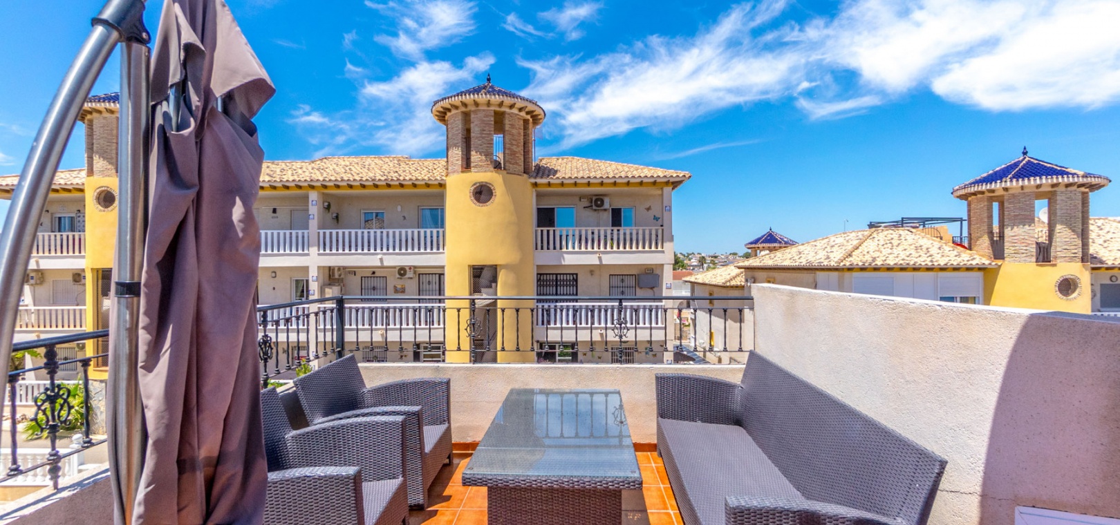 Ein nach Süden ausgerichtetes Vierfamilienhaus mit 2 Schlafzimmern, 1,5 Bädern und privatem Solarium auf dem Dach in Pinada Golf II, Villamartin, Costa Blanca Süd.