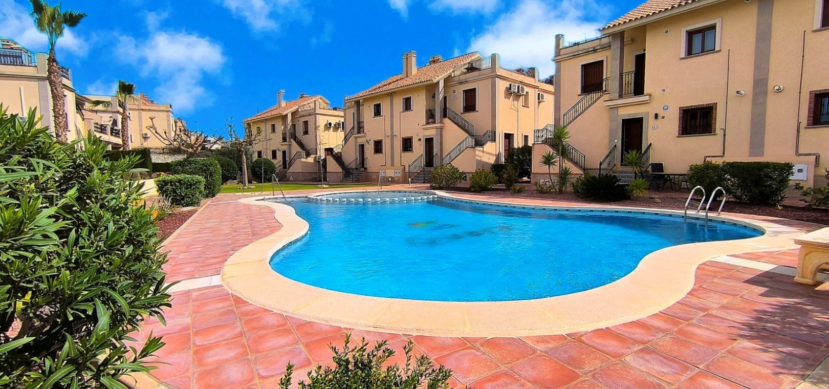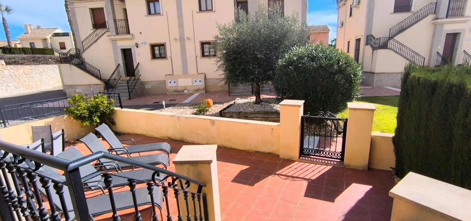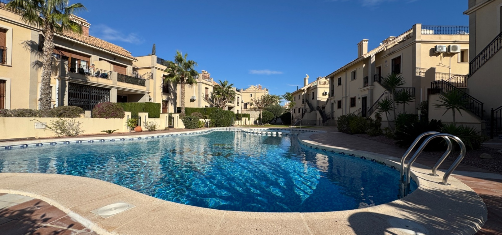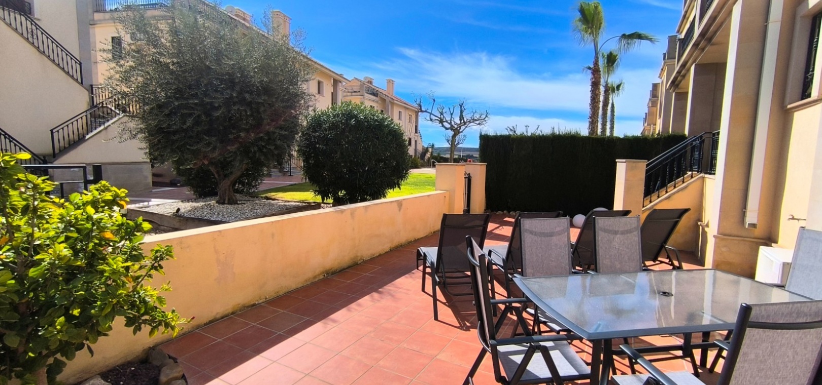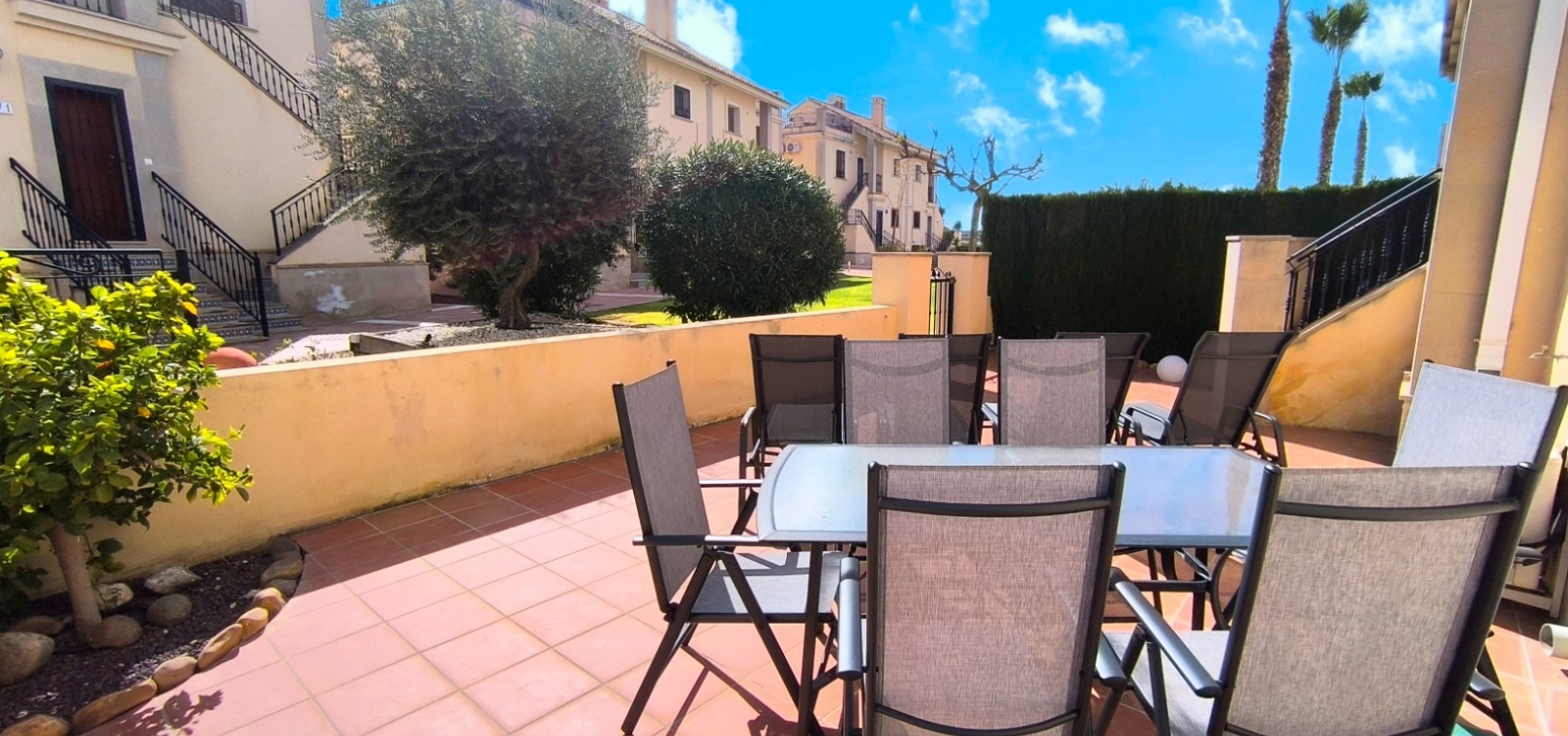 **Charmante Erdgeschosswohnung im La Finca Golf Resort, Algorfa** Entdecken Sie die perfekte Mischung aus Luxus und Ruhe mit dieser exquisiten Erdgeschosswohnung im renommierten 5-Sterne-Golfresort La Finca in Algorfa. Eingebettet in atemberaubende Natur und majestätische Berge ist dieses Anwesen Teil einer exklusiven Anlage mit nur 25 Häusern. Genießen Sie den ruhigen Lebensstil mit Zugang zu einem makellosen Gemeinschaftspool und wunderschön gepflegten Gärten. Im Inneren erwartet Sie ein geräumiges Wohnzimmer mit integriertem Essbereich – ideal für geselliges Beisammensein. Die gut ausgestattete Küche mit modernen Unter- und Oberschränken sowie hochwertigen Geräten erfüllt alle Ihre kulinarischen Wünsche. Die Wohnung bietet zwei Doppelschlafzimmer mit Einbauschränken, während die Master-Suite über ein eigenes Bad verfügt. Ein zweites gefliestes Badezimmer bietet eine Dusche über der Badewanne für zusätzlichen Komfort. Genießen Sie den ruhigen Außenbereich mit Blick auf die üppigen Gemeinschaftsgärten und den atemberaubenden Pool – ideal zum Entspannen. Dank der Nähe zu Bars, Restaurants und einem Supermarkt ist alles, was Sie brauchen, bequem zu erreichen. Die Lage ist hervorragend erreichbar: Die Autobahn AP7 ist nur 10 Minuten entfernt, der Flughafen Alicante ist direkt erreichbar und die mit der Blauen Flagge ausgezeichneten Strände sind nur 15-20 Autominuten entfernt. Diese 2007 erbaute und in ausgezeichnetem Zustand befindliche Südwohnung verfügt über einen Parkplatz und ist mit Klimaanlage und Wärmepumpe für ganzjährigen Komfort ausgestattet. Mit der Energieeffizienzklasse E verbindet dieses Haus Komfort mit Effizienz. Lassen Sie sich diese Gelegenheit nicht entgehen und erwerben Sie ein Stück Paradies in einem der begehrtesten Golfresorts Spaniens!
