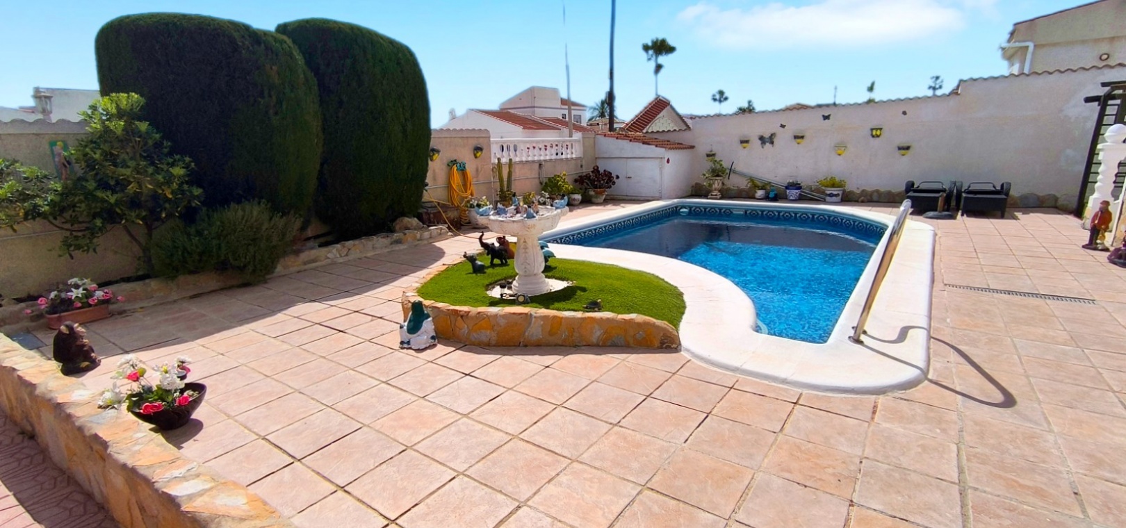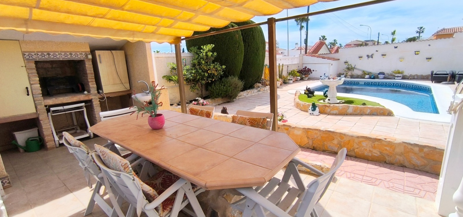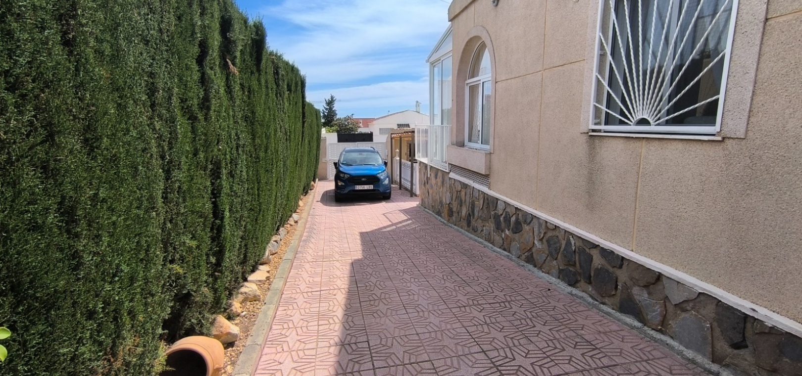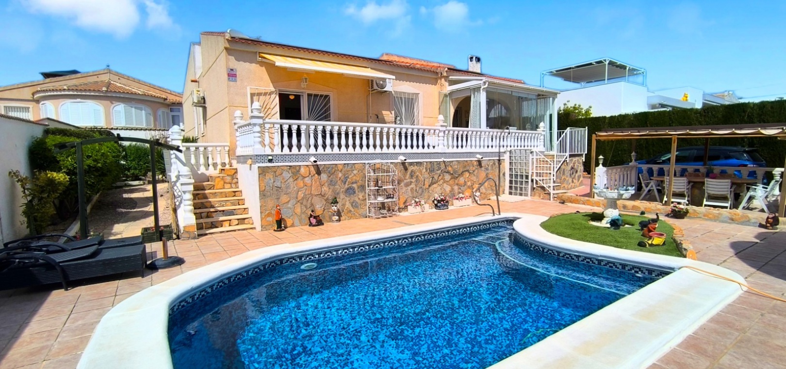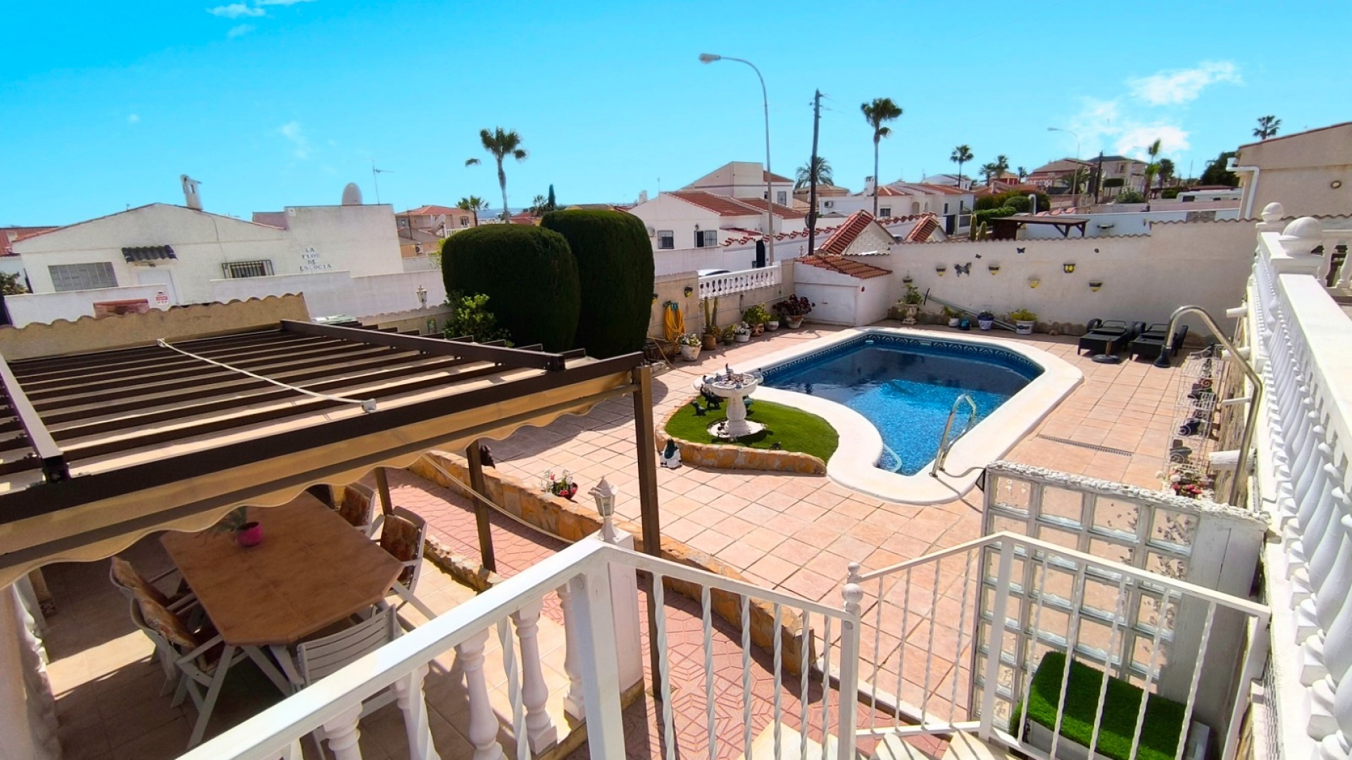 Suchen Sie ein geräumiges Familienhaus in einer ruhigen Wohngegend? Dann werfen Sie einen Blick auf diese traditionell spanische freistehende Villa in Ciudad Quesada! Es wird als Drei-Zimmer-Haus präsentiert, könnte aber leicht in ein Vier-Zimmer-Haus umgewandelt werden, das viel Platz für die ganze Familie bietet! Das Anwesen liegt nur einen kurzen Spaziergang von allen Einrichtungen in Ciudad Quesada entfernt, darunter eine Reihe von Bars, Restaurants, Supermärkten und vielem mehr! Betreten Sie das private, nach Süden ausgerichtete Grundstück und Sie werden sofort von einem schönen, privaten 5x4 Meter großen Pool begrüßt, der an sonnigen Sommertagen ideal zum Abkühlen ist. Rund um den Pool gibt es viel Platz zum Sitzen und Entspannen, zum Genießen der gepflegten Gärten und zur Nutzung der Sommerküche mit eingebautem Grill und speziell angefertigtem Tisch. Eine Auffahrt mit elektrischem Tor bietet private Parkplätze abseits der Straße für mehrere Fahrzeuge. Über wenige Stufen gelangen Sie zum Hauseingang. Über eine sonnige Terrasse mit Glasvorhängen, die geöffnet und geschlossen werden können, gelangen Sie in den Raum. Dieser Raum ist ideal für den Winter, da er den ganzen Tag Sonne hat und angenehm warm bleibt. Vom Wintergarten aus gelangt man in ein geräumiges Wohnzimmer mit einem gemütlichen Eckkamin und Klimaanlage. Die voll ausgestattete Küche verfügt über mehrere Ober- und Unterschränke, einen eingebauten Backofen/Kochfeld, eine Dunstabzugshaube und einen freistehenden Geschirrspüler. Angrenzend an die Küche befindet sich ein großer Hauswirtschaftsraum mit Speisekammer und Anschlussmöglichkeiten für Waschmaschine und Trockner sowie ein amerikanischer Kühl-Gefrierschrank mit gefiltertem Wasser. Eine Treppe führt zum Garten und zur Auffahrt. Ein innerer Flur führt vom Wohnzimmer zu den Schlafzimmern. Dort befinden sich zwei Master-Suiten, beide mit eigenem Bad. Die Master-Suite hat Zugang zu einer schönen, erhöhten Terrasse, ideal für den Morgenkaffee! Es gibt ein weiteres Doppelschlafzimmer mit Familienbad sowie ein potenzielles viertes Schlafzimmer – derzeit als offenes Büro genutzt. Alle Schlafzimmer verfügen über Einbauschränke und Klimaanlage. Das Anwesen befindet sich in einer erstklassigen Wohngegend, in der Nähe zahlreicher Annehmlichkeiten für die ganze Familie und verfügt über Extras wie Solarmodule zur Senkung der Stromrechnung, ein vollständiges Alarmsystem sowie Erdgas.