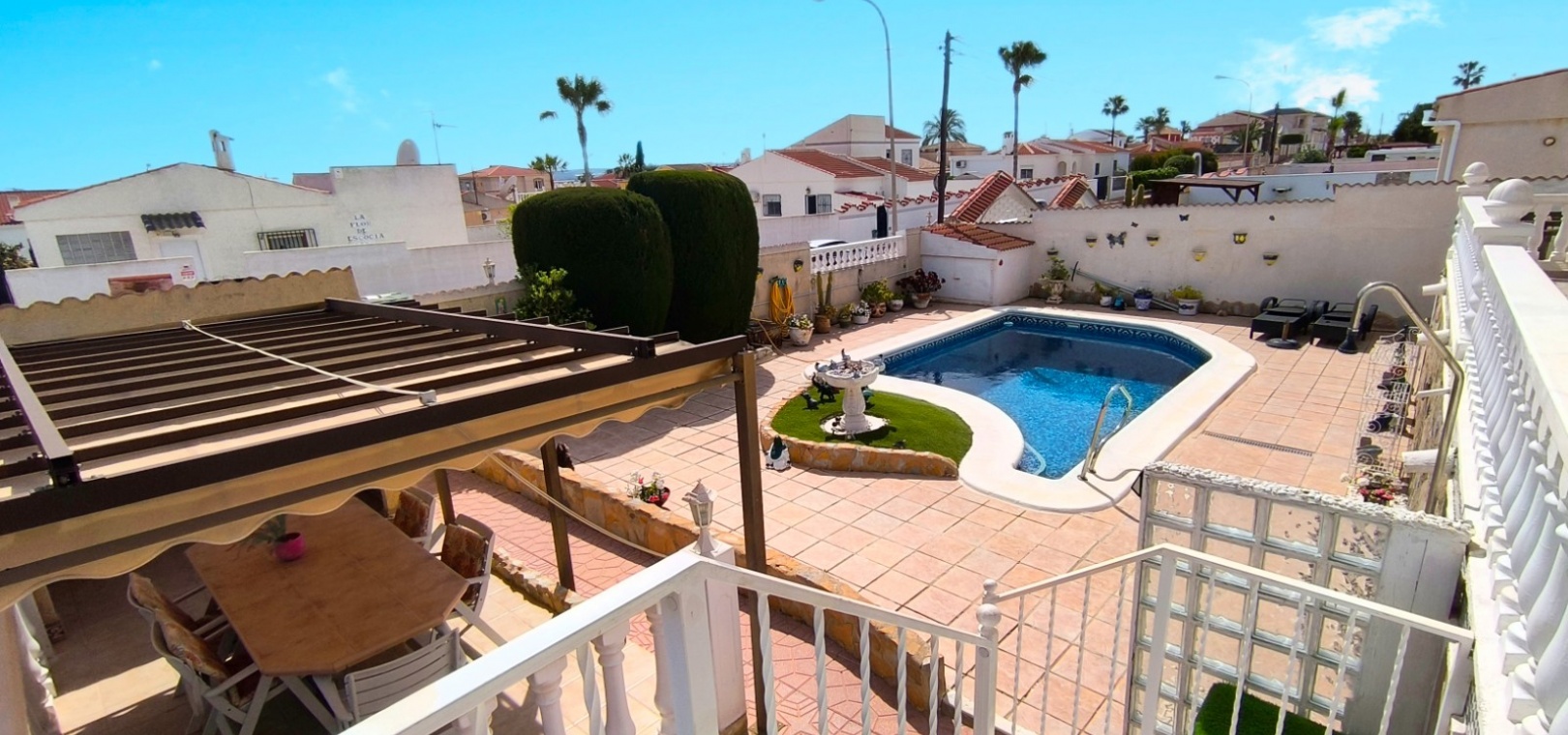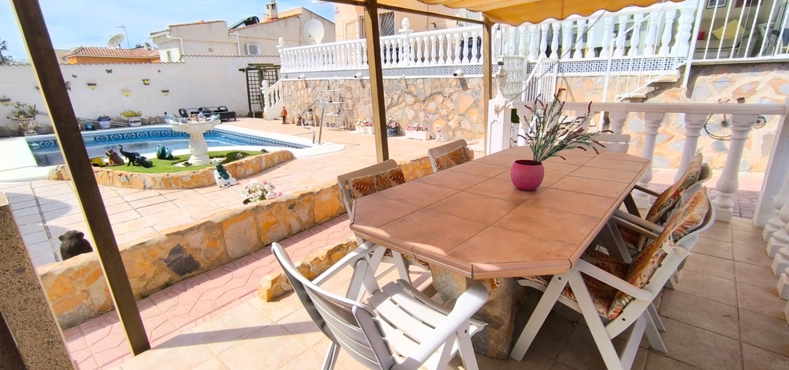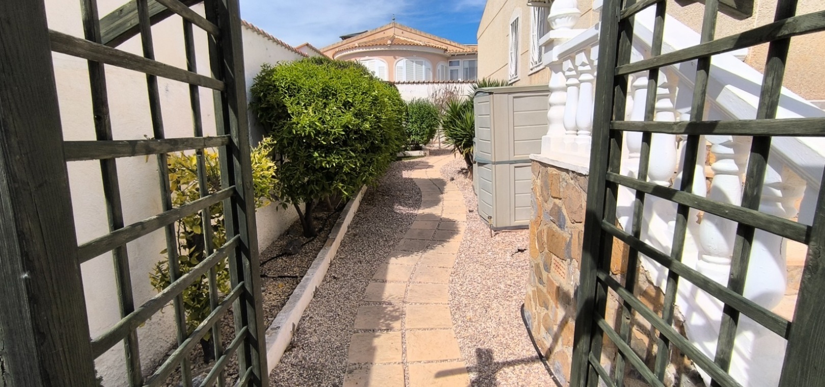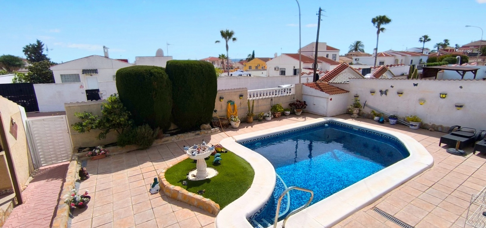 Suchen Sie ein geräumiges Familienhaus in einer ruhigen Wohngegend? Dann werfen Sie einen Blick auf diese traditionell spanische freistehende Villa in Ciudad Quesada! Es wird als Drei-Zimmer-Haus präsentiert, könnte aber leicht in ein Vier-Zimmer-Haus umgewandelt werden, das viel Platz für die ganze Familie bietet! Das Anwesen liegt nur einen kurzen Spaziergang von allen Einrichtungen in Ciudad Quesada entfernt, darunter eine Reihe von Bars, Restaurants, Supermärkten und vielem mehr! Betreten Sie das private, nach Süden ausgerichtete Grundstück und Sie werden sofort von einem schönen, privaten 5x4 Meter großen Pool begrüßt, der an sonnigen Sommertagen ideal zum Abkühlen ist. Rund um den Pool gibt es viel Platz zum Sitzen und Entspannen, zum Genießen der gepflegten Gärten und zur Nutzung der Sommerküche mit eingebautem Grill und speziell angefertigtem Tisch. Eine Auffahrt mit elektrischem Tor bietet private Parkplätze abseits der Straße für mehrere Fahrzeuge. Über wenige Stufen gelangen Sie zum Hauseingang. Über eine sonnige Terrasse mit Glasvorhängen, die geöffnet und geschlossen werden können, gelangen Sie in den Raum. Dieser Raum ist ideal für den Winter, da er den ganzen Tag Sonne hat und angenehm warm bleibt. Vom Wintergarten aus gelangt man in ein geräumiges Wohnzimmer mit einem gemütlichen Eckkamin und Klimaanlage. Die voll ausgestattete Küche verfügt über mehrere Ober- und Unterschränke, einen eingebauten Backofen/Kochfeld, eine Dunstabzugshaube und einen freistehenden Geschirrspüler. Angrenzend an die Küche befindet sich ein großer Hauswirtschaftsraum mit Speisekammer und Anschlussmöglichkeiten für Waschmaschine und Trockner sowie ein amerikanischer Kühl-Gefrierschrank mit gefiltertem Wasser. Eine Treppe führt zum Garten und zur Auffahrt. Ein innerer Flur führt vom Wohnzimmer zu den Schlafzimmern. Dort befinden sich zwei Master-Suiten, beide mit eigenem Bad. Die Master-Suite hat Zugang zu einer schönen, erhöhten Terrasse, ideal für den Morgenkaffee! Es gibt ein weiteres Doppelschlafzimmer mit Familienbad sowie ein potenzielles viertes Schlafzimmer – derzeit als offenes Büro genutzt. Alle Schlafzimmer verfügen über Einbauschränke und Klimaanlage. Das Anwesen befindet sich in einer erstklassigen Wohngegend, in der Nähe zahlreicher Annehmlichkeiten für die ganze Familie und verfügt über Extras wie Solarmodule zur Senkung der Stromrechnung, ein vollständiges Alarmsystem sowie Erdgas.