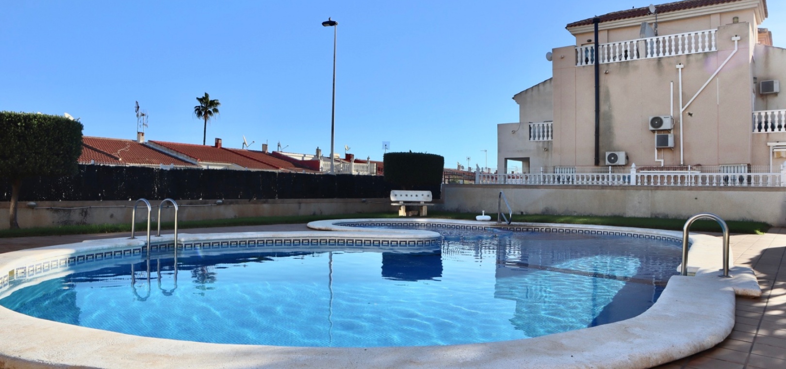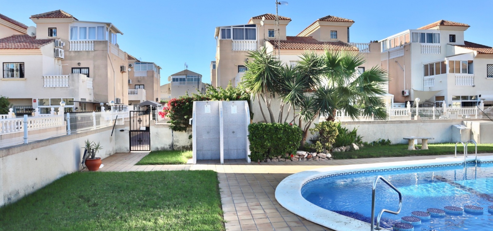 Durch die Südausrichtung genießt das Haus den ganzen Tag über reichlich Tageslicht. Die Immobilie liegt in einer gepflegten und ruhigen Wohnanlage und bietet Zugang zu einem Gemeinschaftspool und Grünflächen. Damit eignet sie sich ideal als Ferienhaus oder ganzjähriger Wohnsitz.