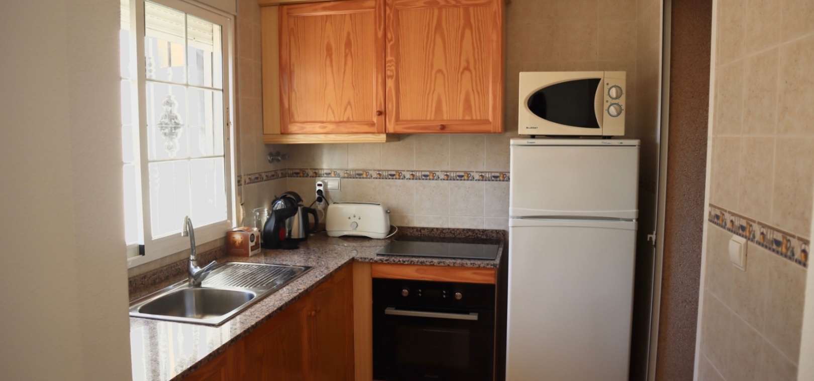 Das Haus bietet eine Wohnfläche von 66 m², verteilt auf zwei Ebenen, mit zwei Schlafzimmern und zwei Badezimmern. Der helle und einladende Wohn-Essbereich ist mit Klimaanlage und einem Schlafsofa ausgestattet – ideal für Gäste. Die separate Küche ist komplett ausgestattet und verfügt über einen geräumigen Hauswirtschaftsraum, der auch als zusätzlicher Stauraum dienen kann.