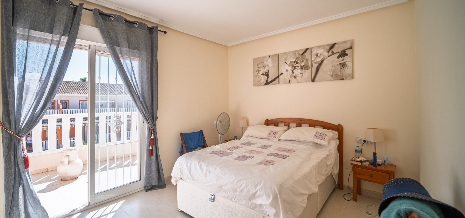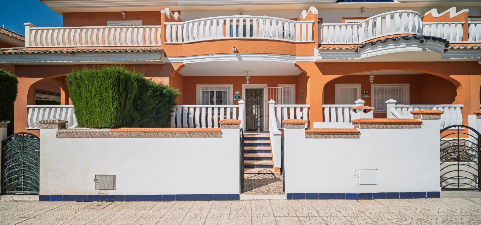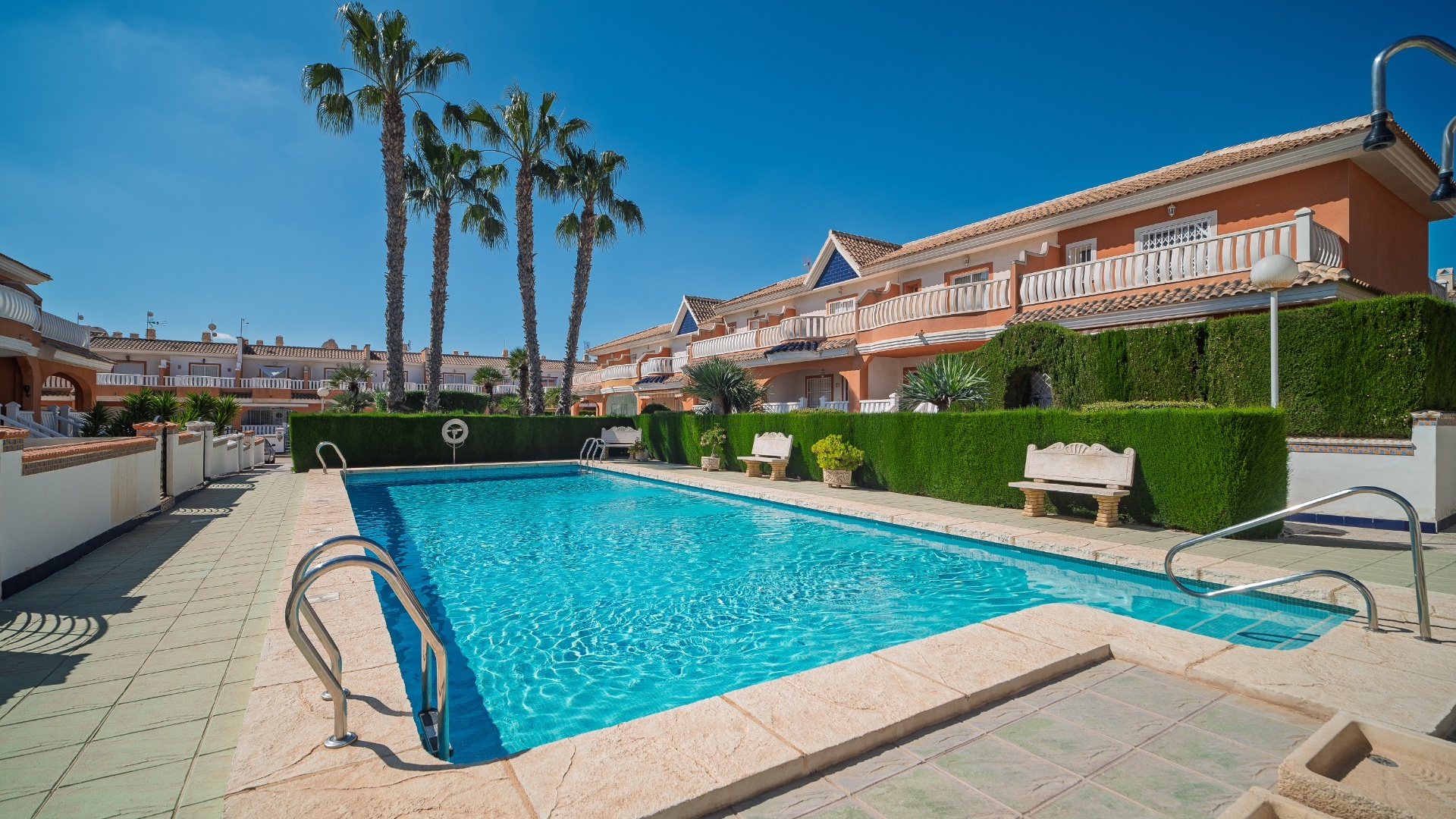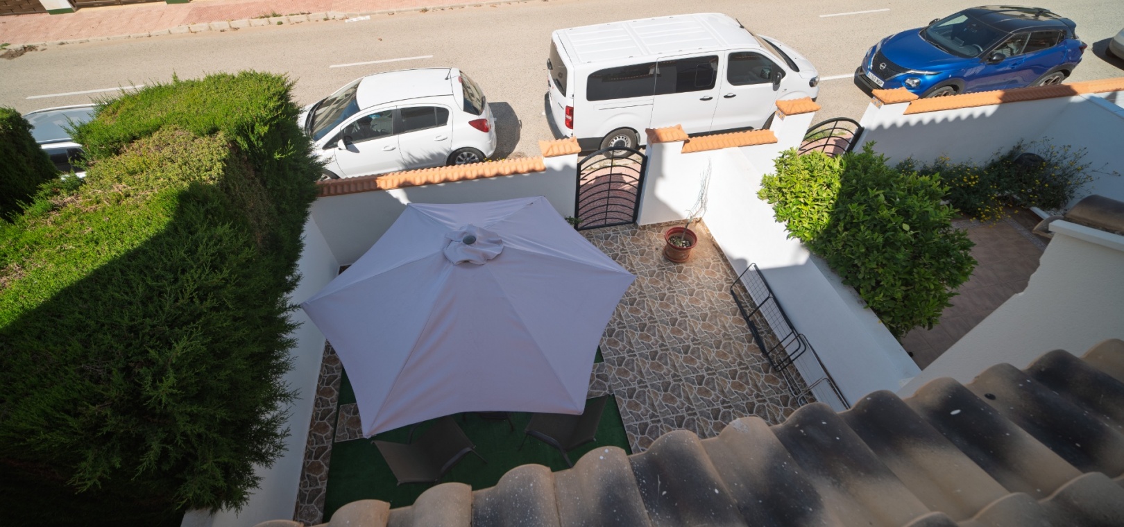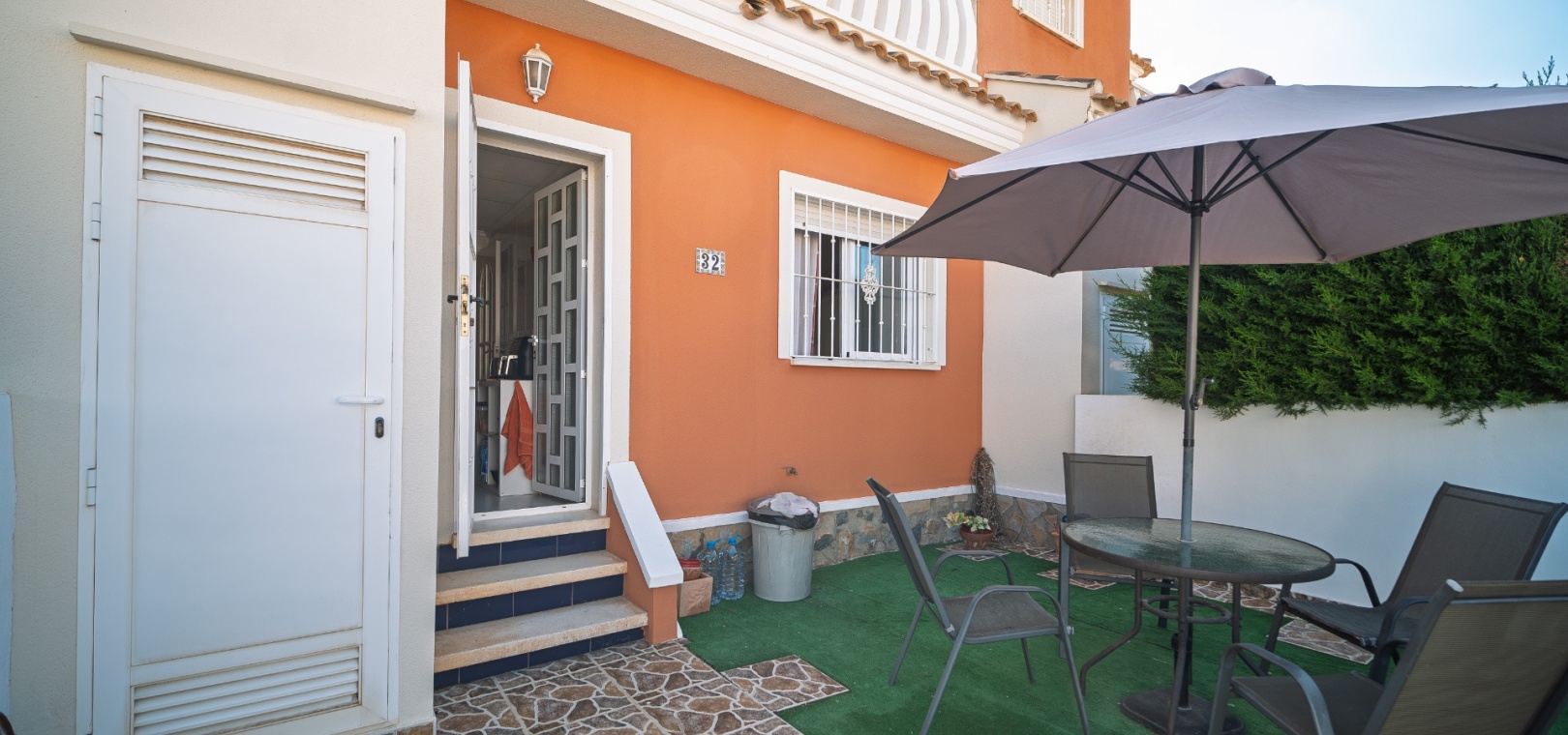 Im Erdgeschoss befinden sich ein heller und geräumiger Wohnbereich, ein Gästezimmer, ein Duschbad sowie eine separate, voll ausgestattete Küche. Der Vorgarten mit Blick auf den Gemeinschaftspool lädt zum Entspannen oder geselligen Beisammensein ein, während der rückseitige Garten zur Straße hin ausgerichtet ist und zusätzlichen Außenbereich bietet.
