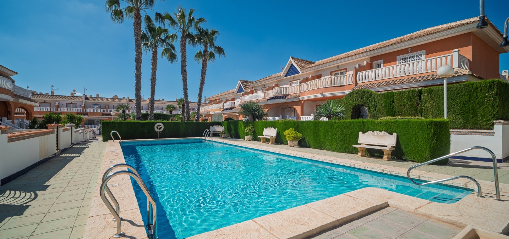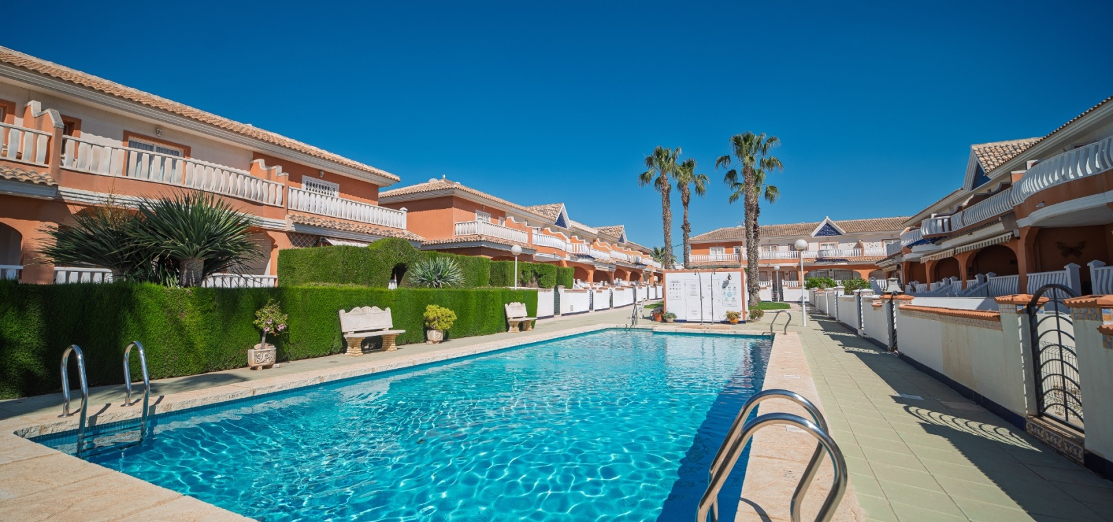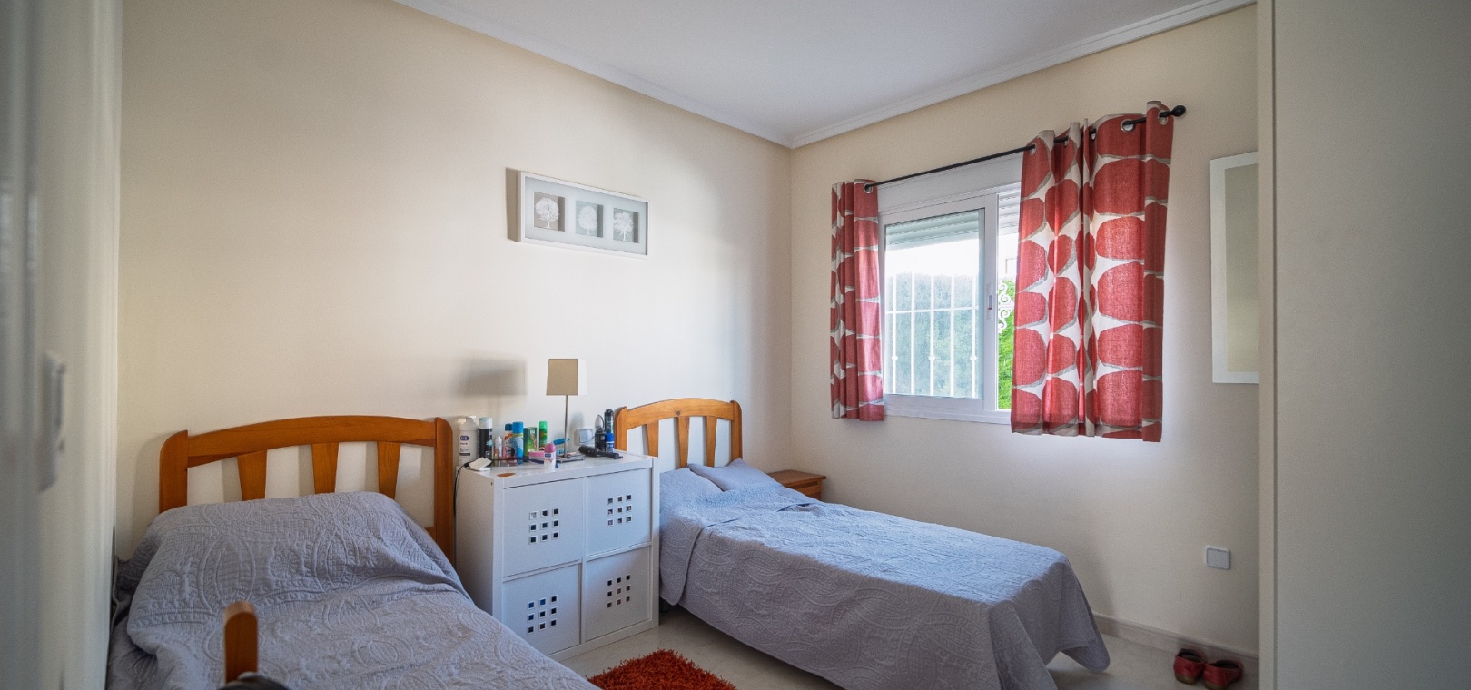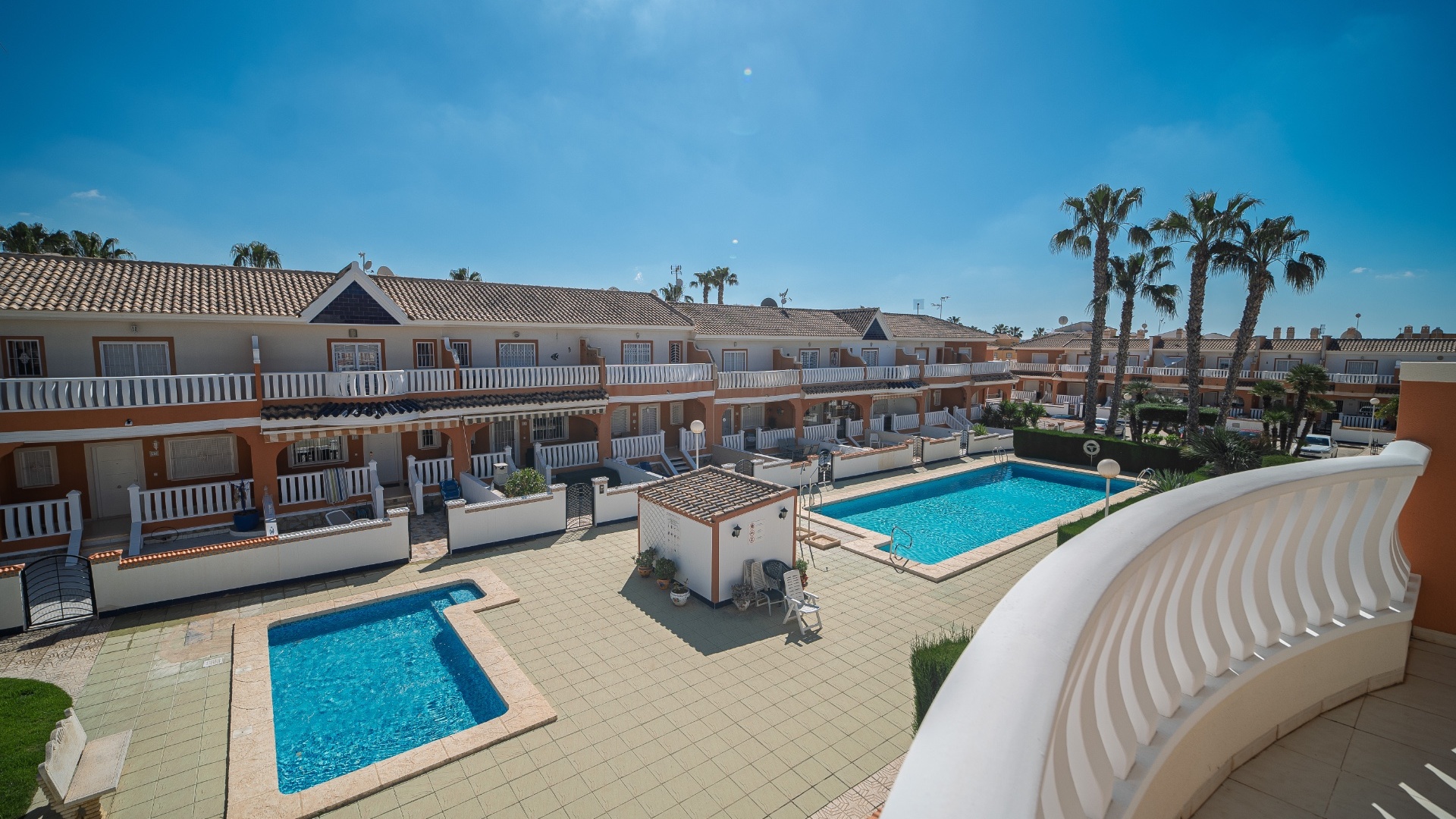 Im Erdgeschoss befinden sich ein heller und geräumiger Wohnbereich, ein Gästezimmer, ein Duschbad sowie eine separate, voll ausgestattete Küche. Der Vorgarten mit Blick auf den Gemeinschaftspool lädt zum Entspannen oder geselligen Beisammensein ein, während der rückseitige Garten zur Straße hin ausgerichtet ist und zusätzlichen Außenbereich bietet.