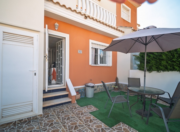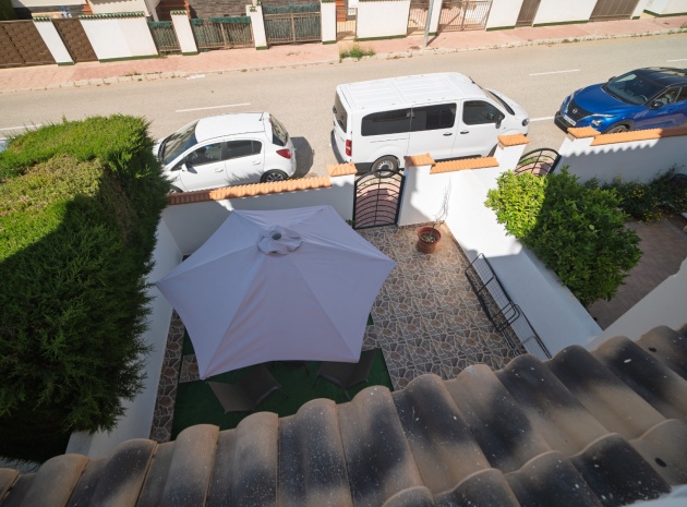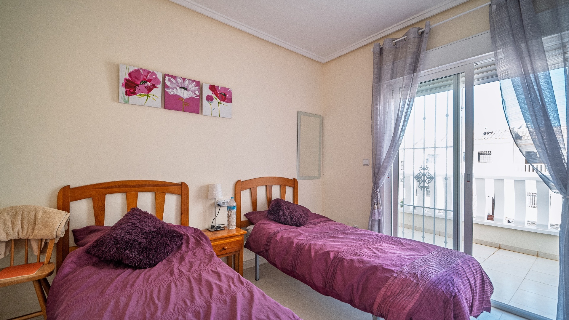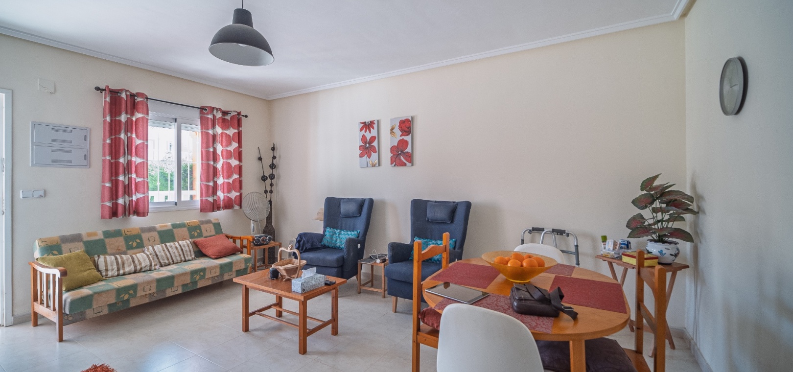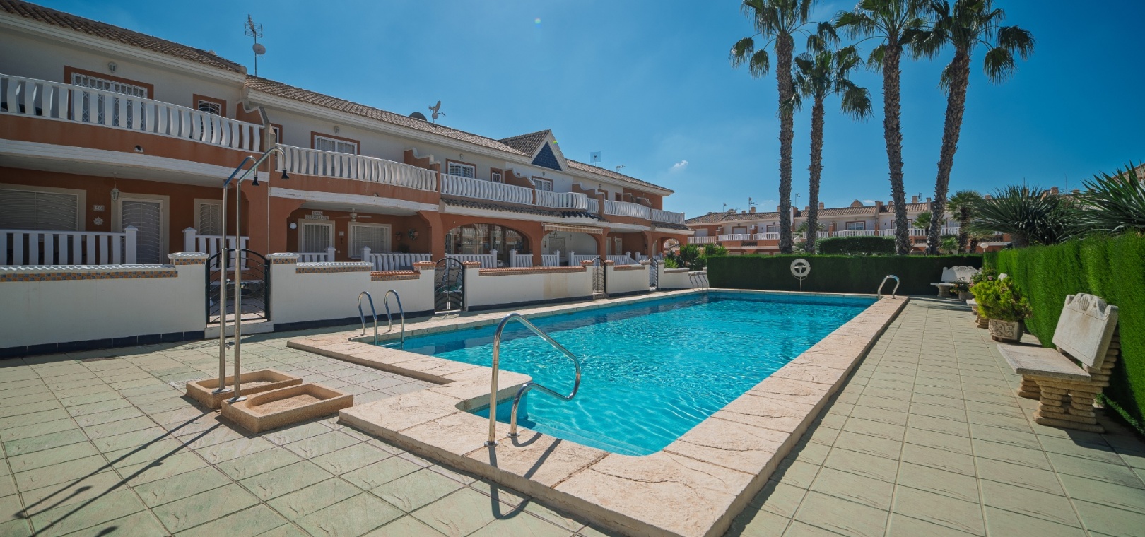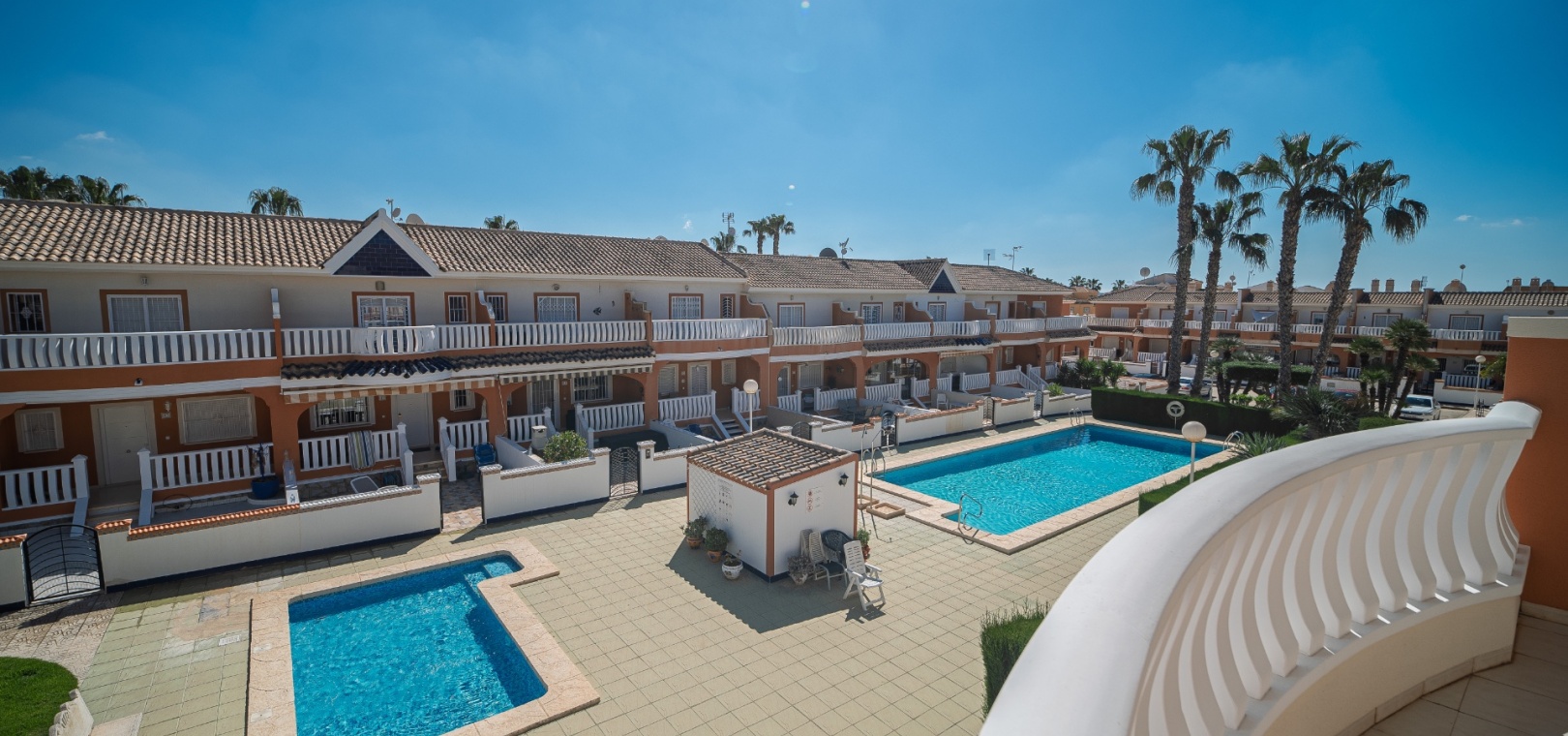 Im Erdgeschoss befinden sich ein heller und geräumiger Wohnbereich, ein Gästezimmer, ein Duschbad sowie eine separate, voll ausgestattete Küche. Der Vorgarten mit Blick auf den Gemeinschaftspool lädt zum Entspannen oder geselligen Beisammensein ein, während der rückseitige Garten zur Straße hin ausgerichtet ist und zusätzlichen Außenbereich bietet.