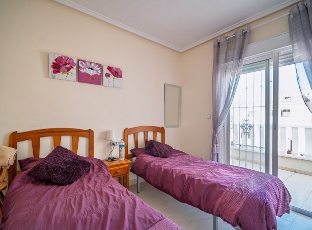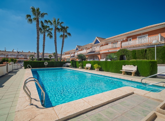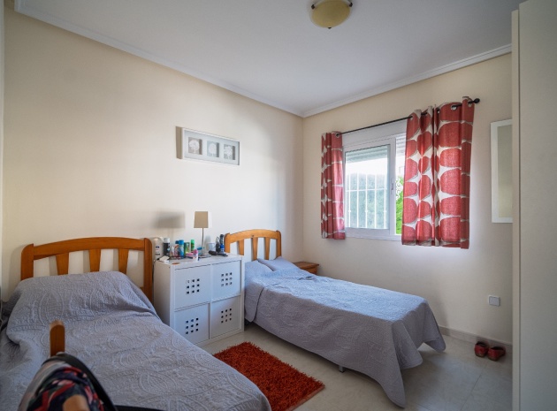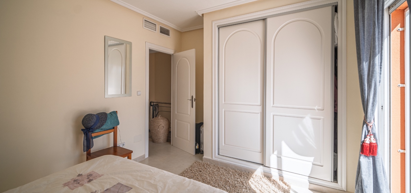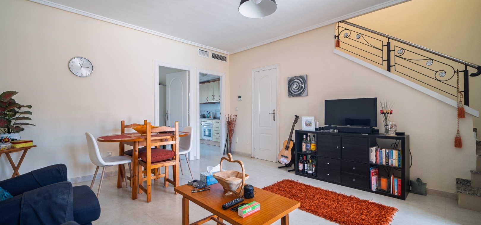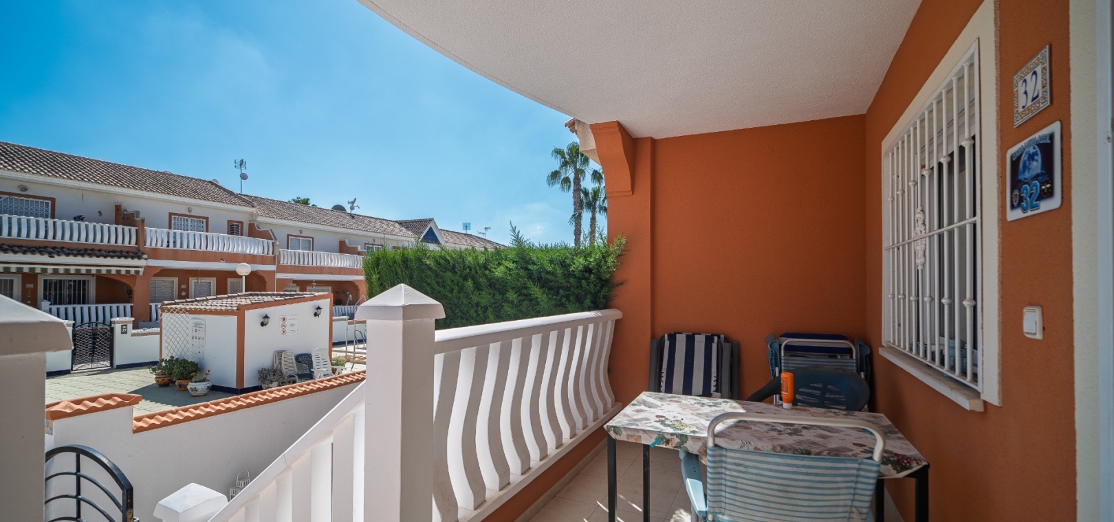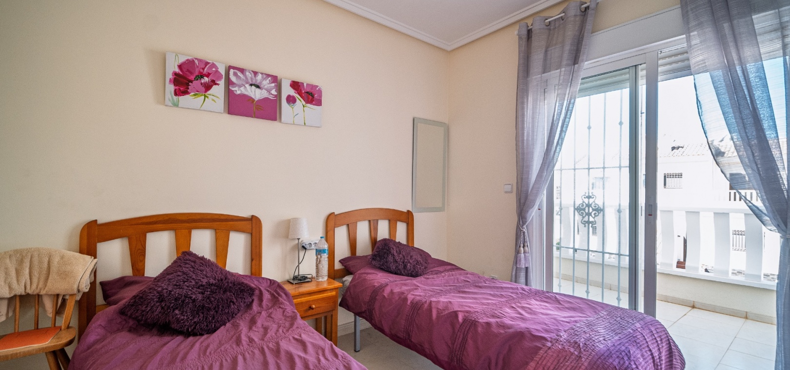 Im Erdgeschoss befinden sich ein heller und geräumiger Wohnbereich, ein Gästezimmer, ein Duschbad sowie eine separate, voll ausgestattete Küche. Der Vorgarten mit Blick auf den Gemeinschaftspool lädt zum Entspannen oder geselligen Beisammensein ein, während der rückseitige Garten zur Straße hin ausgerichtet ist und zusätzlichen Außenbereich bietet.