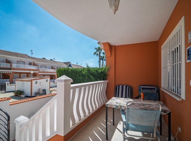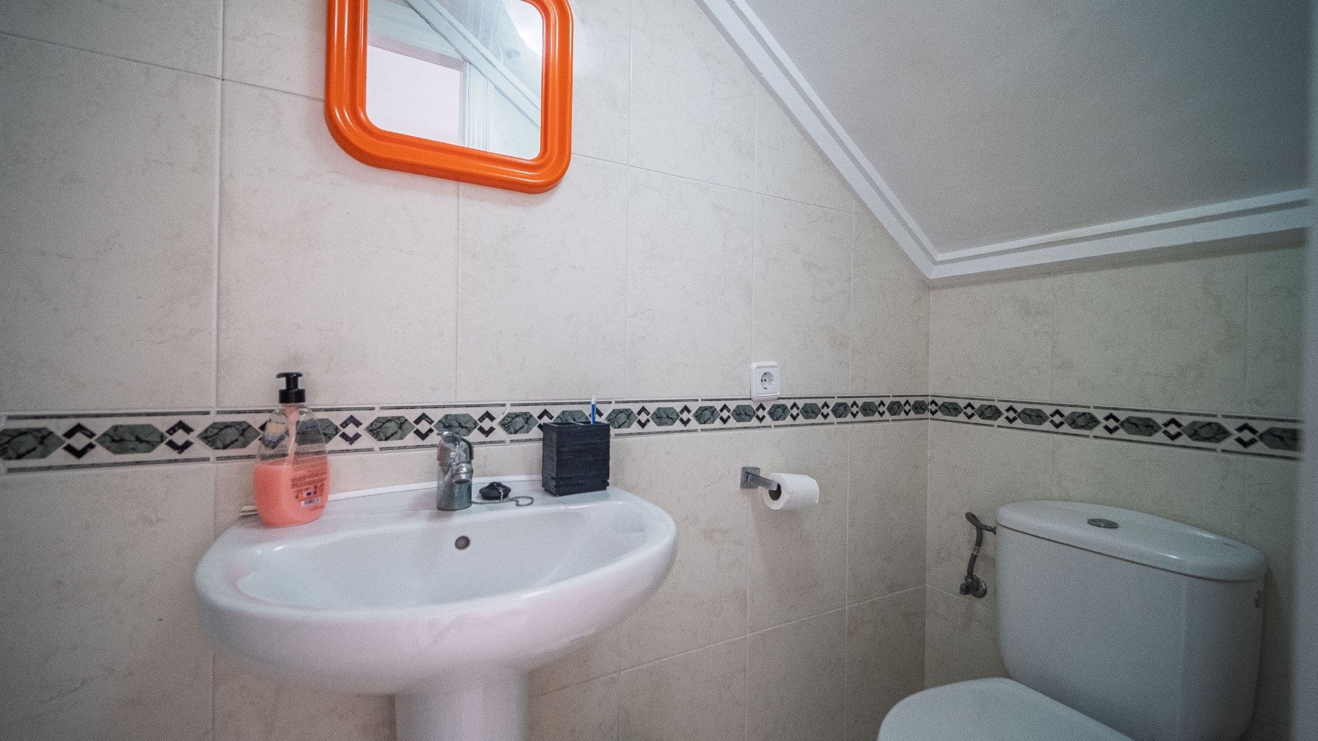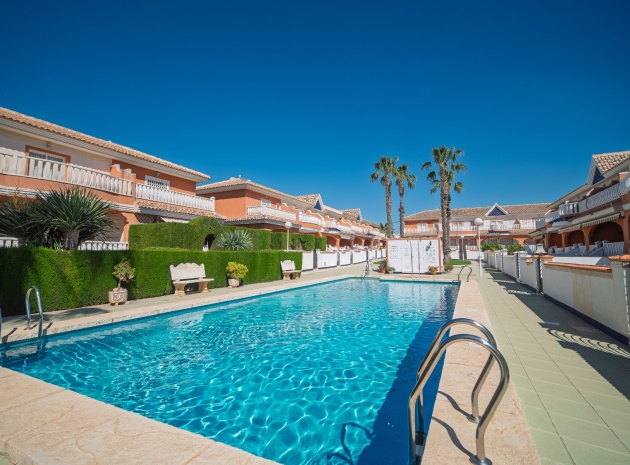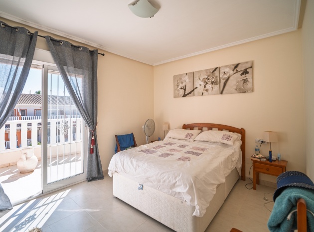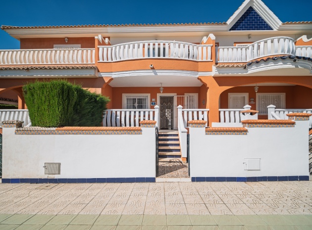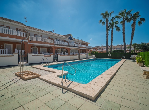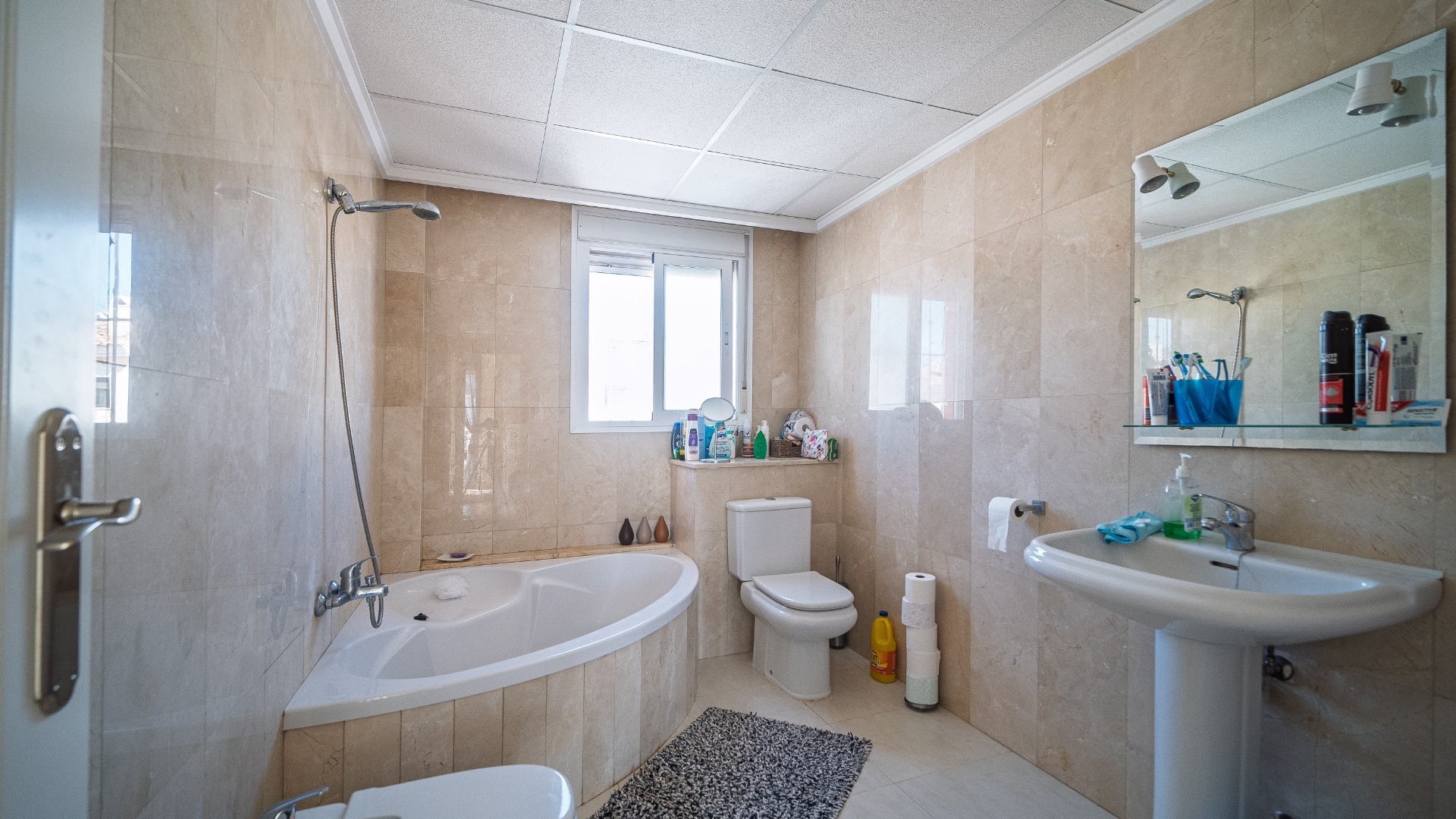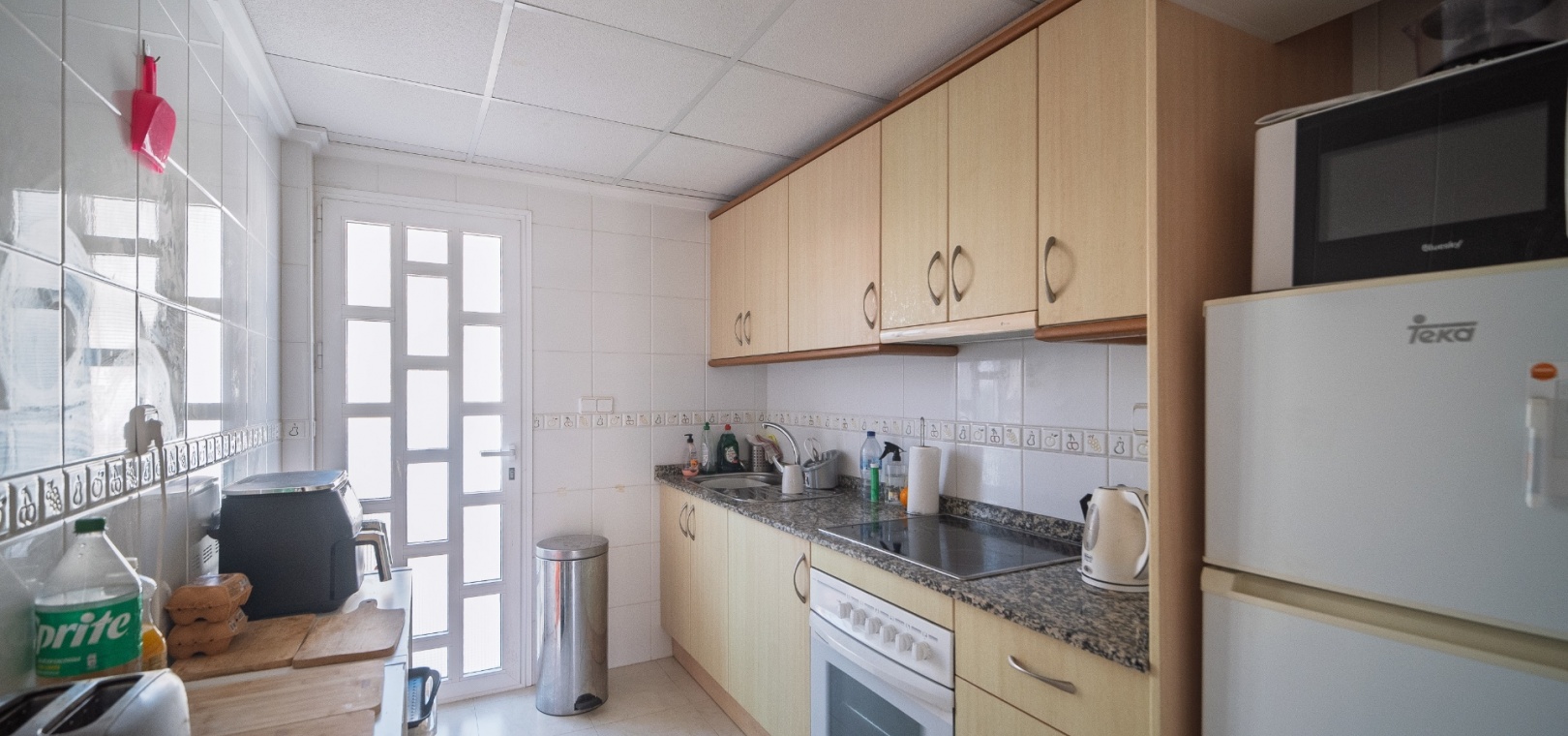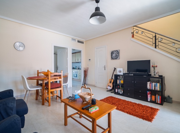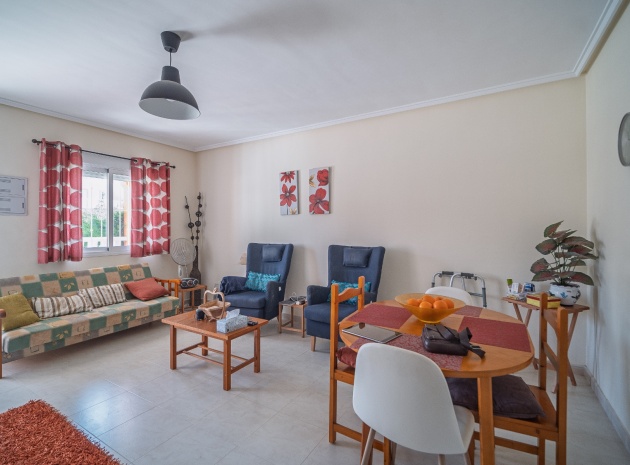 Im Erdgeschoss befinden sich ein heller und geräumiger Wohnbereich, ein Gästezimmer, ein Duschbad sowie eine separate, voll ausgestattete Küche. Der Vorgarten mit Blick auf den Gemeinschaftspool lädt zum Entspannen oder geselligen Beisammensein ein, während der rückseitige Garten zur Straße hin ausgerichtet ist und zusätzlichen Außenbereich bietet.