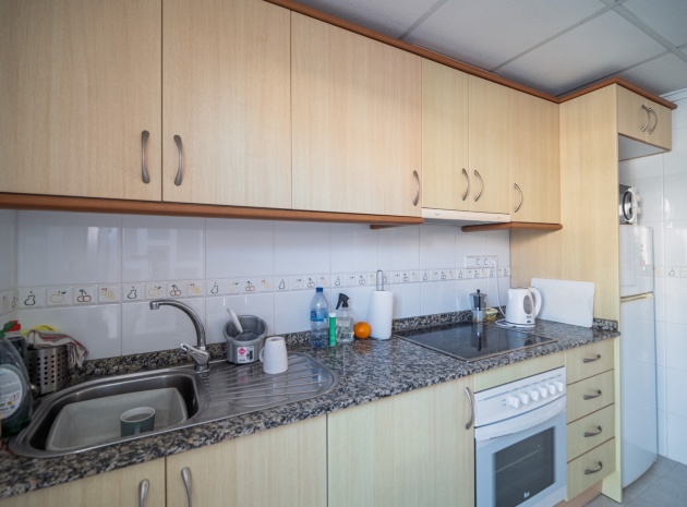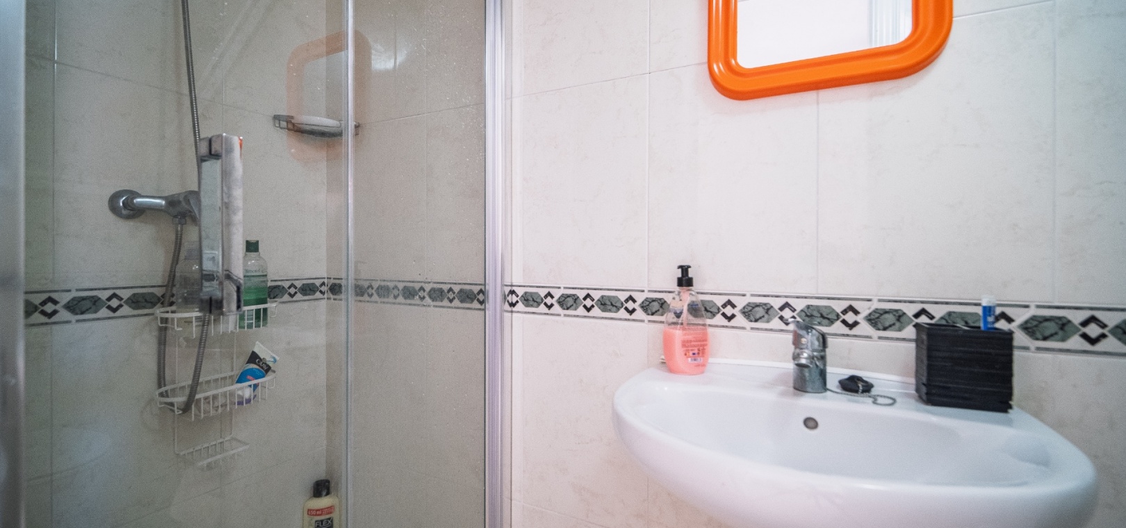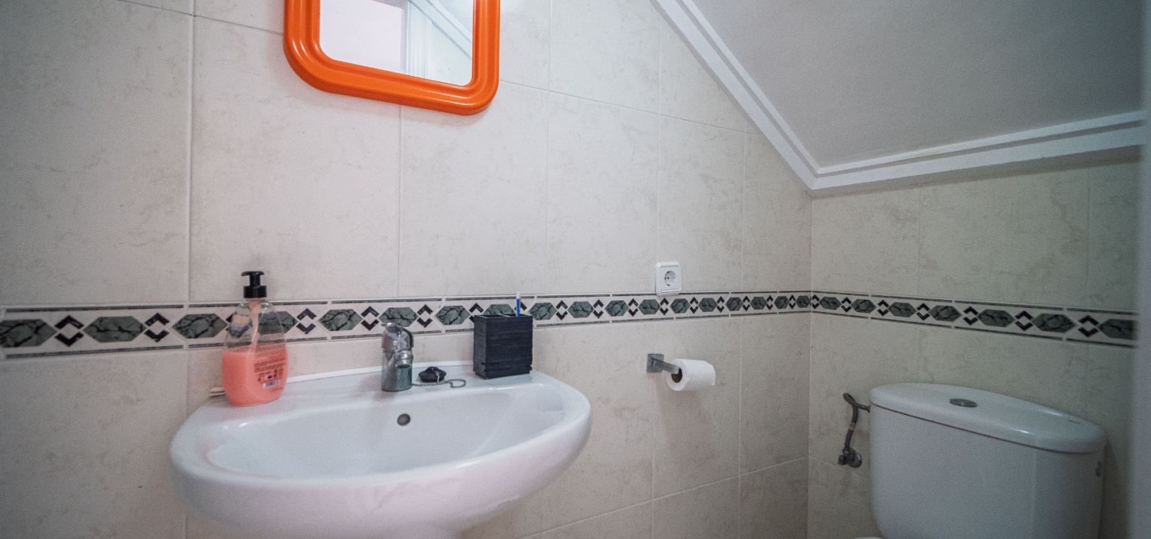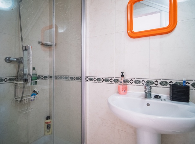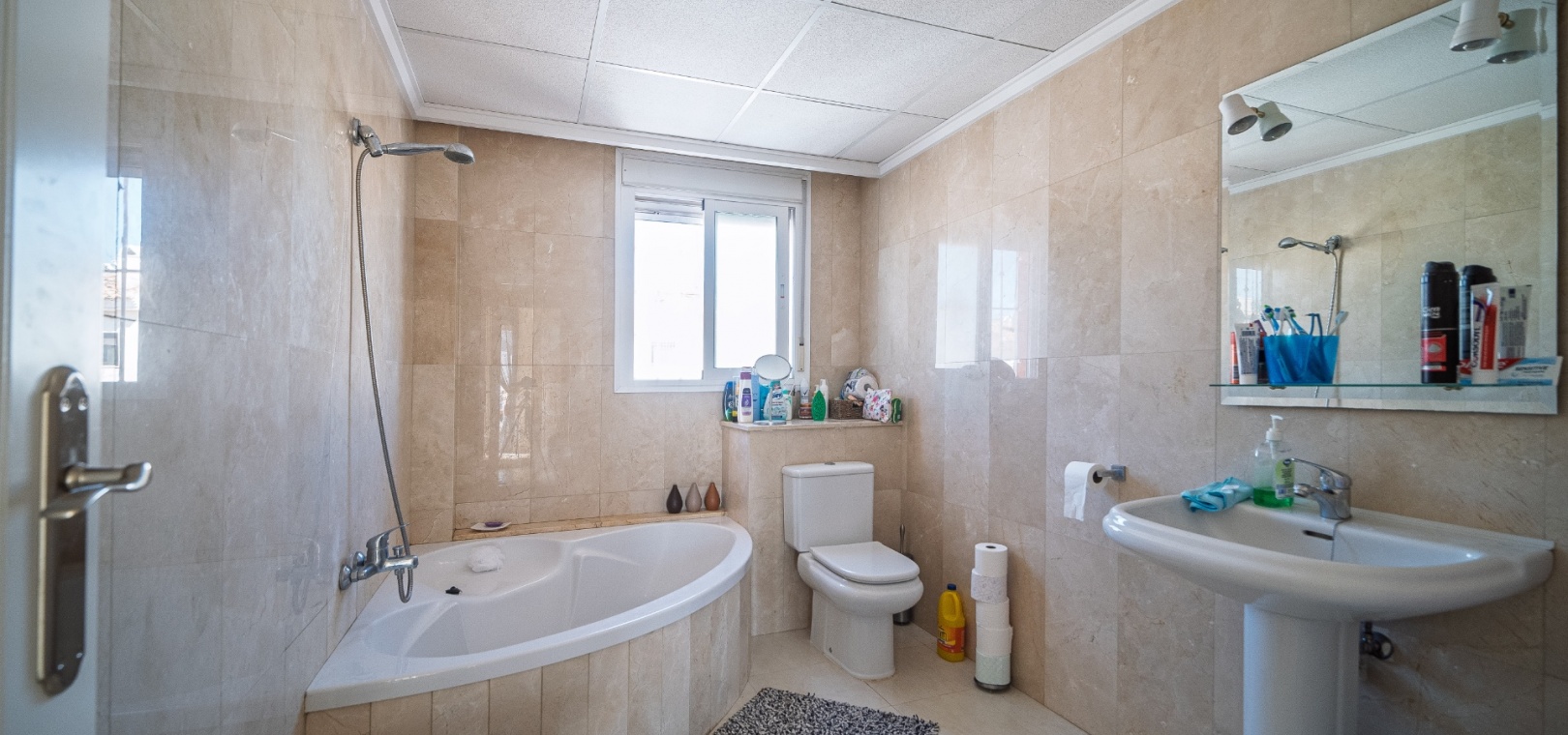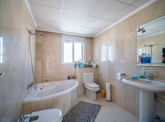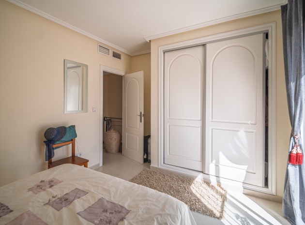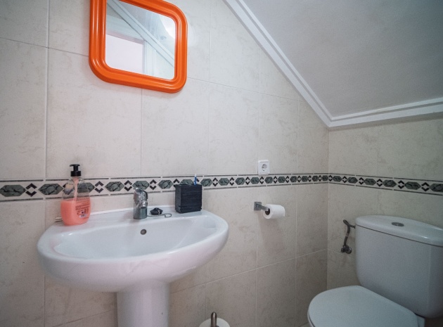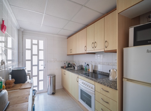 Im Erdgeschoss befinden sich ein heller und geräumiger Wohnbereich, ein Gästezimmer, ein Duschbad sowie eine separate, voll ausgestattete Küche. Der Vorgarten mit Blick auf den Gemeinschaftspool lädt zum Entspannen oder geselligen Beisammensein ein, während der rückseitige Garten zur Straße hin ausgerichtet ist und zusätzlichen Außenbereich bietet.