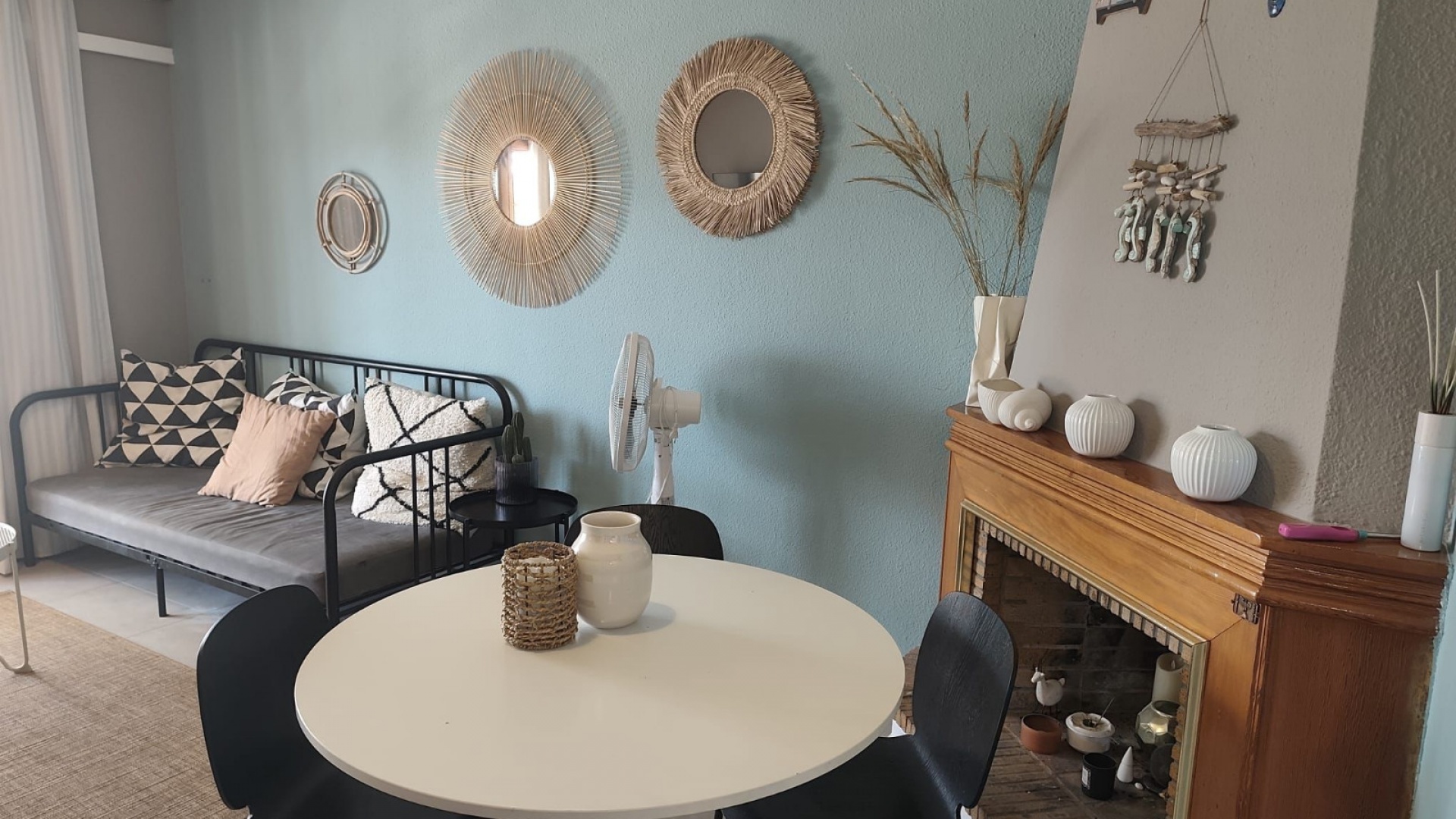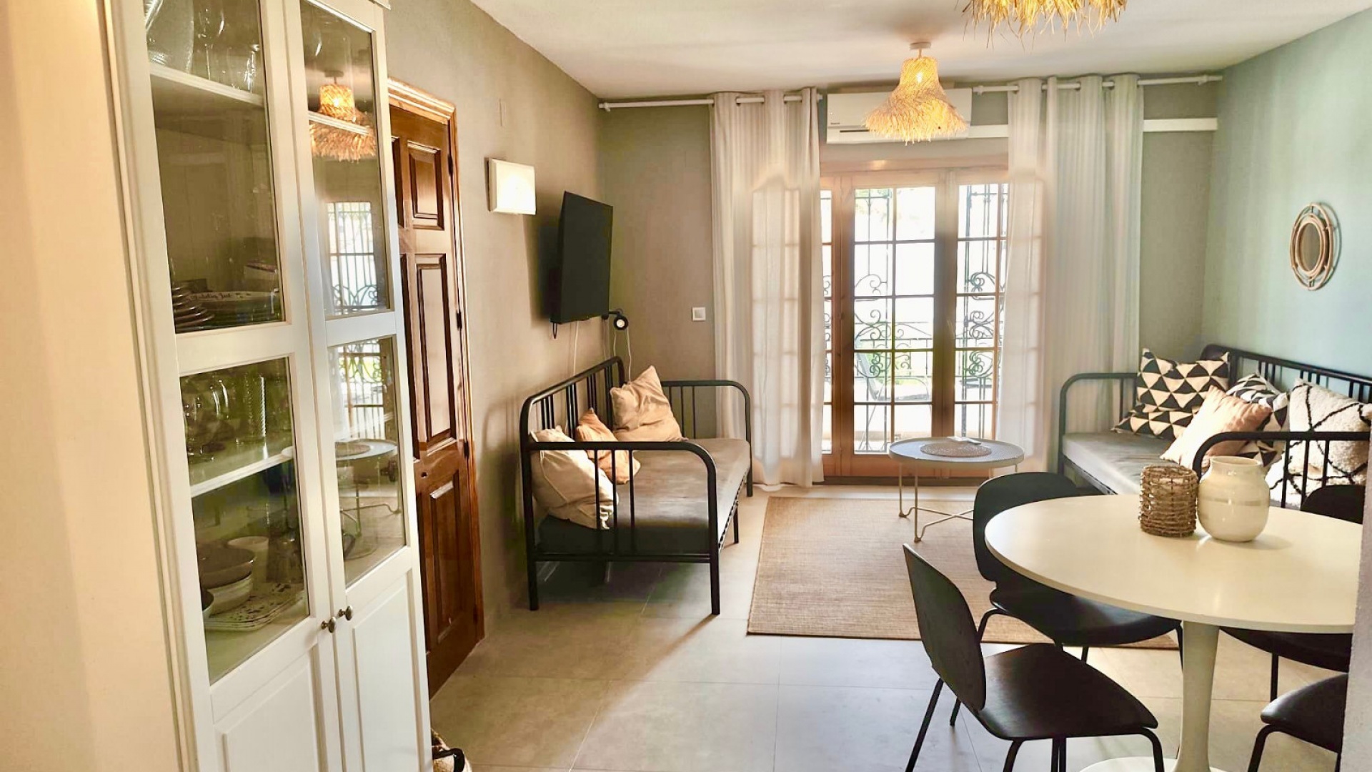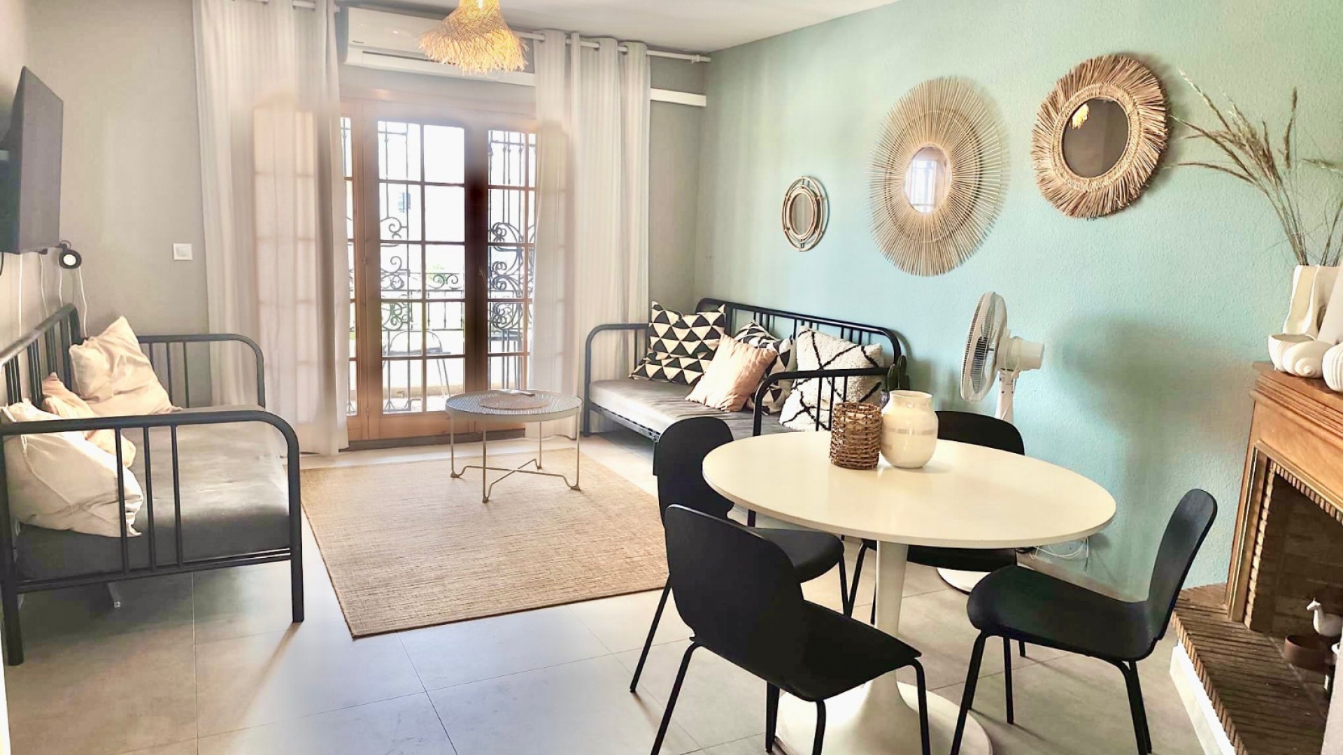Wohn-/Esszimmer mit Klimaanlage und Warm-/Kaltwasseranschluss sowie Terrassentüren zum Balkon mit direktem Blick auf den schönen Gemeinschaftspool