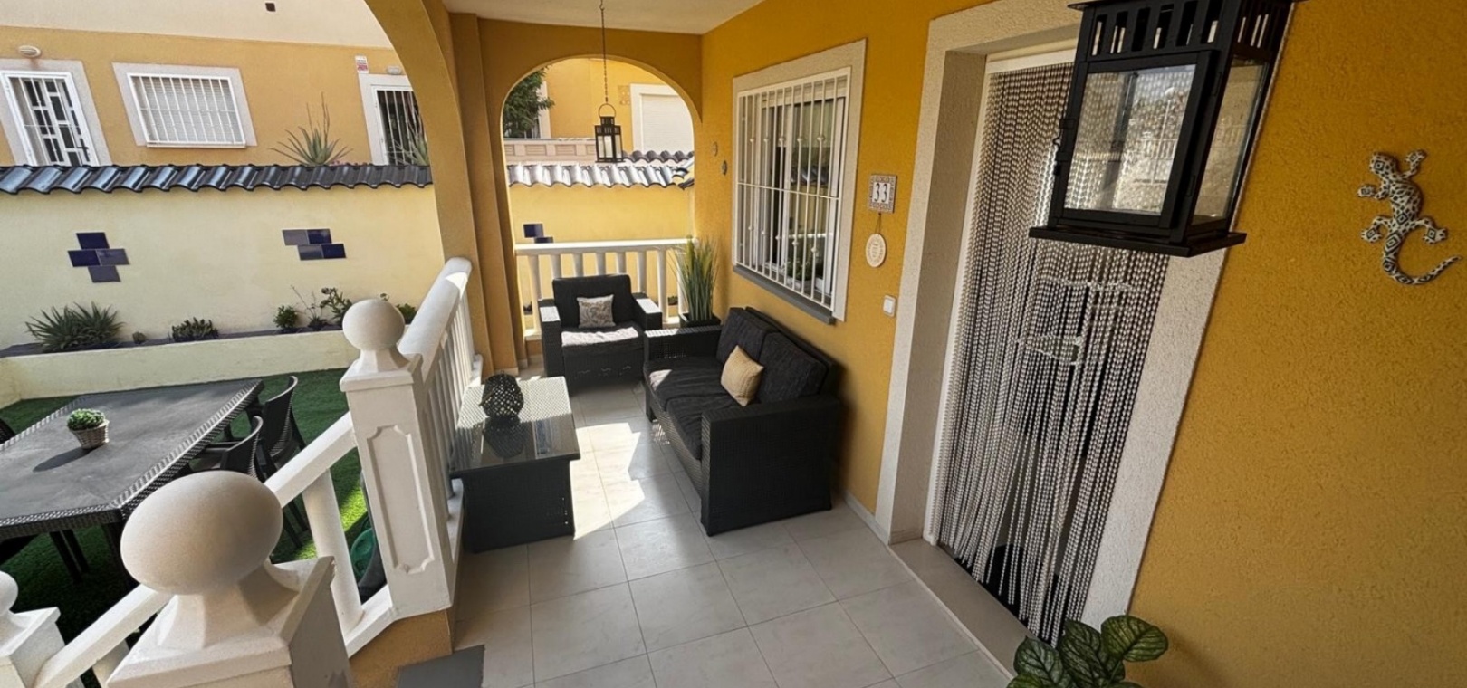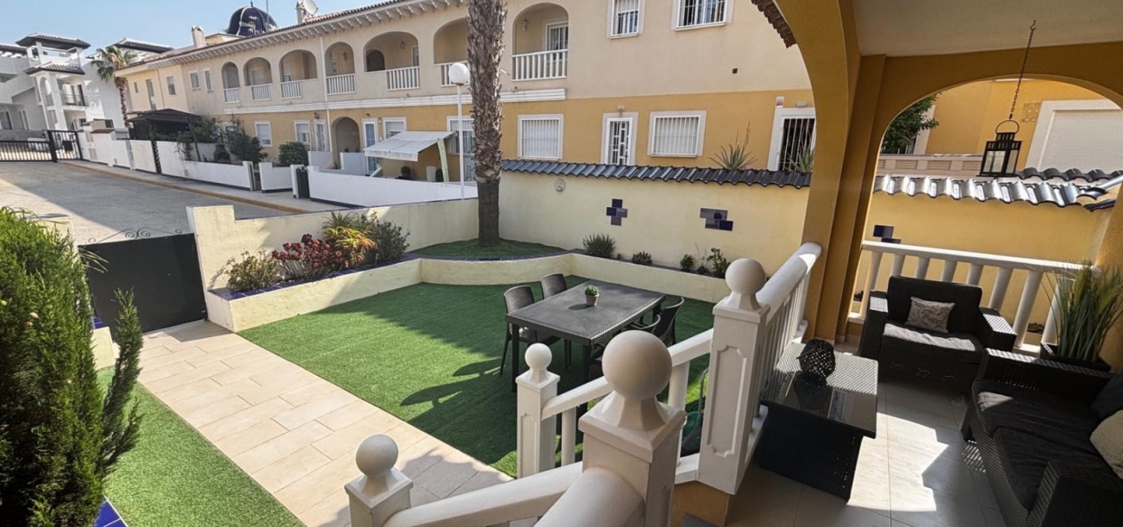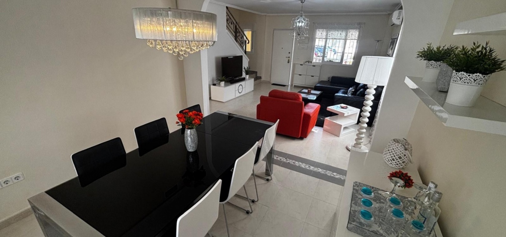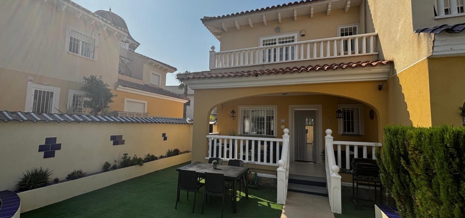 Wir freuen uns, Ihnen dieses beeindruckende Doppelhaus im Lola-Stil mit 2/3 Schlafzimmern anbieten zu können. Es wurde 2007 von Euromarina erbaut und liegt in der begehrten Wohngegend Dona Pepa in einer geschlossenen Anlage. Die Immobilie wurde von den derzeitigen Eigentümern hochwertig modernisiert. Sie profitiert von ihrer Ecklage und verfügt über Gärten vorne und hinten sowie einen Seiteneingang. Die Außenmauern wurden erhöht, um für mehr Privatsphäre zu sorgen. Ein Außenwirtschaftsraum mit Waschmaschine und Abstellraum wurde hinzugefügt. Im Inneren der Immobilie haben die derzeitigen Eigentümer einen Wohn- und Essbereich erhalten. Dieser Essbereich kann bei Bedarf problemlos in ein drittes Schlafzimmer umgewandelt werden. Die Möblierung ist von außergewöhnlicher Qualität. Diese Immobilie ist schlüsselfertig und Sie können sie vom ersten Moment an genießen. Die kleine Wohnanlage Alegria bietet einen fantastischen Gemeinschaftspool mit wunderschönen Gärten. Verschiedene Supermärkte, Bars und Restaurants sind bequem zu Fuß erreichbar.