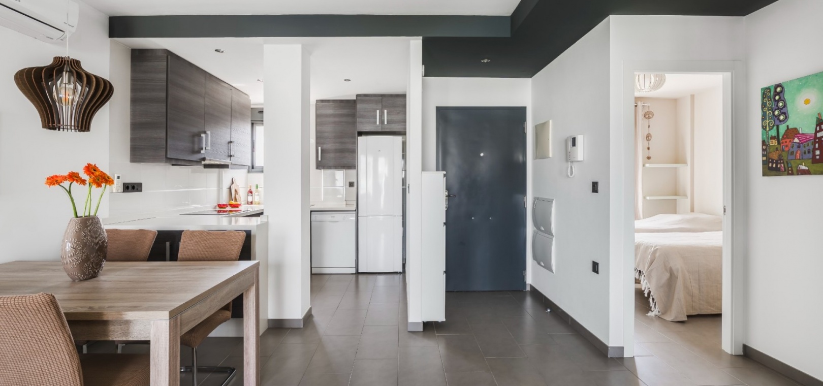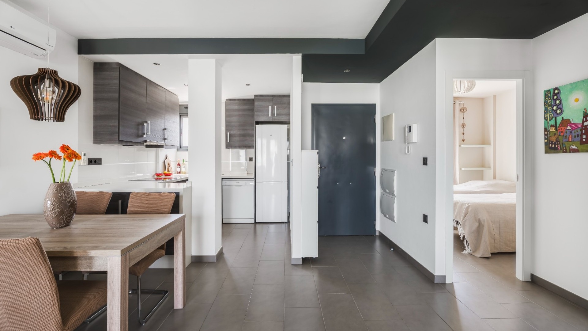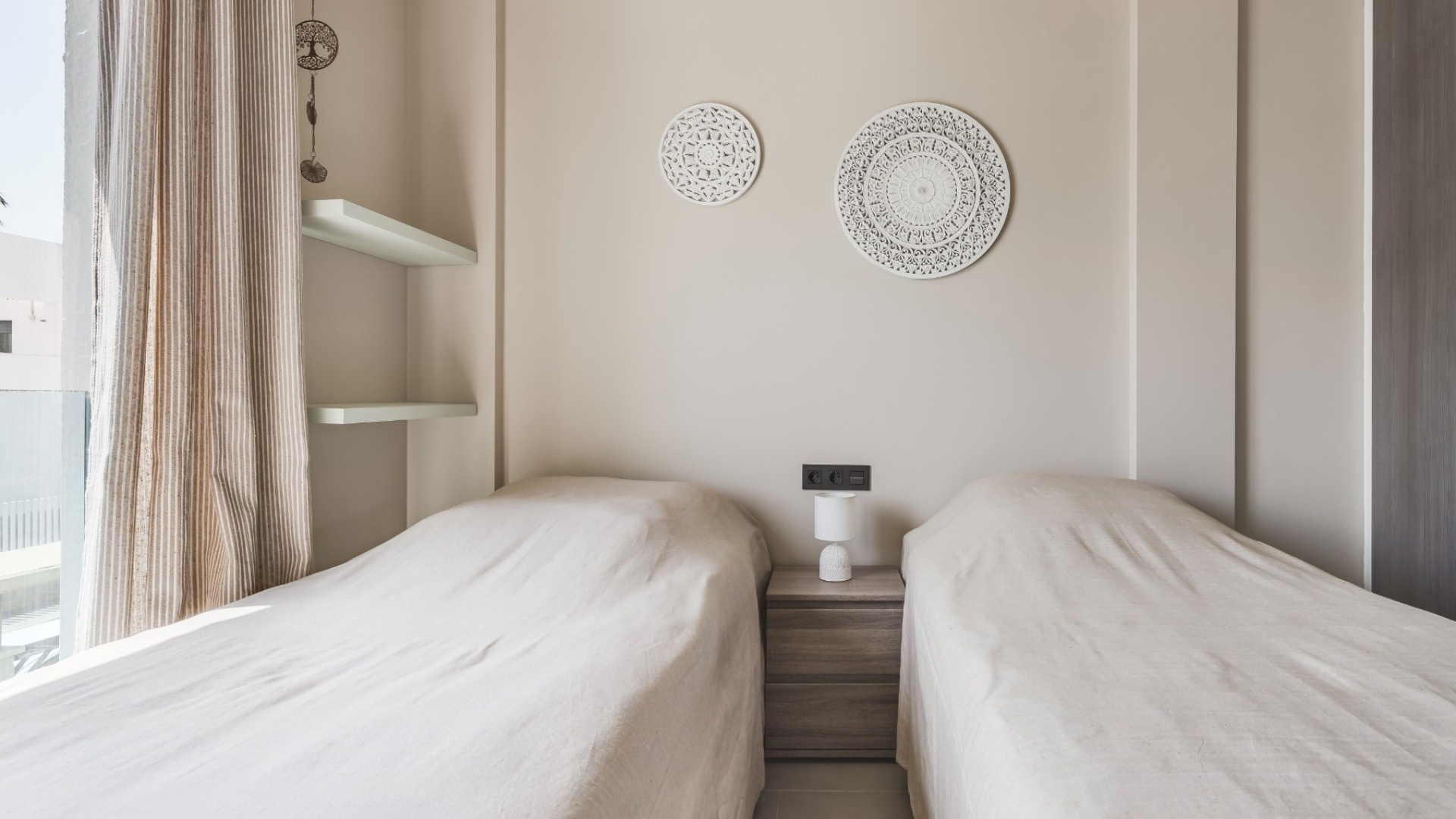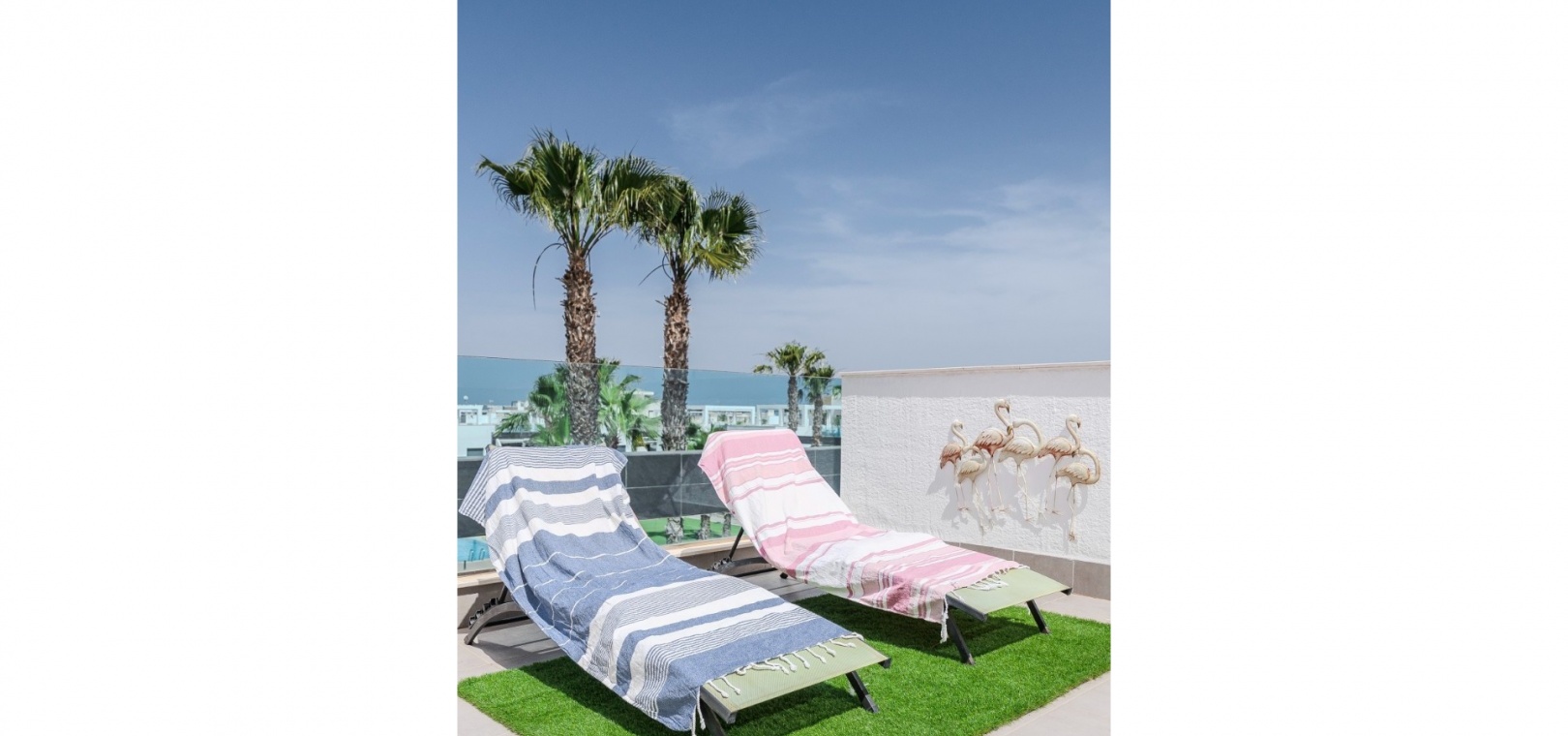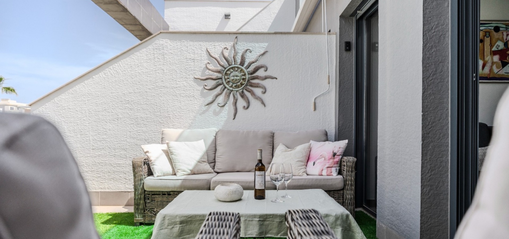 2 geräumige Schlafzimmer, darunter ein Hauptschlafzimmer mit eigenem Bad und Blick auf den Garten 2 moderne Badezimmer mit hochwertiger Ausstattung und Fußbodenheizung Fußbodenheizung im gesamten Gebäude (außer Schlafzimmer) Heller offener Küchen-, Wohn- und Essbereich Private Terrasse mit ausfahrbarer Markise Großzügiges Solarium auf dem Dach mit Wasser, Strom, Ambientebeleuchtung und Platz für einen Whirlpool Klimaanlage (warm und kalt) im gesamten Gebäude Sicherer Tiefgaragenstellplatz Wird komplett möbliert angeboten (ohne persönliche Gegenstände)