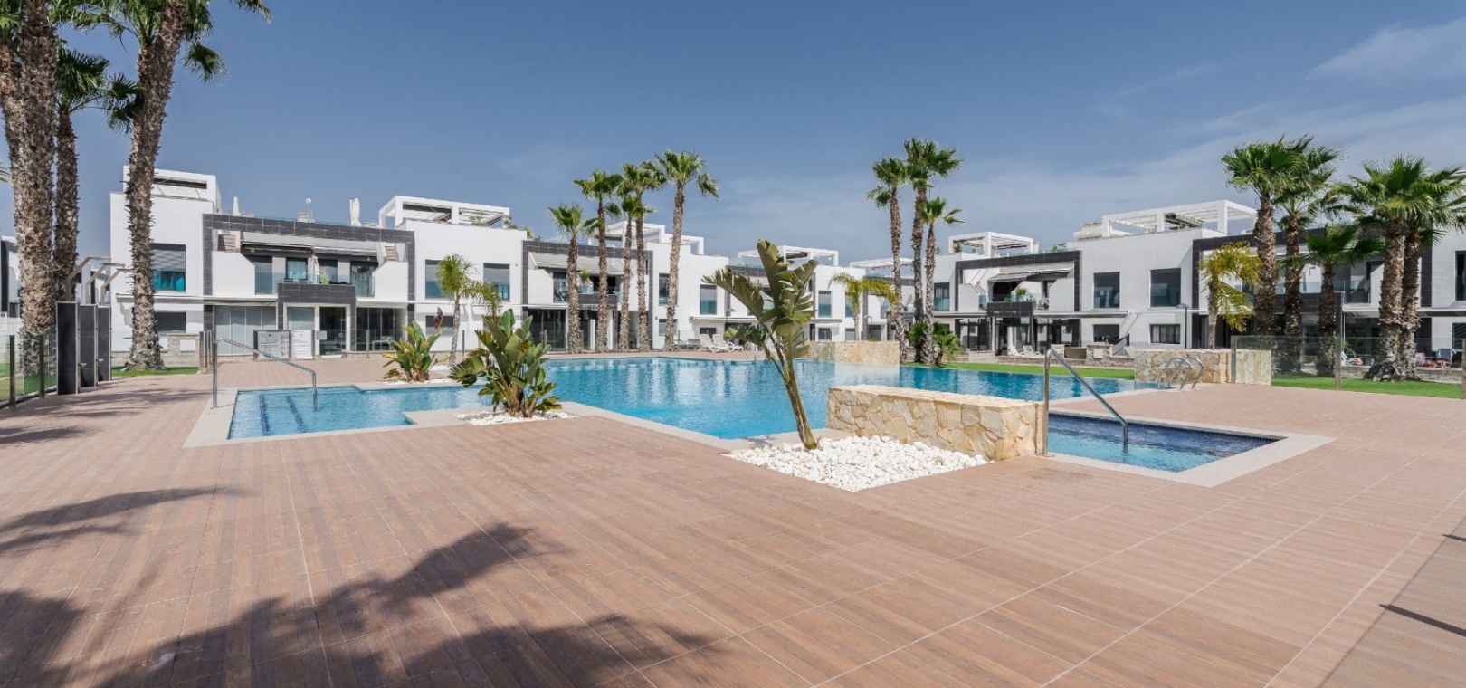 2 große Gemeinschaftspools mit Liegeflächen Separates Kinderbecken und Spielplatz Landschaftsgärten und makellose Gemeinschaftsräume Ruhige, abgeschlossene Lage neben einem grünen Park