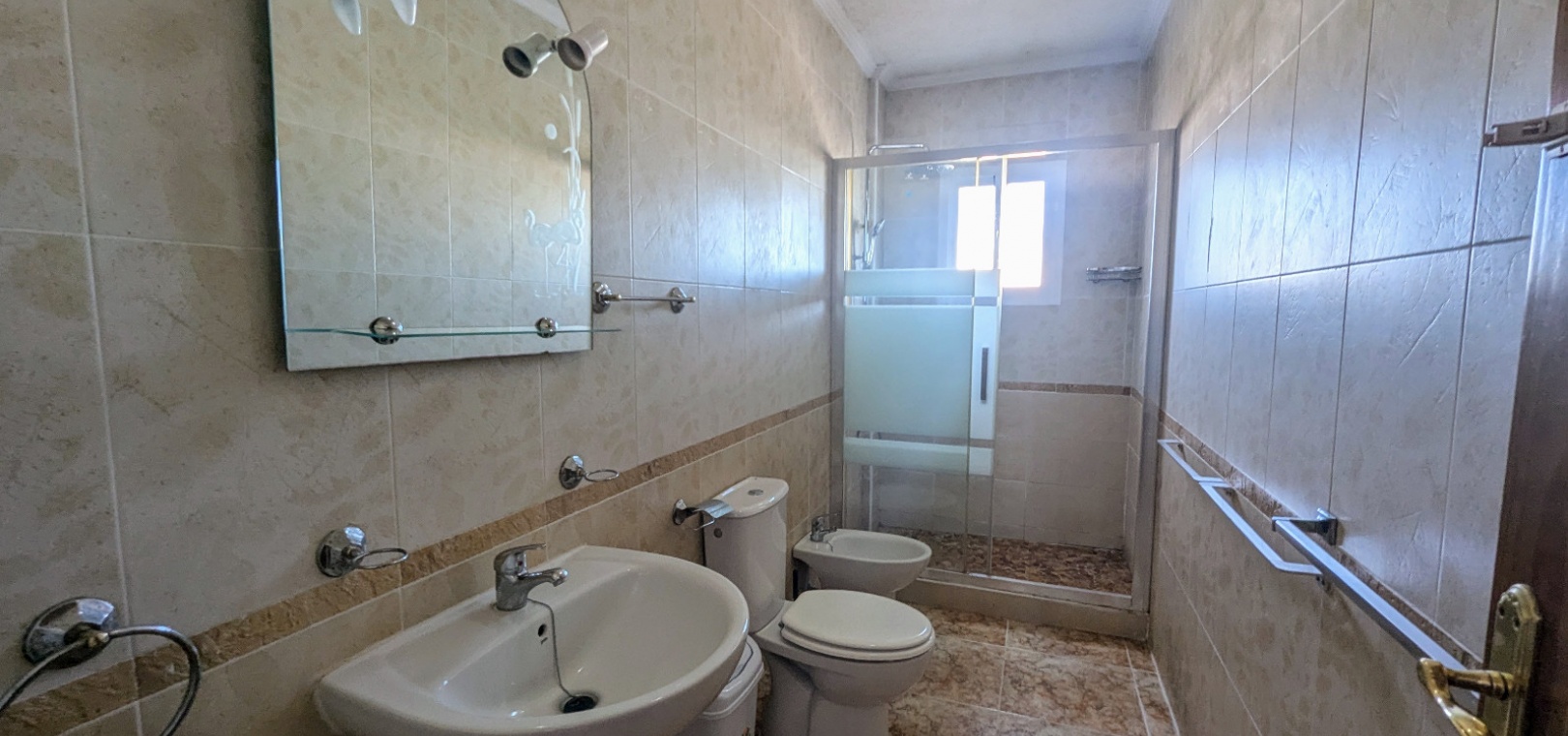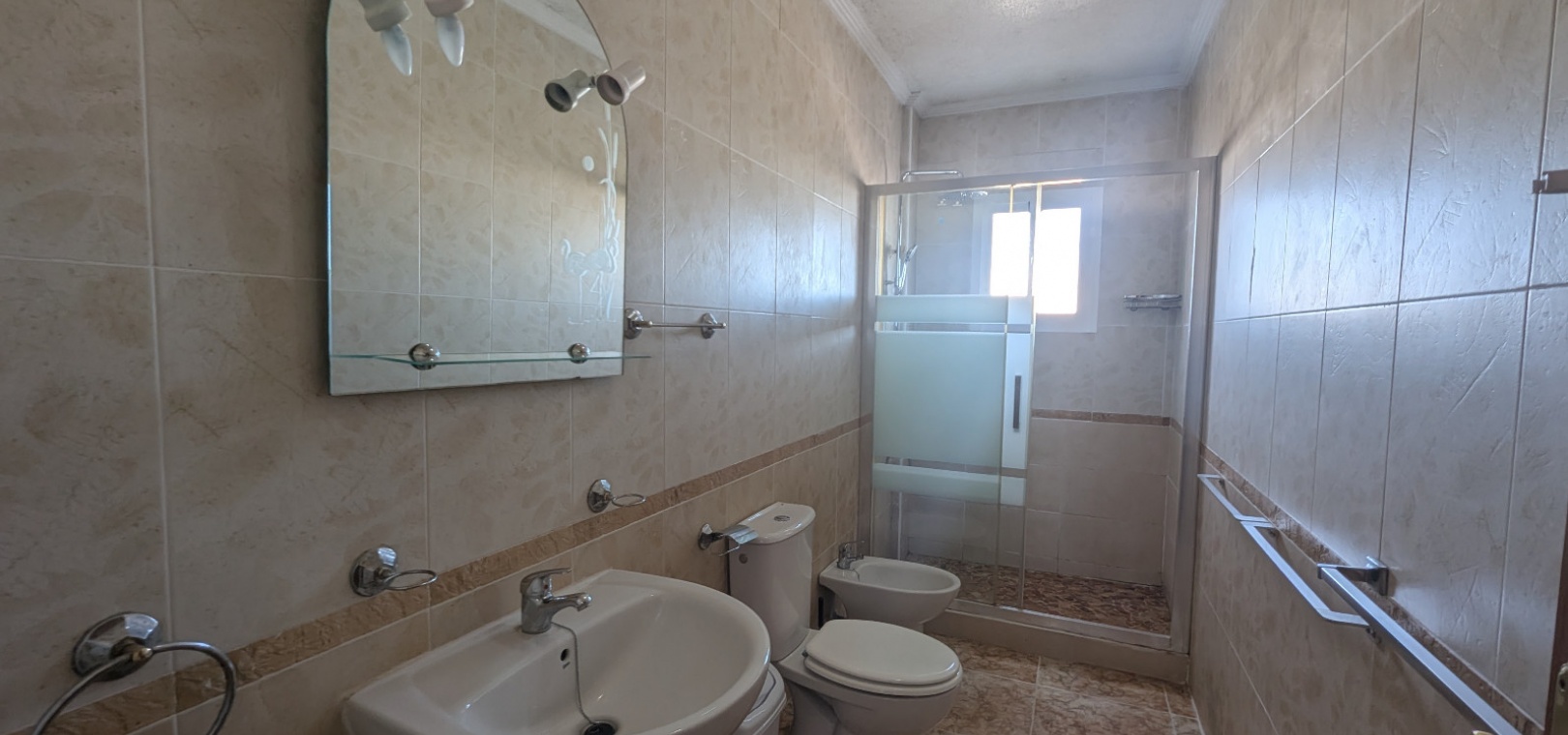 Erdgeschoss: Heller Wohn-/Essbereich mit Klimaanlage (warm/kalt), separate Einbauküche mit angrenzendem Hauswirtschafts-/Abstellraum und ein Gäste-WC. Erster Stock: Zwei Doppelschlafzimmer, beide mit Einbauschränken und Klimaanlage (warm/kalt). Das Hauptschlafzimmer verfügt über einen eigenen Balkon. Familienbadezimmer. Außenbereiche: Überdachte Vorderterrasse, pflegeleichter Vorgarten und ein privates Solarium auf dem Dach – ideal zum Sonnenbaden oder Entspannen. Gemeinschaftseinrichtungen: Zugang zu einem schönen Gemeinschaftspool.