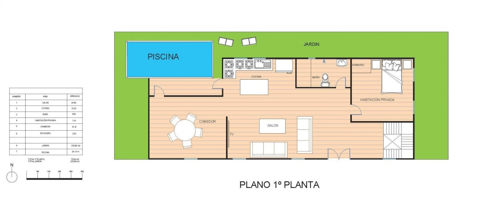 Erdgeschoss: Großes Wohnzimmer mit offener Designerküche, Esszimmer mit direktem Zugang zum Garten und zum privaten Pool, ein Schlafzimmer oder Arbeitszimmer und ein komplettes Badezimmer.