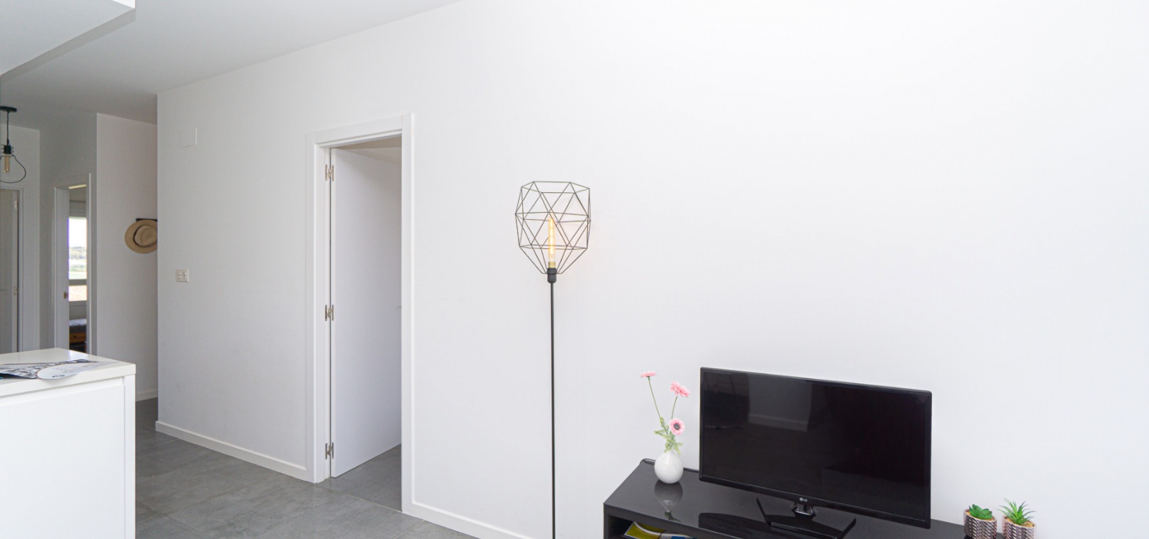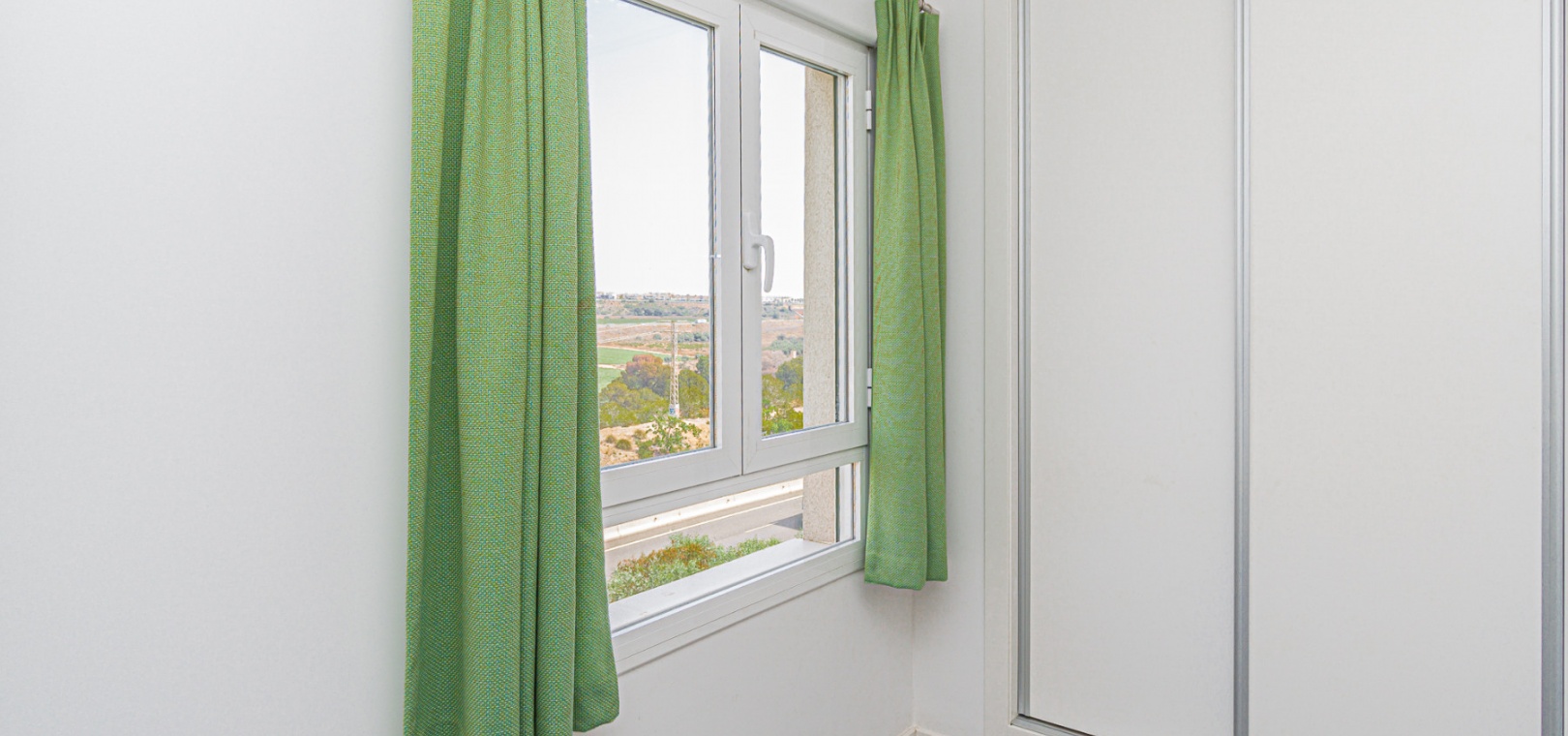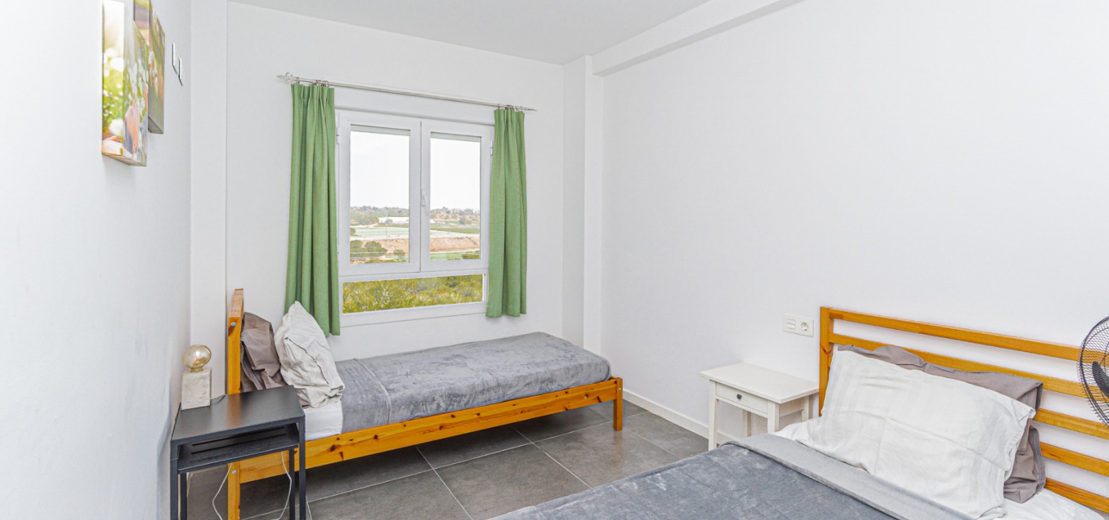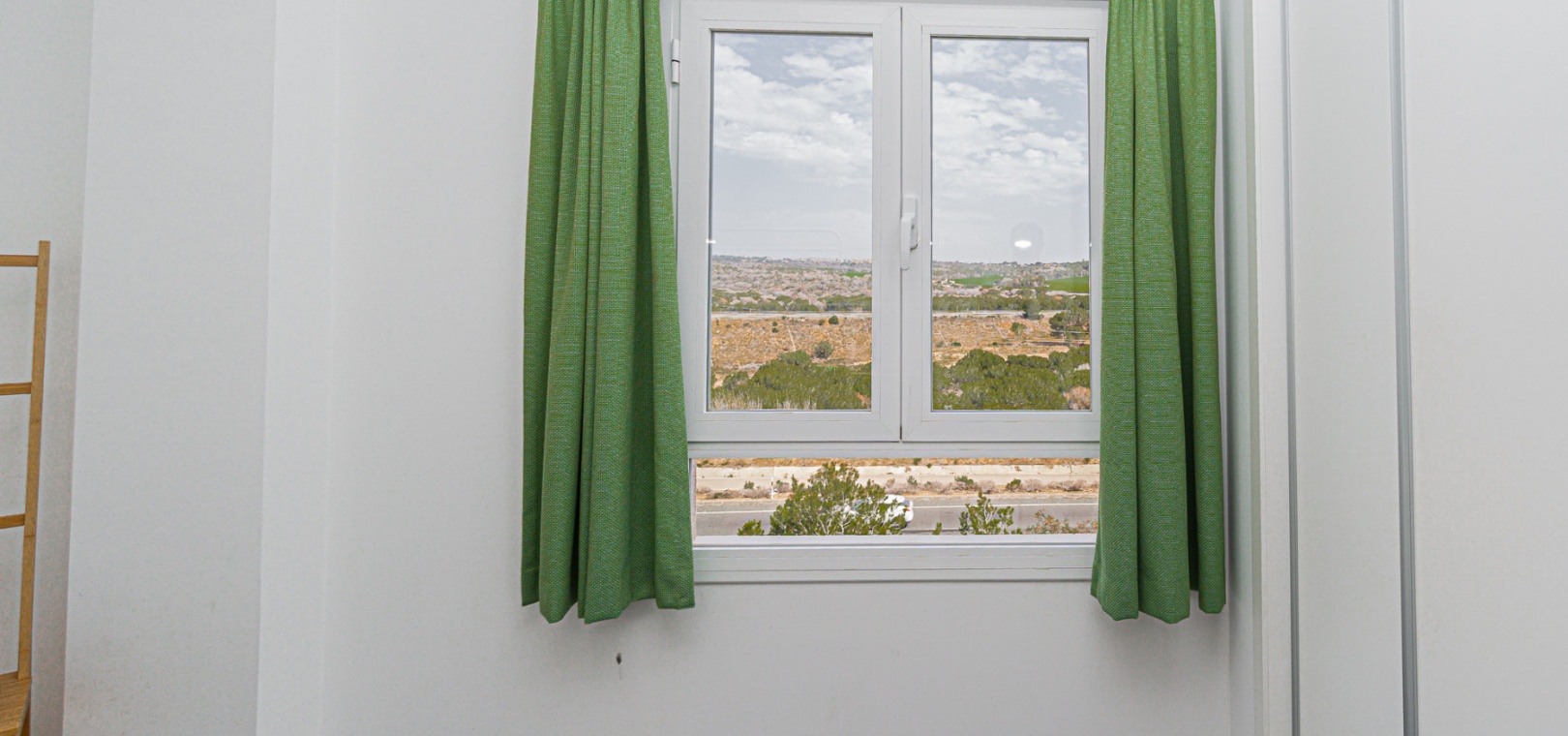 Der Grundriss ist praktisch und komfortabel. Rechts vom Eingang befinden sich zwei geräumige Schlafzimmer, beide mit herrlichem Blick auf die Rambla von Campoamor sowie auf die Golfplätze Las Ramblas und Campoamor – perfekt für Natur- und Golfliebhaber.
