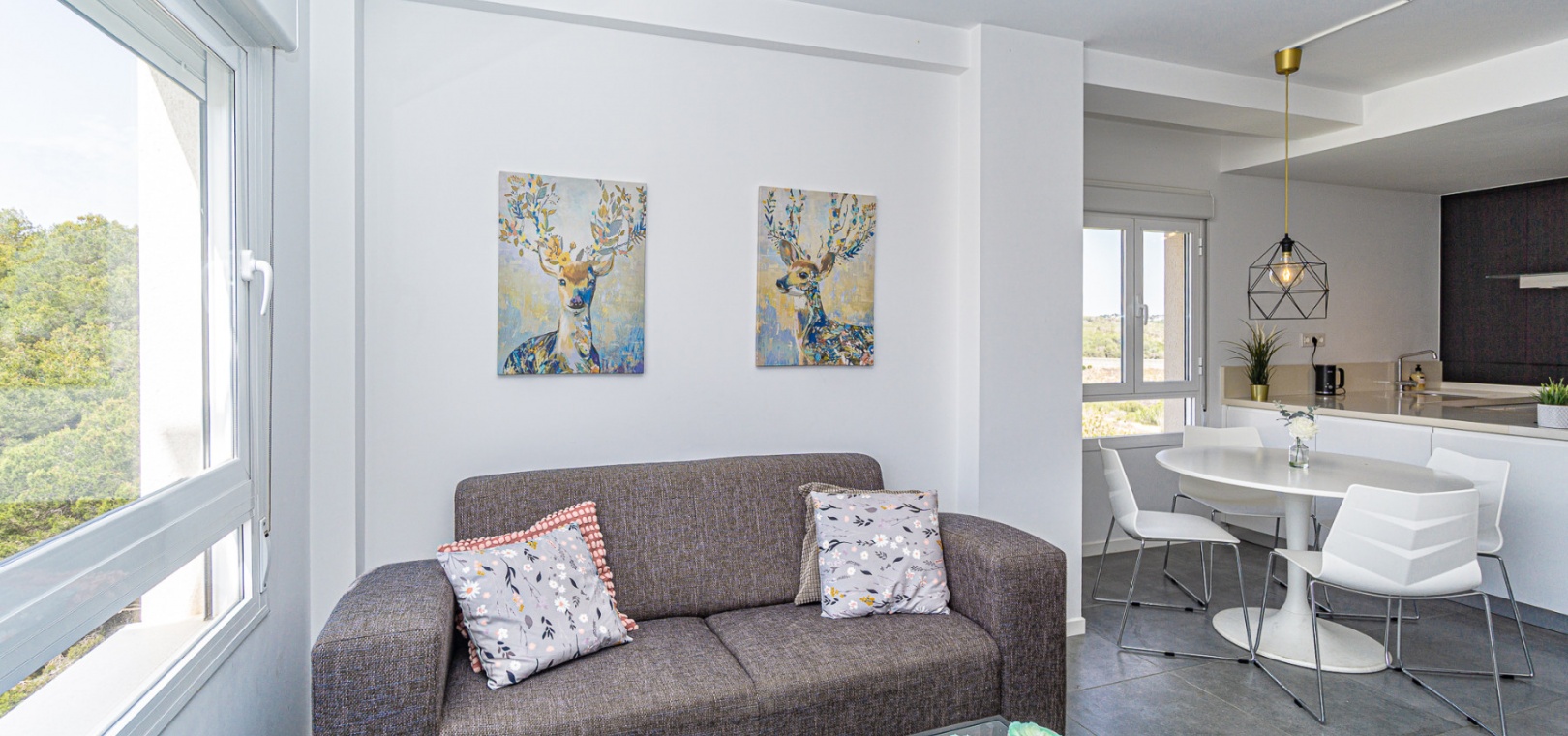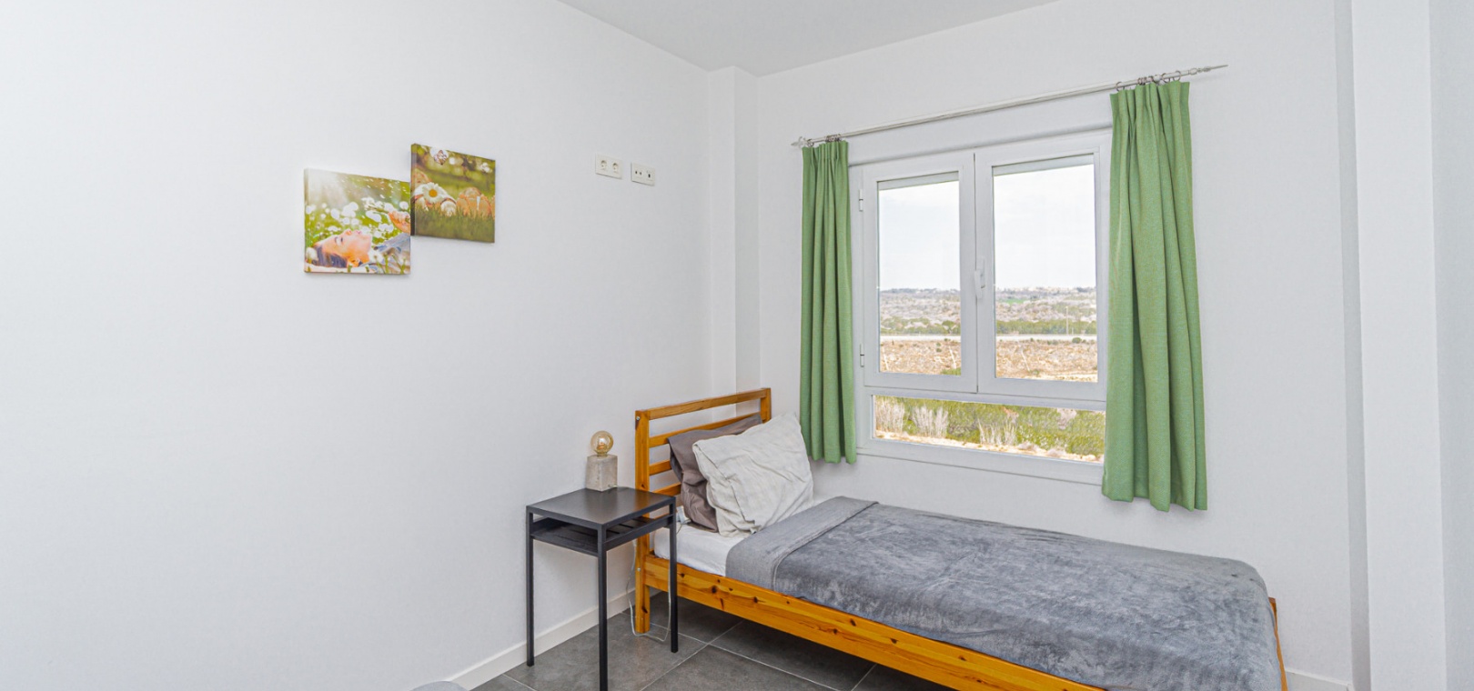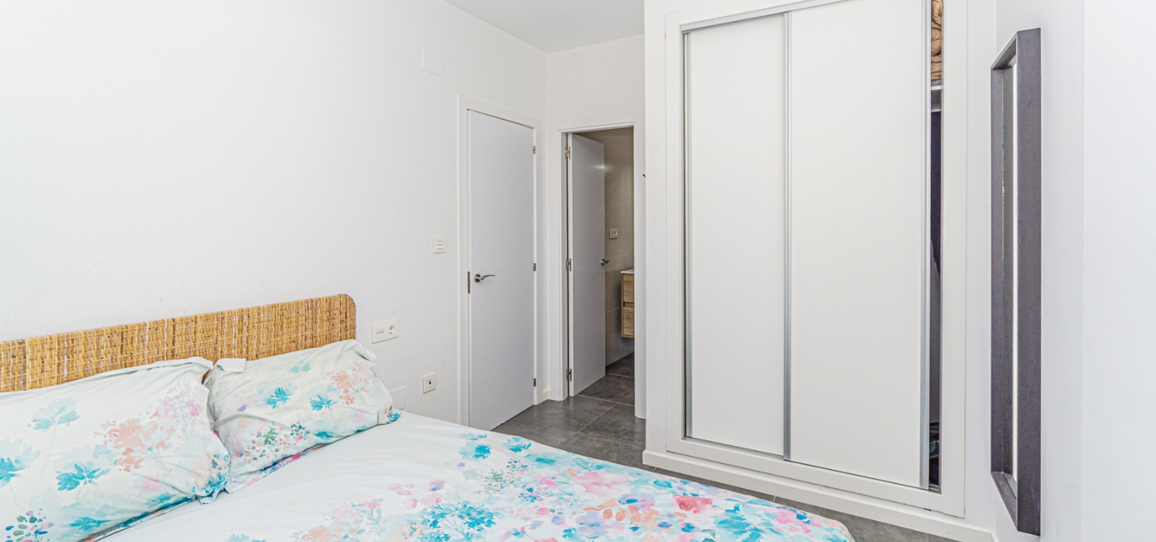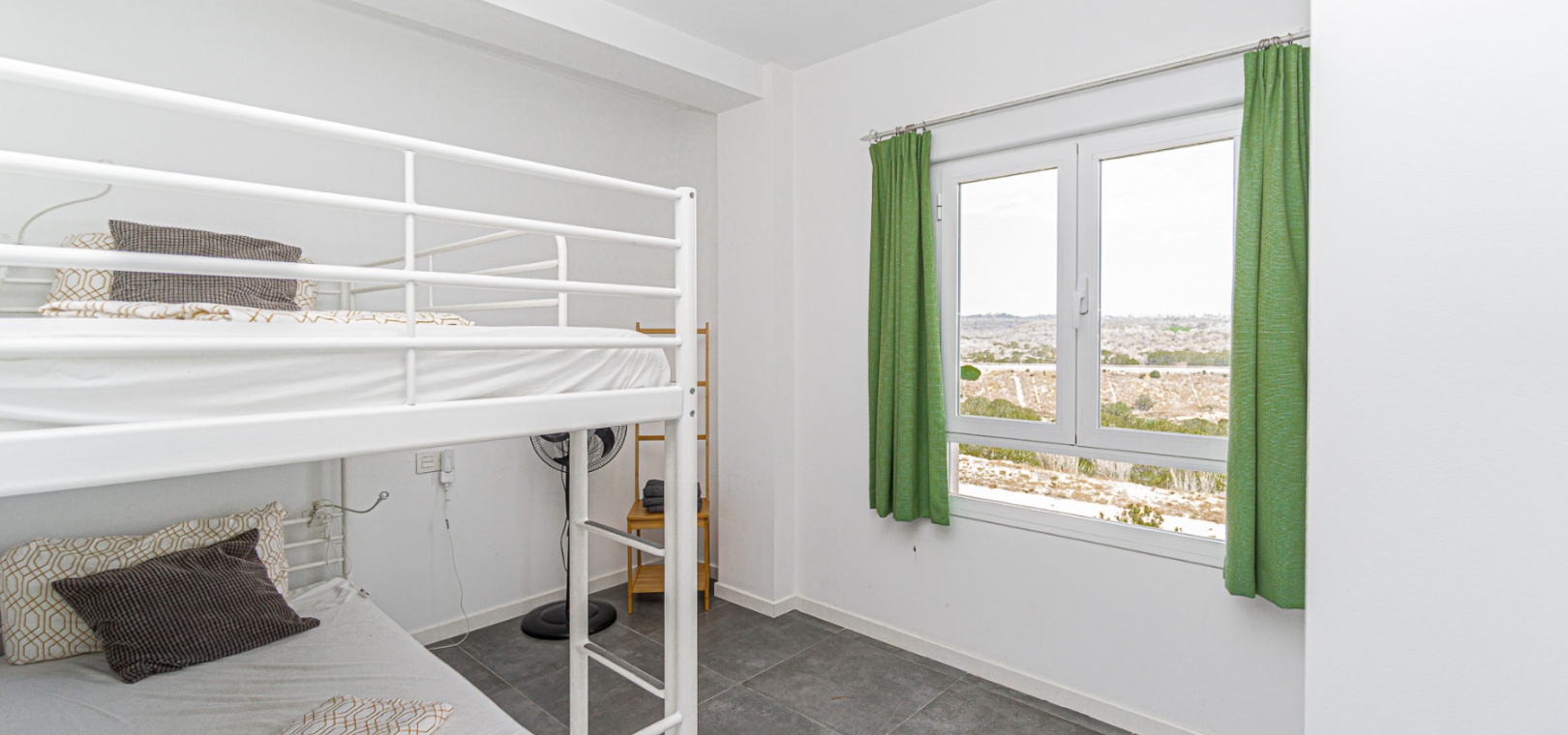 Der Grundriss ist praktisch und komfortabel. Rechts vom Eingang befinden sich zwei geräumige Schlafzimmer, beide mit herrlichem Blick auf die Rambla von Campoamor sowie auf die Golfplätze Las Ramblas und Campoamor – perfekt für Natur- und Golfliebhaber.