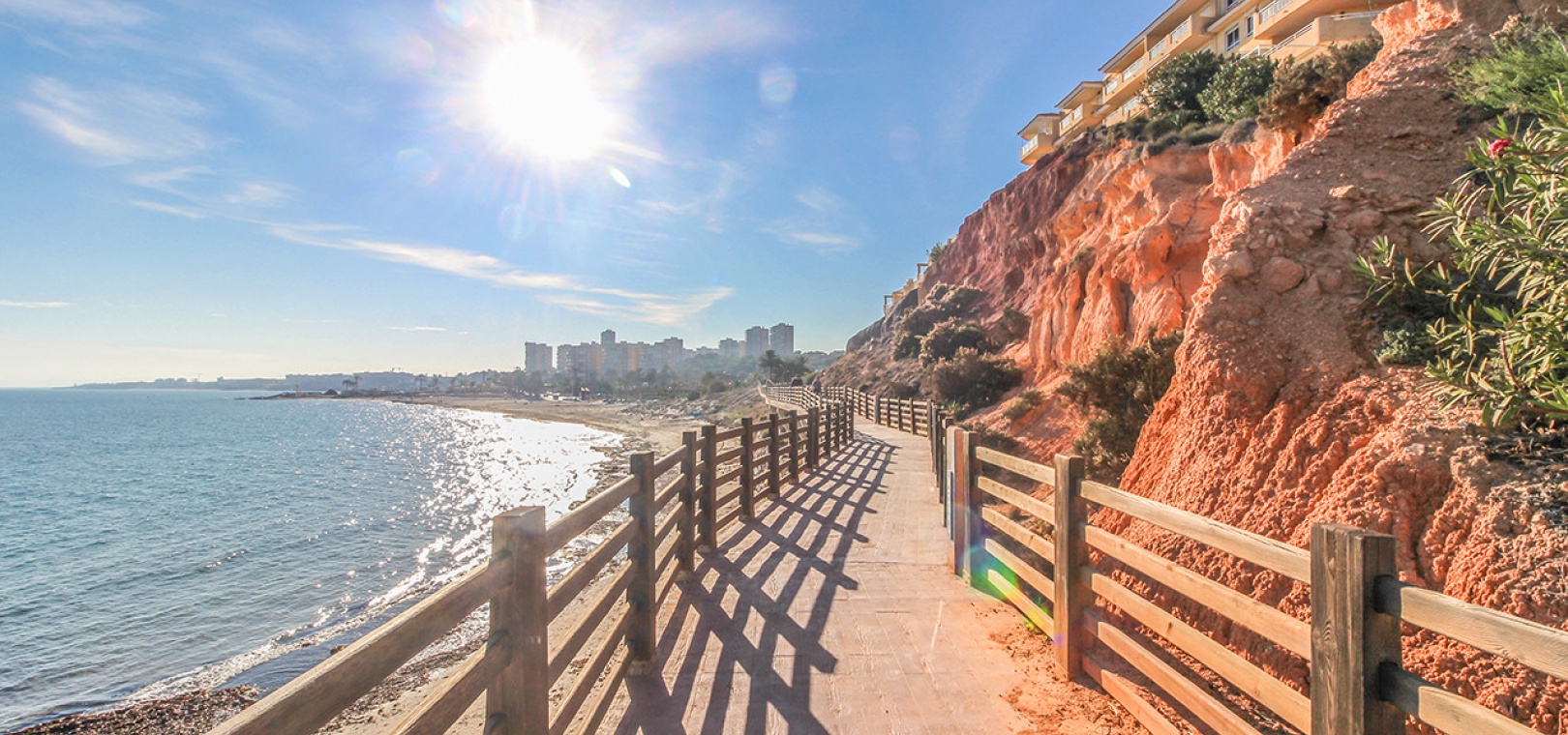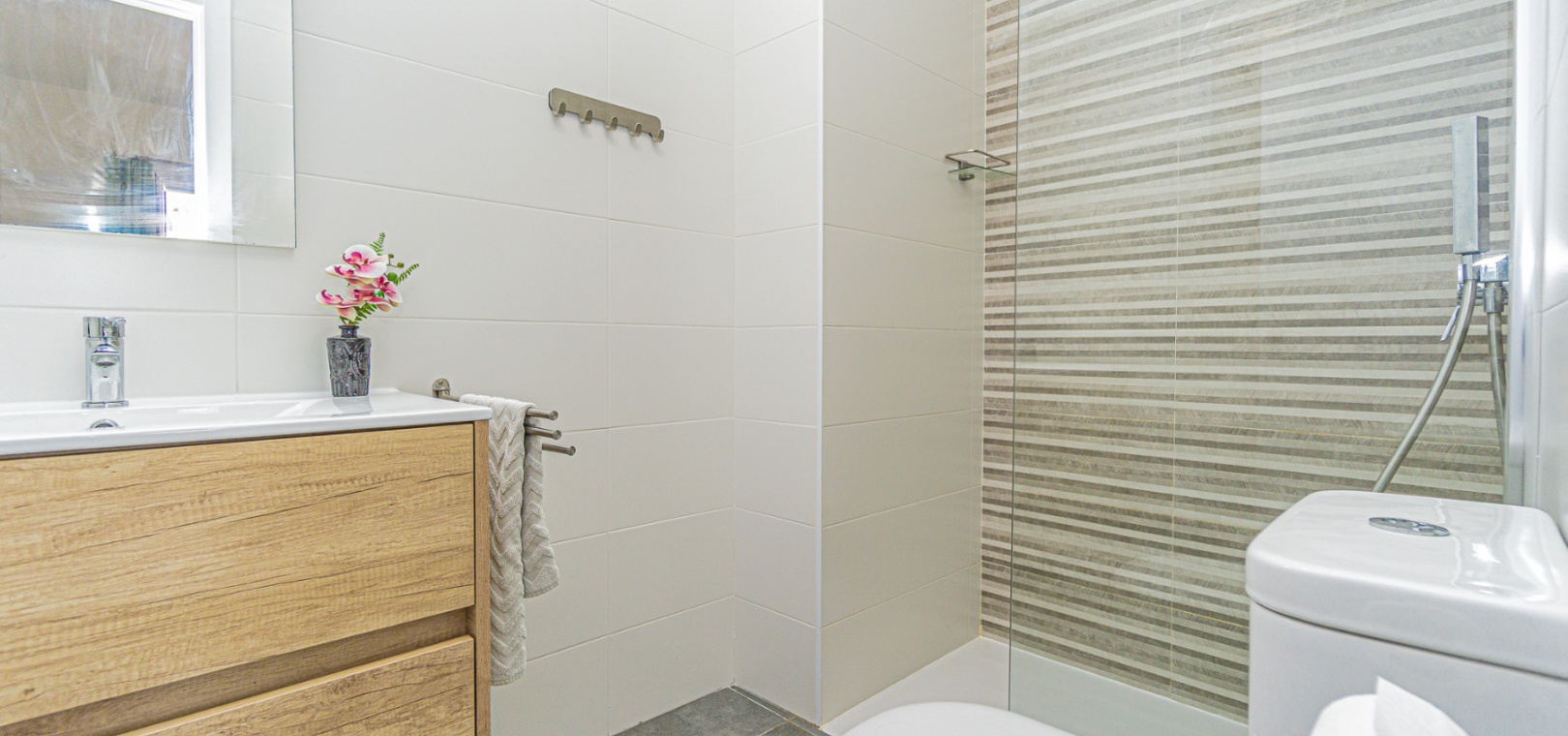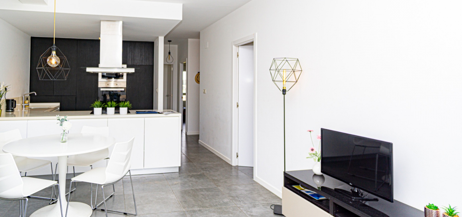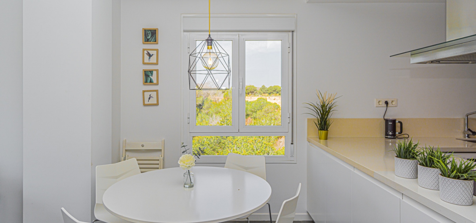 Der Grundriss ist praktisch und komfortabel. Rechts vom Eingang befinden sich zwei geräumige Schlafzimmer, beide mit herrlichem Blick auf die Rambla von Campoamor sowie auf die Golfplätze Las Ramblas und Campoamor – perfekt für Natur- und Golfliebhaber.