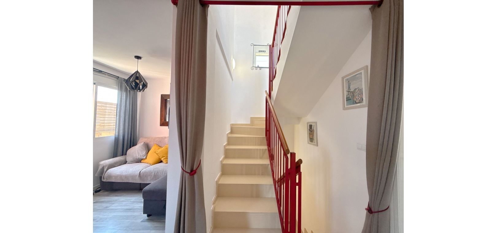 Im Erdgeschoss befinden sich zwei Schlafzimmer, ein Abstellraum und ein stilvolles Badezimmer. Im Obergeschoss befinden sich ein helles Wohnzimmer mit Balkon, eine moderne Küche und ein drittes Schlafzimmer.