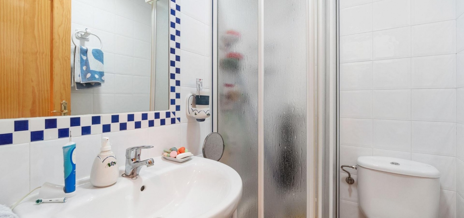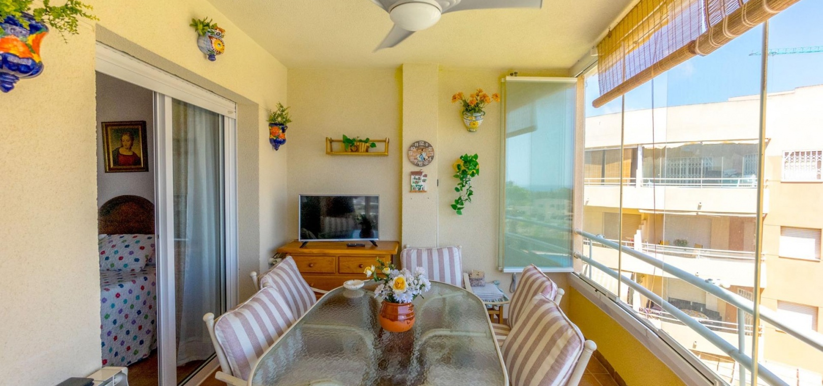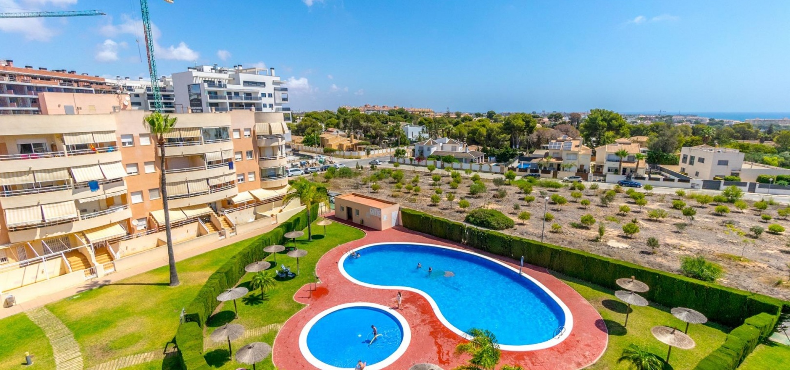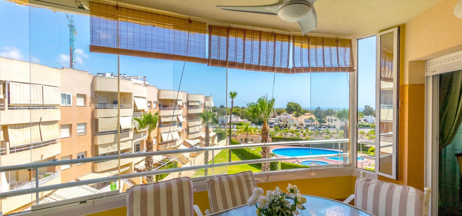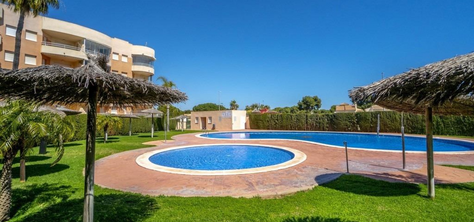 Das Anwesen hat eine Gesamtfläche von 100 m² und verfügt über 3 Schlafzimmer und 2 Badezimmer, eine separate Küche und eine große Terrasse mit Blick auf den Gemeinschaftspool und das Meer.