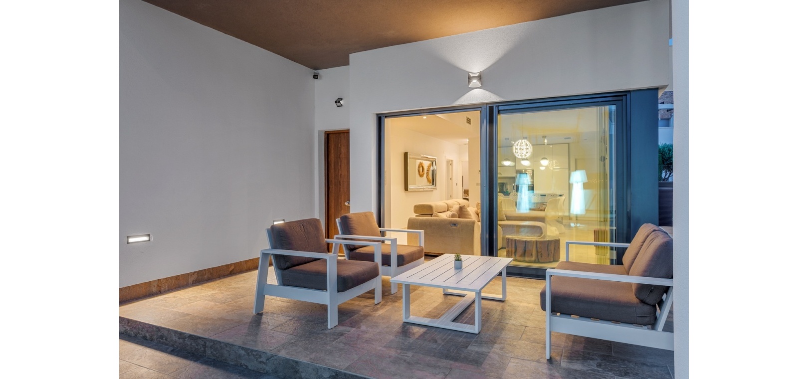 Drei geräumige Schlafzimmer mit Einbauschränken. Zwei komplette Badezimmer, darunter ein Hauptbadezimmer en suite. Offene Küche mit Ess- und Wohnbereich mit Zugang zur Terrasse und zum Pool. Separater Waschraum für zusätzlichen Komfort. Kanalklimaanlage, Solarmodule und hochwertige Oberflächen.