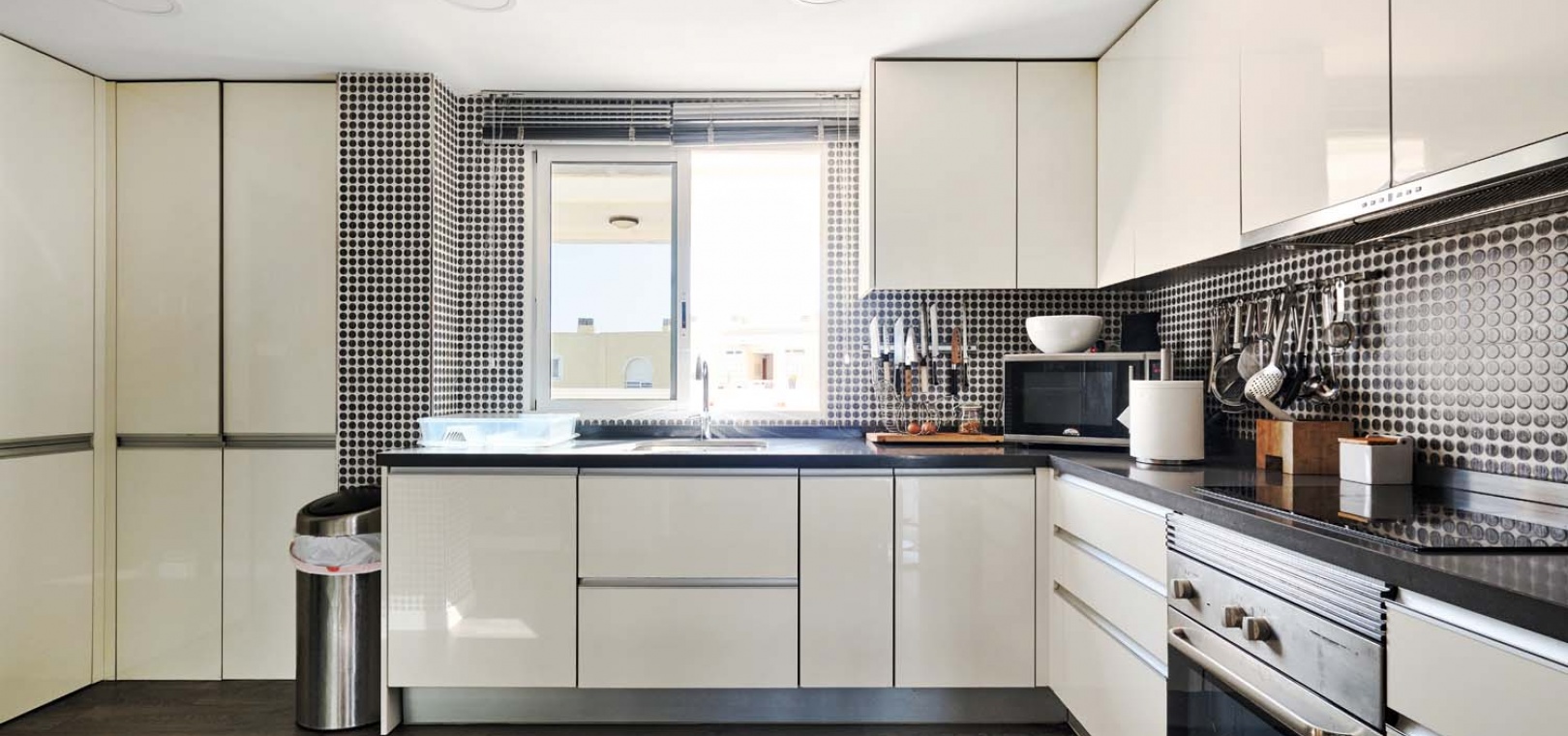 Der Eingangsbereich führt in eine moderne, voll ausgestattete Küche mit viel Stauraum, integrierten Geräten, darunter ein Weinkühlschrank, und einer Frühstücksbar, die sich ideal für ein entspanntes Essen eignet. Das Wohn-/Esszimmer ist hell und geräumig und verfügt über Terrassentüren, die auf eine Terrasse mit Sitz- und Essbereich, Markise und freiem Meerblick führen.