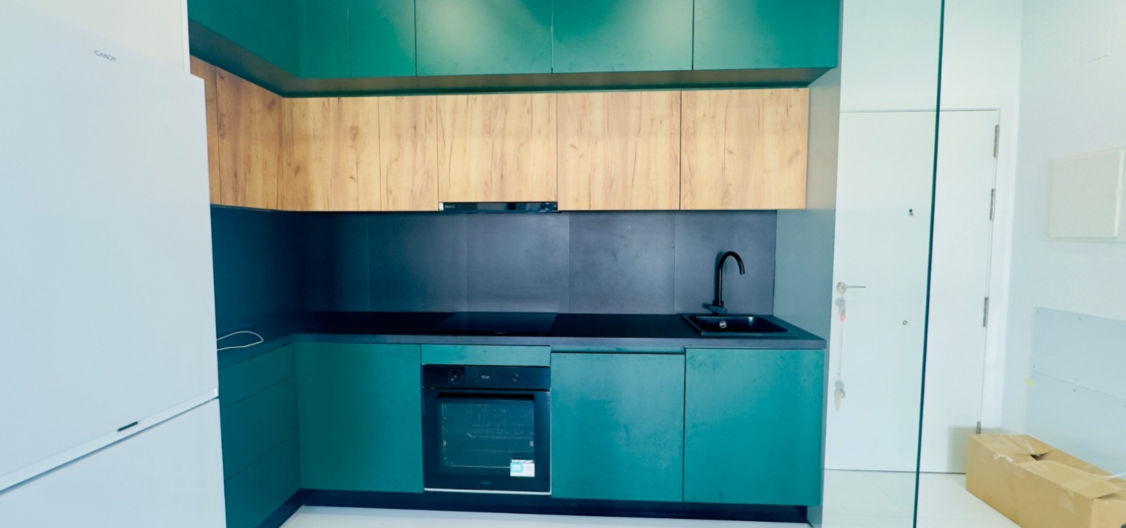 Komplett eingerichtete Küche mit Dunstabzugshaube und Induktionskochfeld.