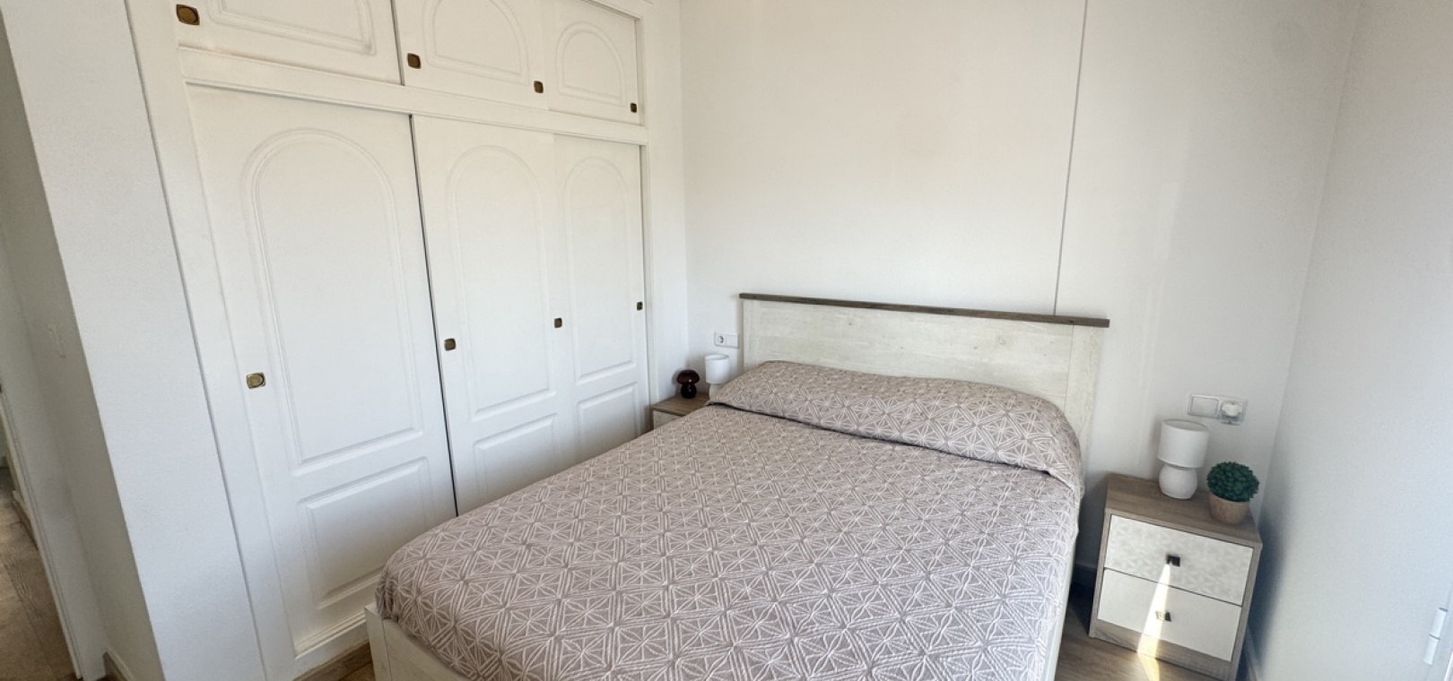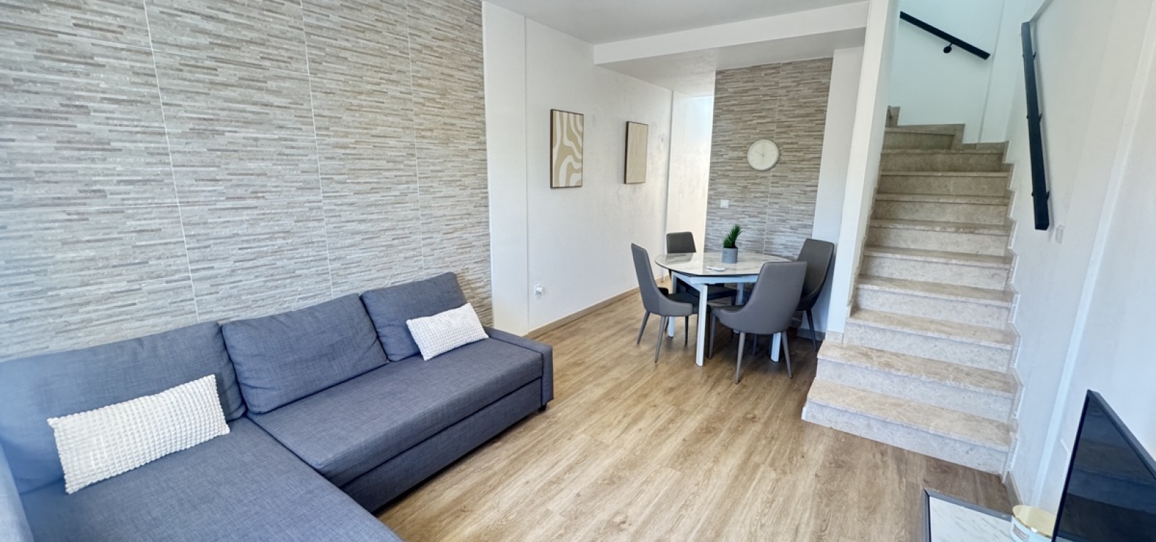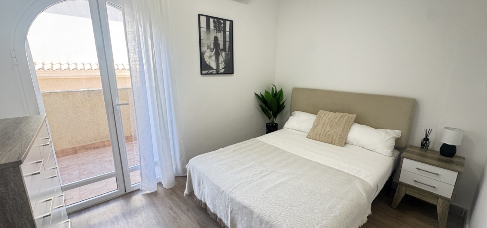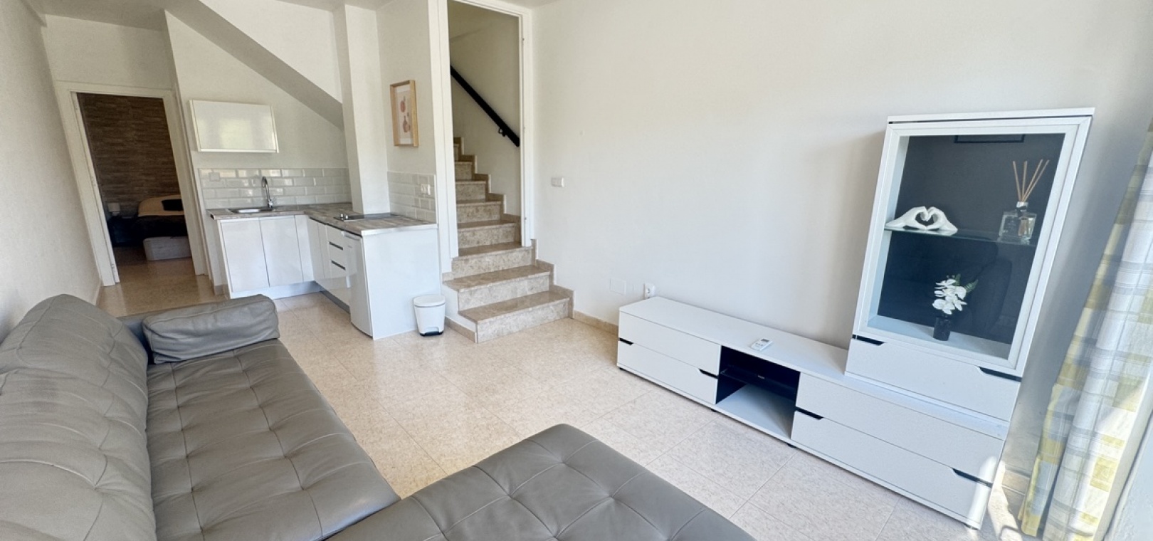 Drei Wohnebenen – flexible Aufteilung für Familie oder Gäste Option für ein abgeschlossenes Apartment im Untergeschoss mit Schlafzimmer, Küche, Bad und Wohnzimmer – ideal für Besucher oder zur Vermietung Moderne, voll ausgestattete Küche im mittleren Stockwerk, offen zum Wohnzimmer Zwei Schlafzimmer im Obergeschoss , eines davon mit direktem Zugang zum Balkon und zum privaten Solarium auf dem Dach Gemeinschaftspool zu Fuß erreichbar Sofort bezugsfertig – sofortiger Bezug möglich